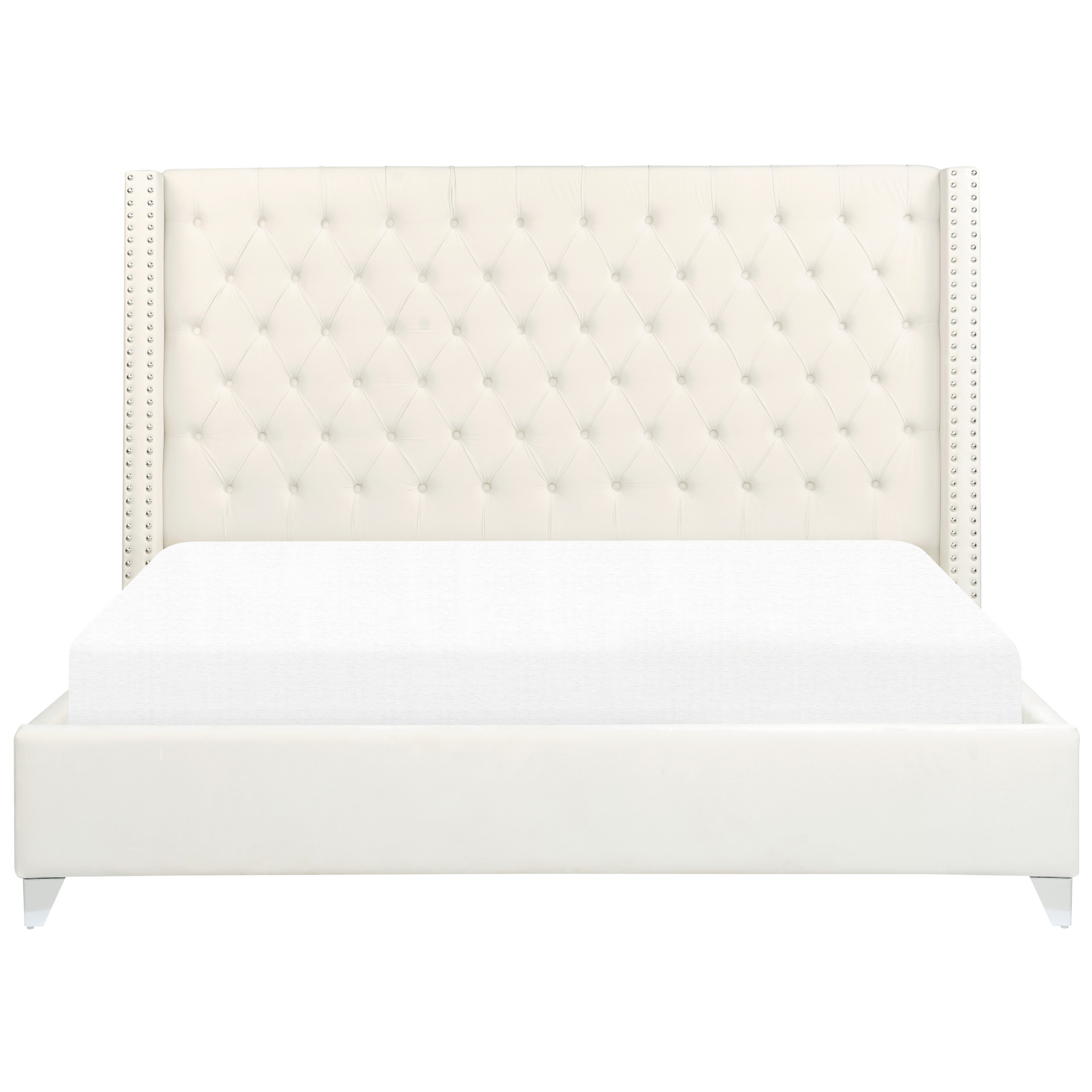 Tyylikäs nappikoristeltu parisänky. Tuo makuuhuoneeseen ripaus glamouria tällä ylellisellä sängynrungolla. Sänky yhdistää vintage-muotoilun saumattomasti moderneihin vaikutteisiin, minkä ansiosta se sopii erinomaisesti sekä nykyaikaisiin että retrotyylisiin sisustuksiin. Kestävä puinen runko on verhoiltu luonnonvalkoisella samettikankaalla. Sängynpäätyä koristavat klassinen mutta tyylikäs nappituftaus sekä verhoilunaulat.