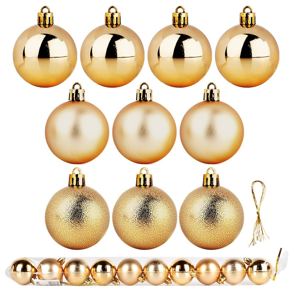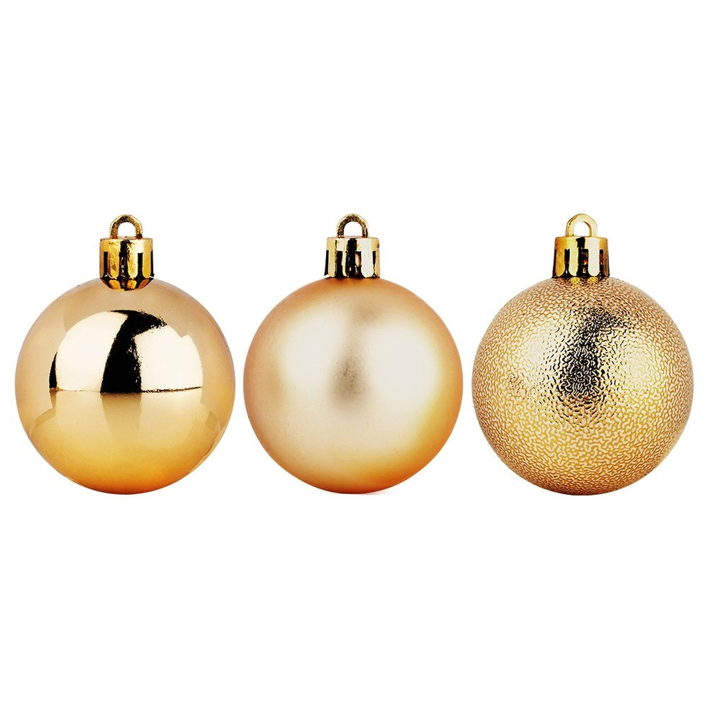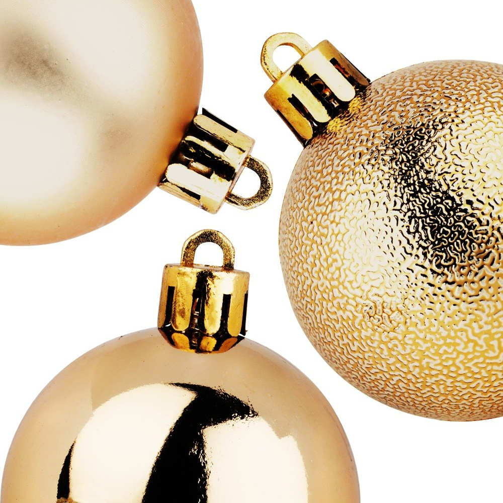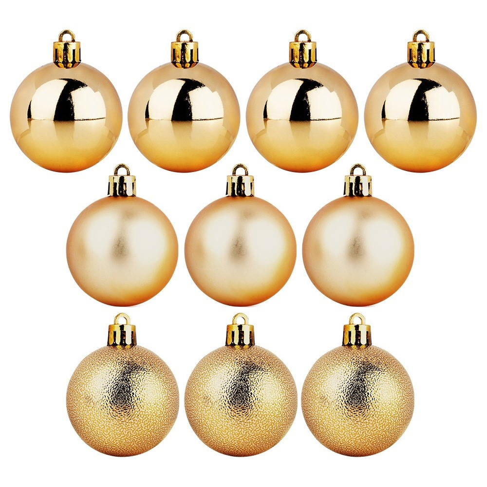 10 joulukuusenpallon setti - 10 kultaisen pallon setti, joka lisää klassista kimallusta mihin tahansa joulukuuseen ja luo taianomaisen tunnelman kotiisi. Kunkin pallon halkaisija on 5 cm. Setti sisältää kultaisia palloja kiiltävässä, mattapintaisessa ja teksturoituna viimeistelyssä. Ripustusnauhat sisältyvät myös pakkaukseen.