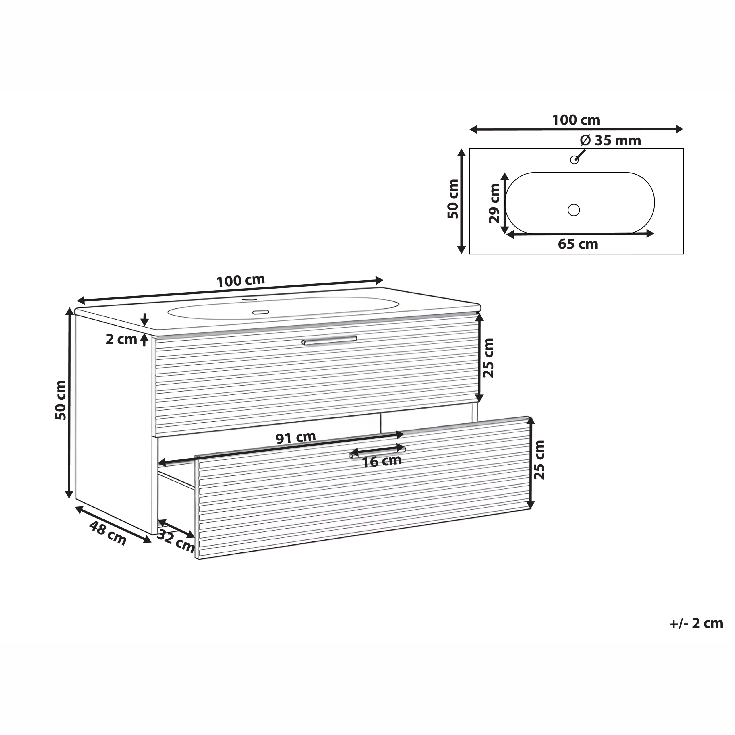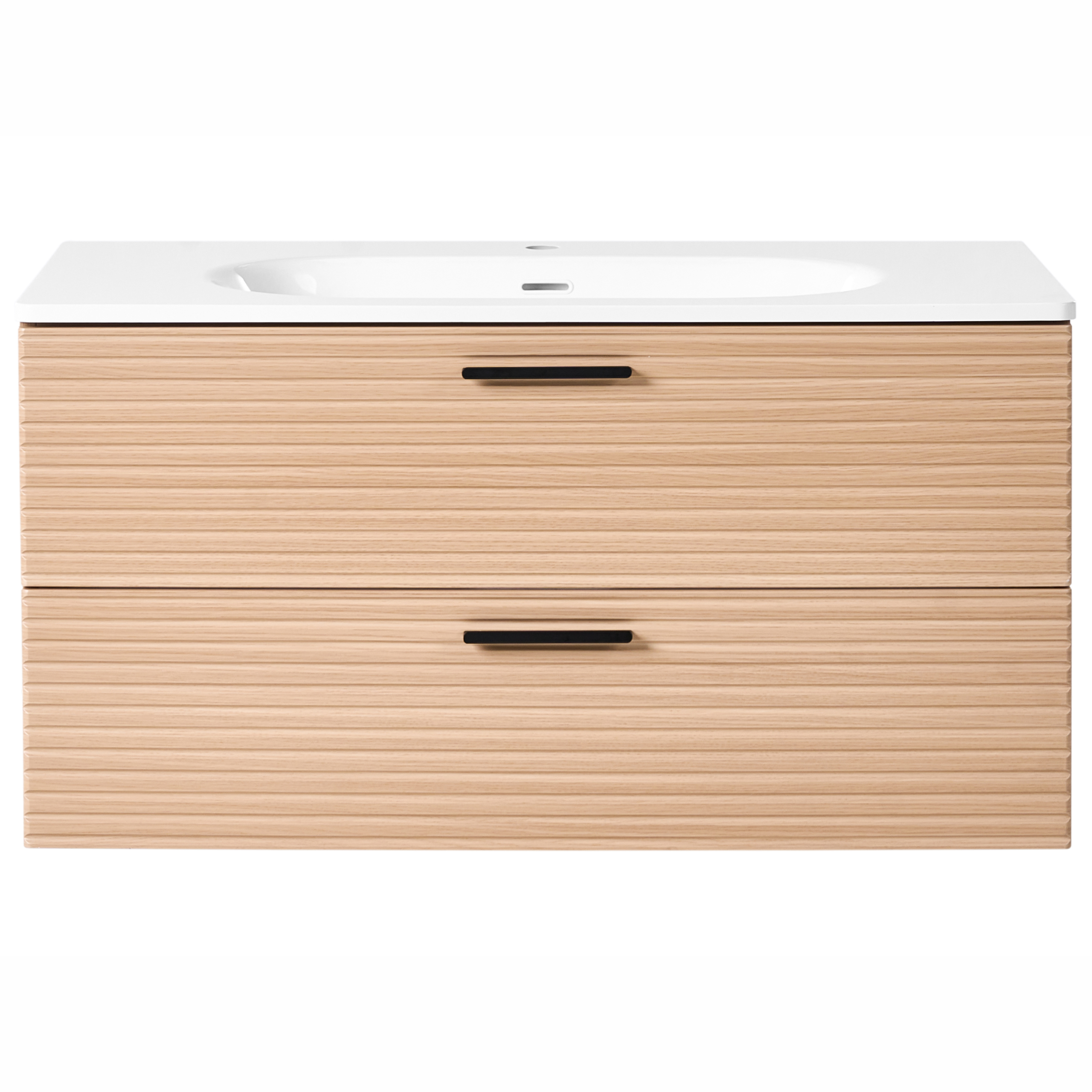 Tyylikäs uurrettu allaskaappi laatikoilla. Tämä seinäallaskaappi on elegantti ja käytännöllinen ratkaisu moderneihin kylpyhuoneisiin. Kaappi yhdistää tyylin ja toiminnallisuuden – siinä on uurretut etuosat, mustat vetimet, sisäänrakenneutut hanareiät ja ylivuotosuojaus. Sen kaksi tilavaa laatikkoa tarjoavat runsaansti säilytystilaa välttämättömille tarvikkeille, ja leveä pesuallas helpottaa päivittäisiä rutiineja. Täydellinen valinta mihin tahansa kylpyhuoneeseen.