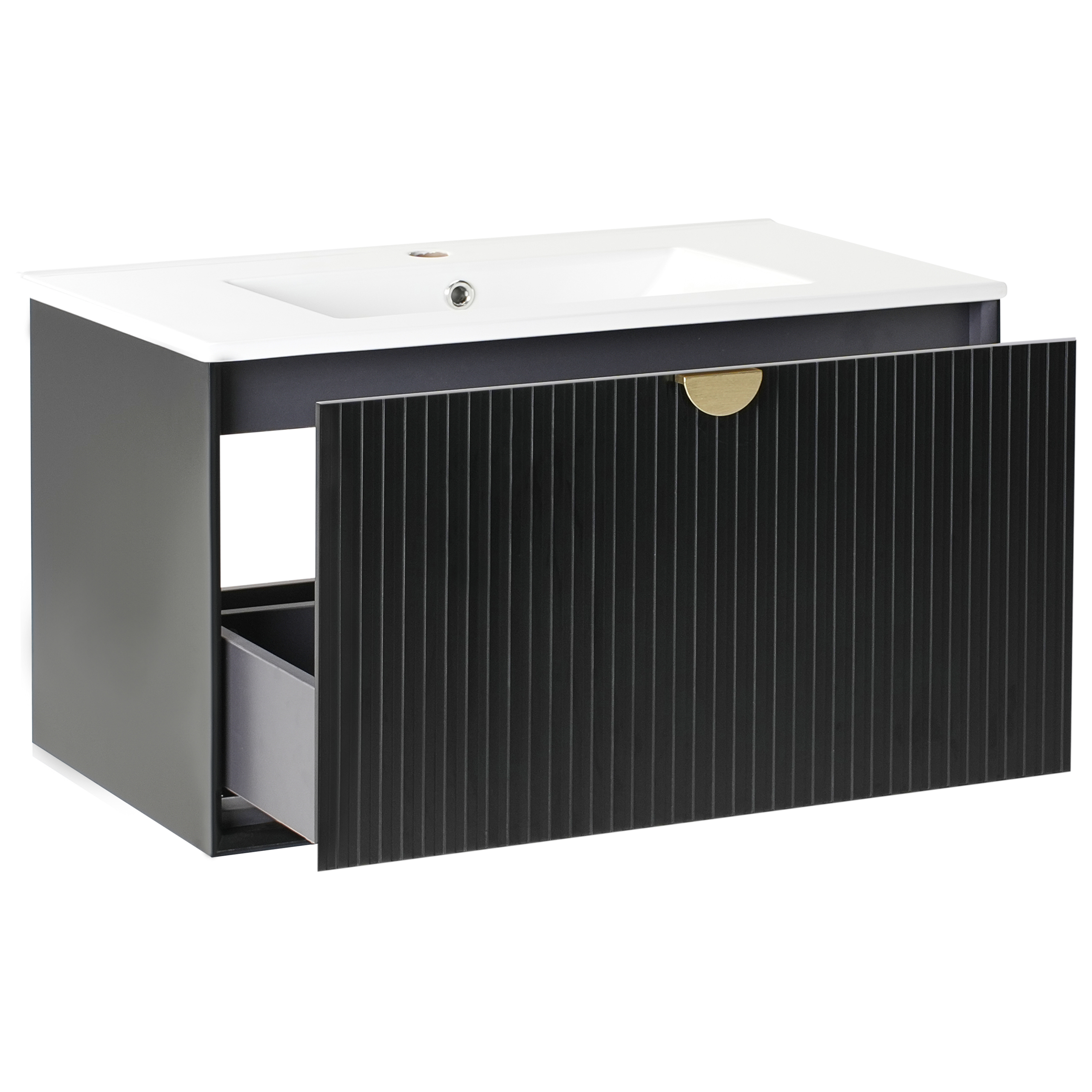 Seinään kiinnitettävä allaskaappi laatikolla. Lisää kylpyhuoneeseen hienostunutta ilmettä tällä kompaktilla seinään asennettavalla allaskaapilla, jossa on integroitu keraaminen pesuallas. Se on valmistettu laadukkaasta MDF-levystä, jossa on lakattu pinta, minkä ansiosta se kestää päivittäistä käyttöä. Pehmeästi sulkeutuva laatikko tarjoaa kätevän säilytyspaikan ja auttaa pitämään tarvikkeet järjestyksessä sekä poissa näkyvistä. Kaapissa on uurrettu etuosa ja kullanvärinen kahva, jotka luovat koristeellisen, modernin ulkonäön. Se yhdistää vaivattomasti toiminnallisuuden ja tyylin ja sopii saumattomasti nykyaikaisiin sisustuksiin.