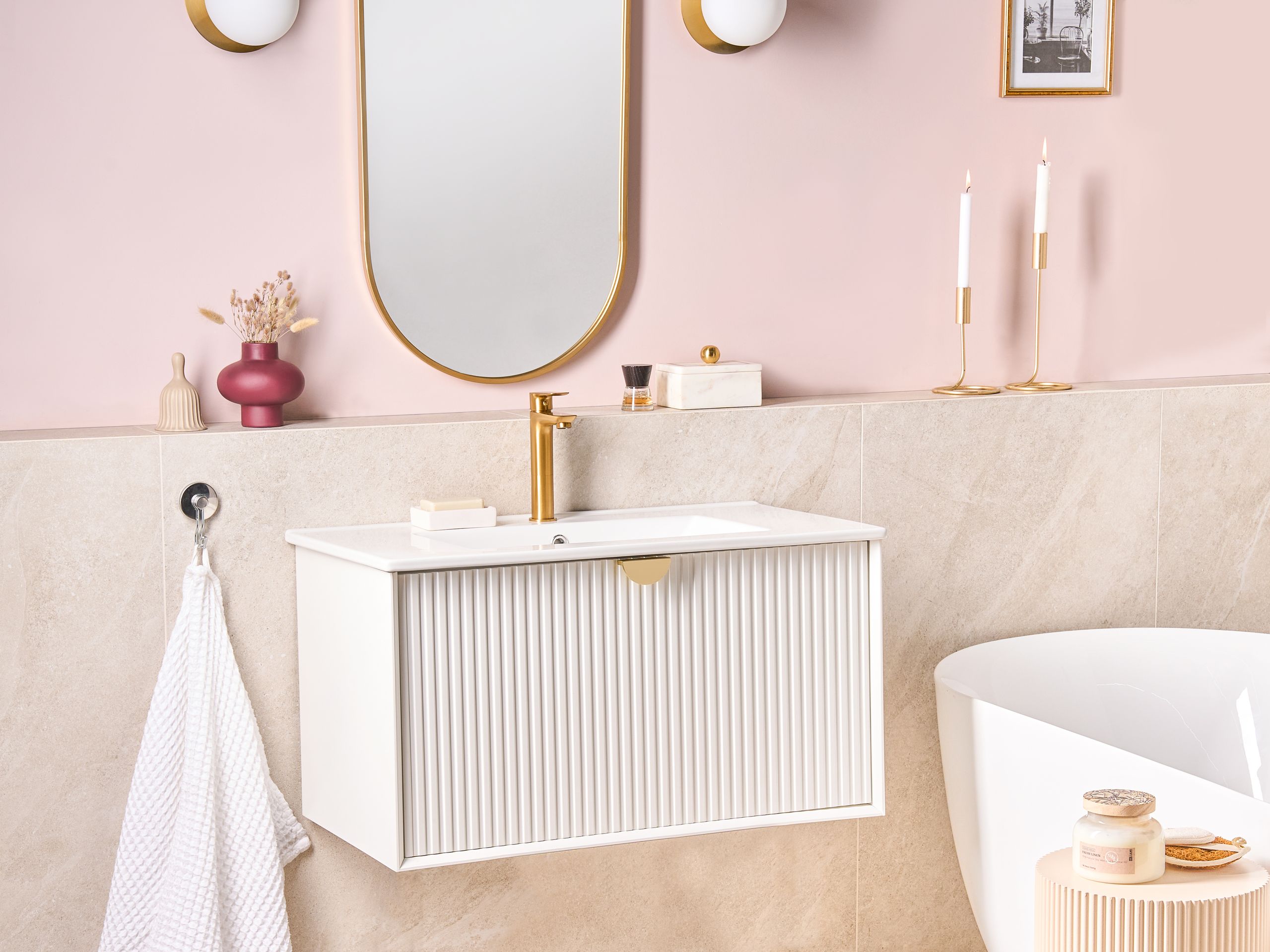 Seinään kiinnitettävä allaskaappi laatikolla. Lisää kylpyhuoneeseen hienostunutta ilmettä tällä kompaktilla seinään asennettavalla allaskaapilla, jossa on integroitu keraaminen pesuallas. Se on valmistettu laadukkaasta MDF-levystä, jossa on lakattu pinta, minkä ansiosta se kestää päivittäistä käyttöä. Pehmeästi sulkeutuva laatikko tarjoaa kätevän säilytyspaikan ja auttaa pitämään tarvikkeet järjestyksessä sekä poissa näkyvistä. Kaapissa on uurrettu etuosa ja kullanvärinen kahva, jotka luovat koristeellisen, modernin ulkonäön. Se yhdistää vaivattomasti toiminnallisuuden ja tyylin ja sopii saumattomasti nykyaikaisiin sisustuksiin.