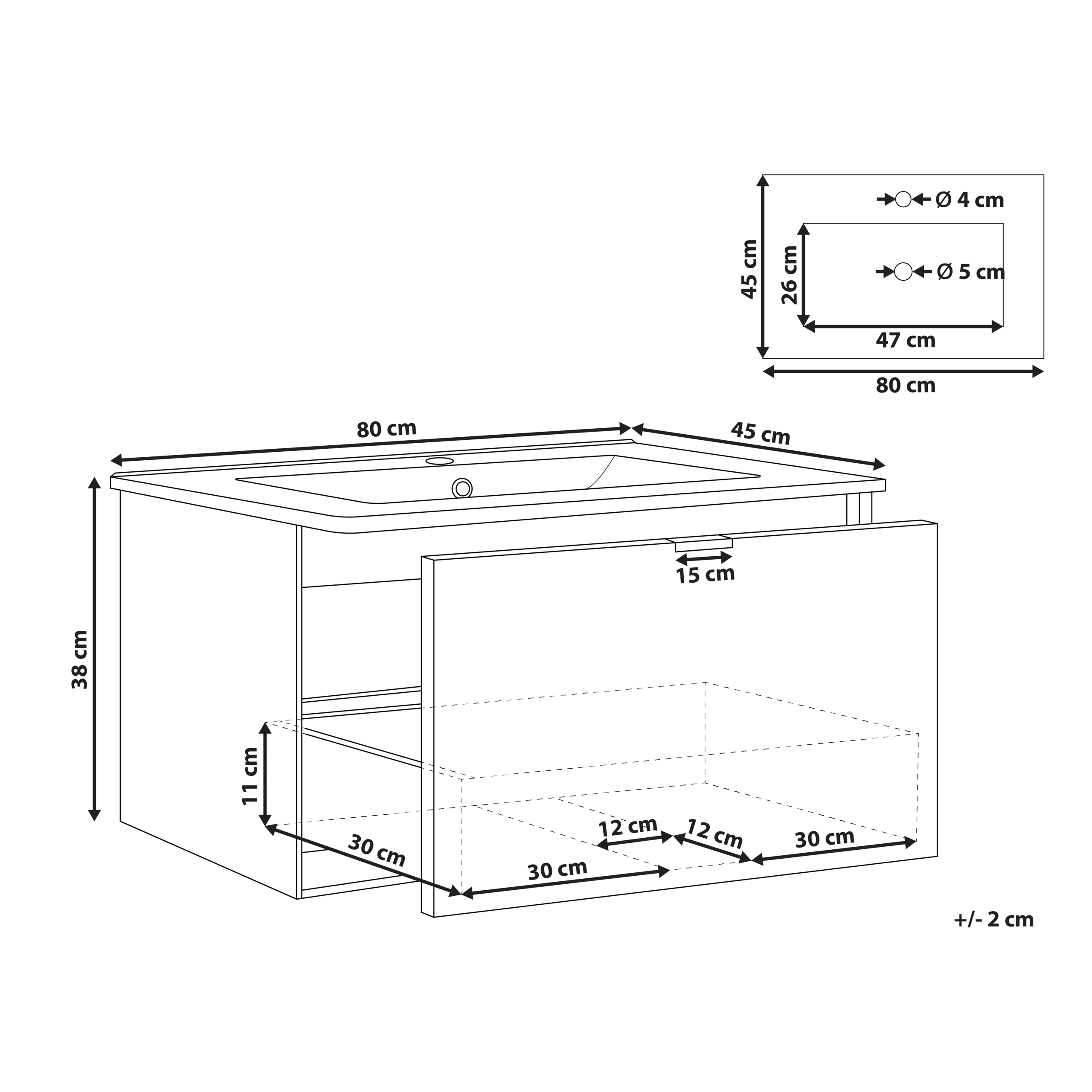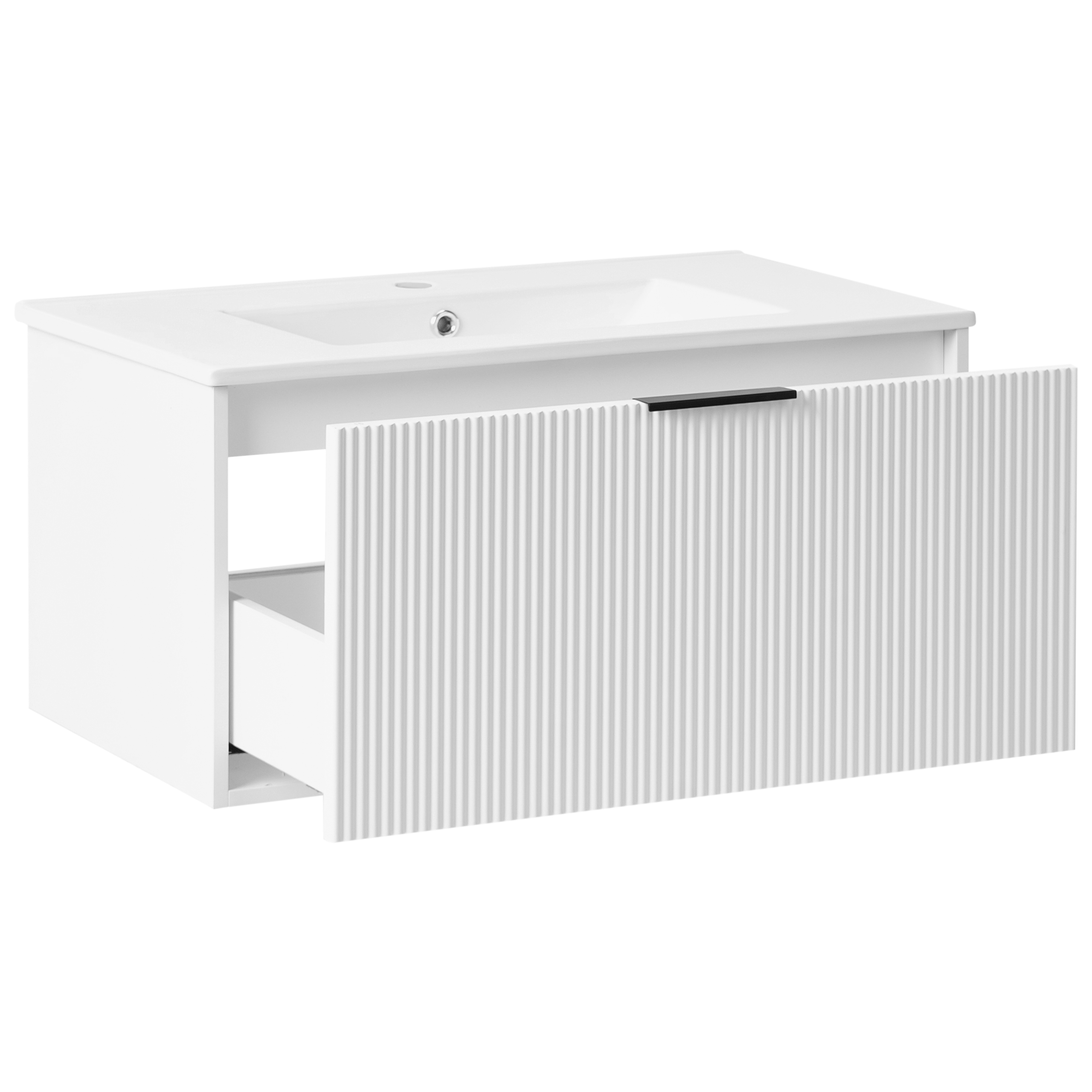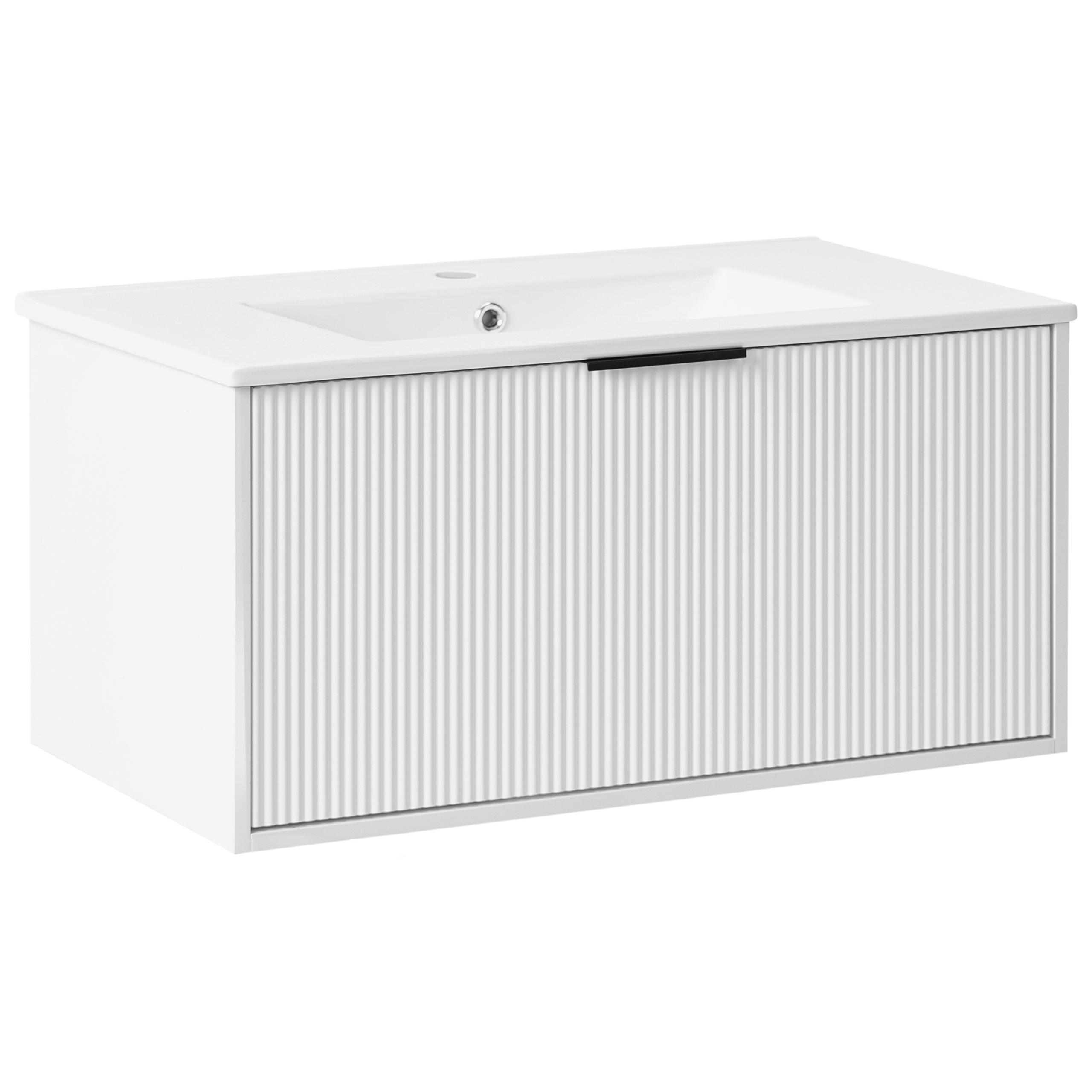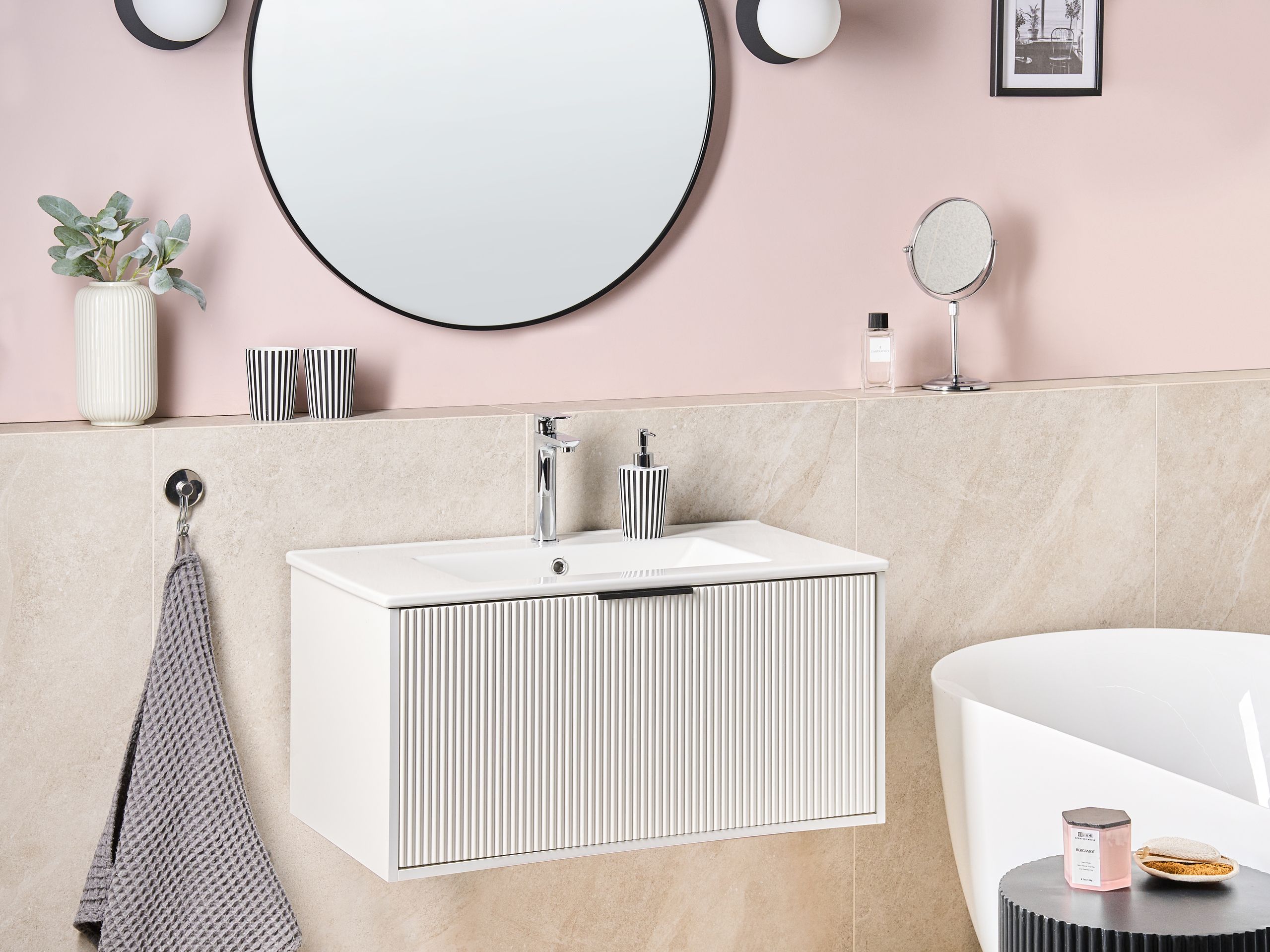 Seinään kiinnitettävä allaskaappi uurteilla. Päivitä kylpyhuonetta tällä seinään kiinnitettävällä allaskaapilla, jossa on sisäänrakennettu pesuallas. Helppohoitoisesta MDF-levystä valmistetussa kaapissa on uurrettu etuosa, minkä ansiosta se yhdistää kestävyyden ja minimalistisen estetiikan. Laadukas keraaminen pesuallas tarjoaa puhtaan ja käytännöllisen pesupinnan. Pehmeästi sulkeutuva laatikko liukuu sujuvasti, ja sen eri lokerot sopivat erinomaisesti monenlaisten tarvikkeiden säilyttämiseen ja tilan järjestyksen ylläpitämiseen.