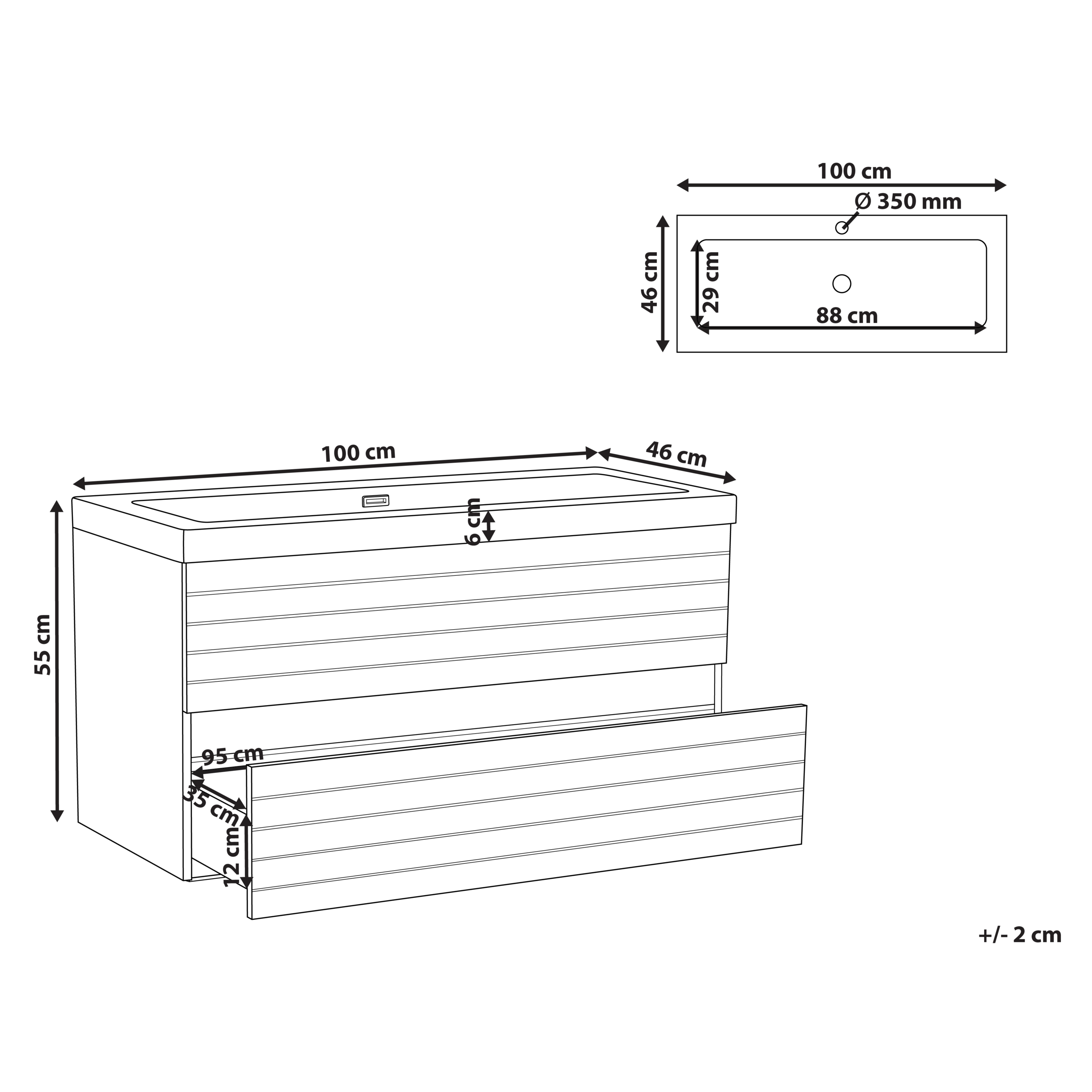 Kätevä kaappi pesualtaalla ja laatikoilla. Tämä moderni seinään kiinnitettävä allaskaappi pesualtaalla on käytännöllinen valinta jokaiseen kylpyhuoneeseen. Kaksi pehmeästi sulkeutuvaa, tilavaa laatikkoa tarjoavat paikan jokapäiväisille tarvikkeille. Vaaleanruskea, puuta imitoiva viimeistely tuo sisustukseen luonnontuntua ja sulautuu saumattomasti sekä nykyaikaisiin että skandinaavisiin tiloihin. Allaskaappi on valmistettu kestävästä MDF-levystä, joka kestää kosteutta ja on helppo ylläpitää. Valkoisessa hartsitasossa on sisäänrakennettu suorakulmainen pesuallas ylivuotoaukolla ja hanareikä. Se on toimiva ja tyylikäs lisä, joka on suunniteltu vastaamaan kiireisen kotitalouden tarpeita ja säilyttämään samalla siistin, elegantin ilmeen.