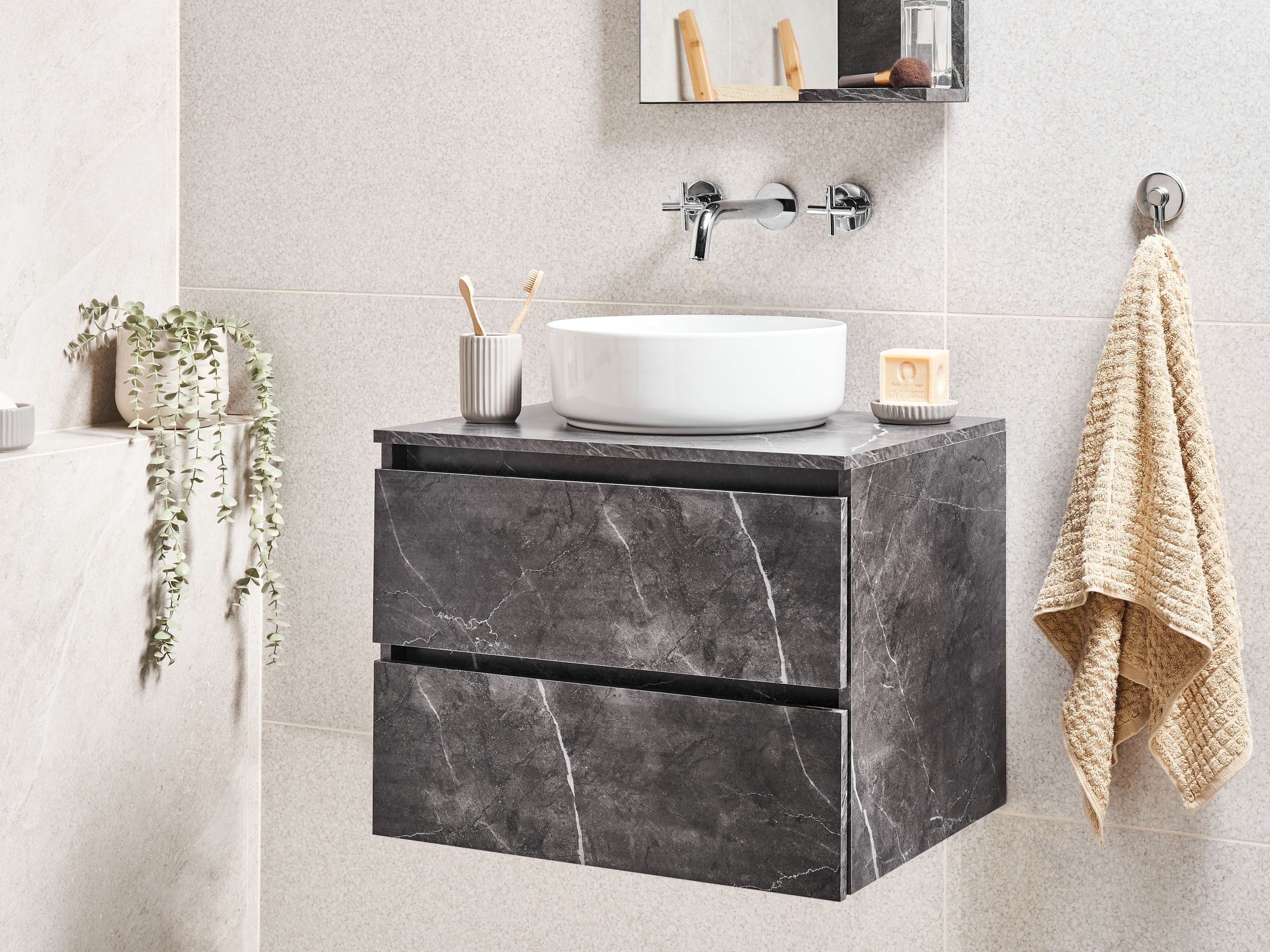 Moderni kylpyhuoneen allaskaappi vetolaatikoilla. Kohota kylpyhuonettasi tällä modernilla ja käytännöllisellä seinäallaskaapilla. Tukevasta MDP-levystä valmistetussa allaskaapissa on kaksi syvää laatikkoa, jotka tarjoavat runsaasti säilytystilaa pyyhkeille ja muille välttämättömille tarvikkeille, kun taas musta marmorikuvio lisää tyyliä ja ainutlaatuisuutta. Kestävä taso ja valmiiksi leikatut allasreiät takaavat helpon asennuksen ja tekevät allaskaapista sekä toimivan että tyylikkään. Tämän allaskaapin klassinen muotoilu sopii saumattomasti erilaisiin sisustustyyleihin.