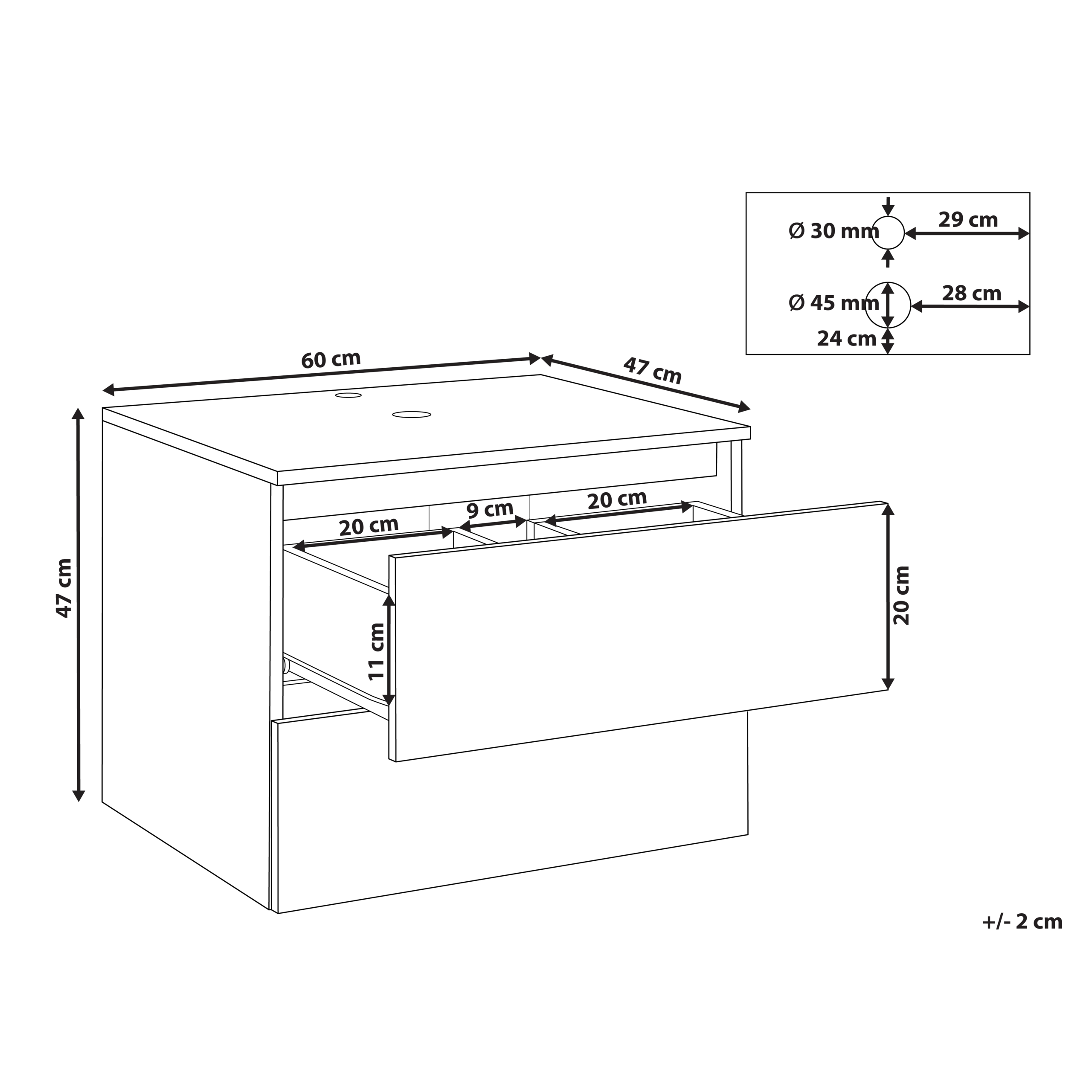 Moderni kylpyhuoneen allaskaappi vetolaatikoilla. Kohota kylpyhuonettasi tällä modernilla ja käytännöllisellä seinäallaskaapilla. Tukevasta MDP-levystä valmistetussa allaskaapissa on kaksi syvää laatikkoa, jotka tarjoavat runsaasti säilytystilaa pyyhkeille ja muille välttämättömille tarvikkeille, kun taas klassinen valkoinen väri lisää tyyliä ja ainutlaatuisuutta. Kestävä taso ja valmiiksi leikatut allasreiät takaavat helpon asennuksen ja tekevät allaskaapista sekä toimivan että tyylikkään. Tämän allaskaapin klassinen muotoilu sopii saumattomasti erilaisiin sisustustyyleihin.