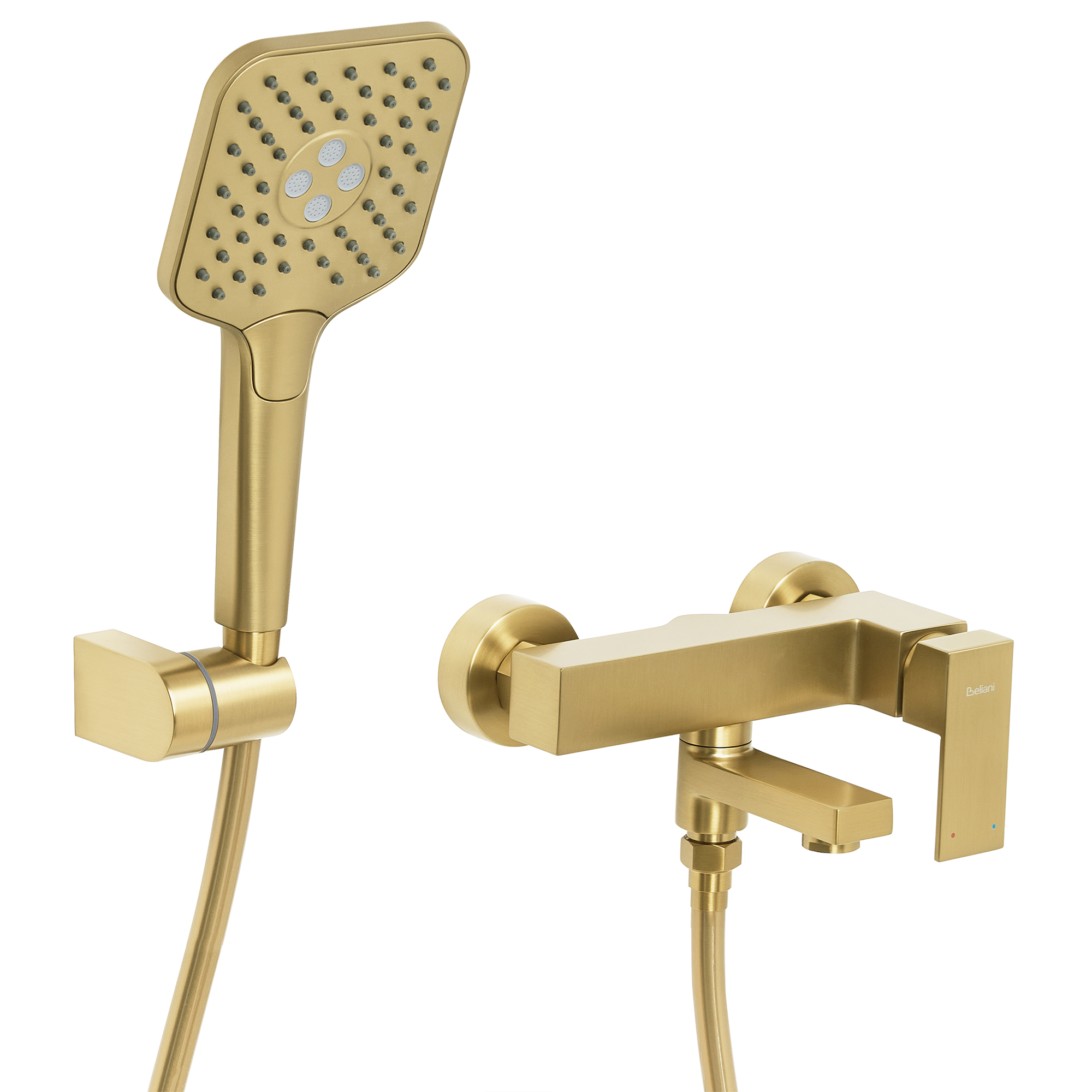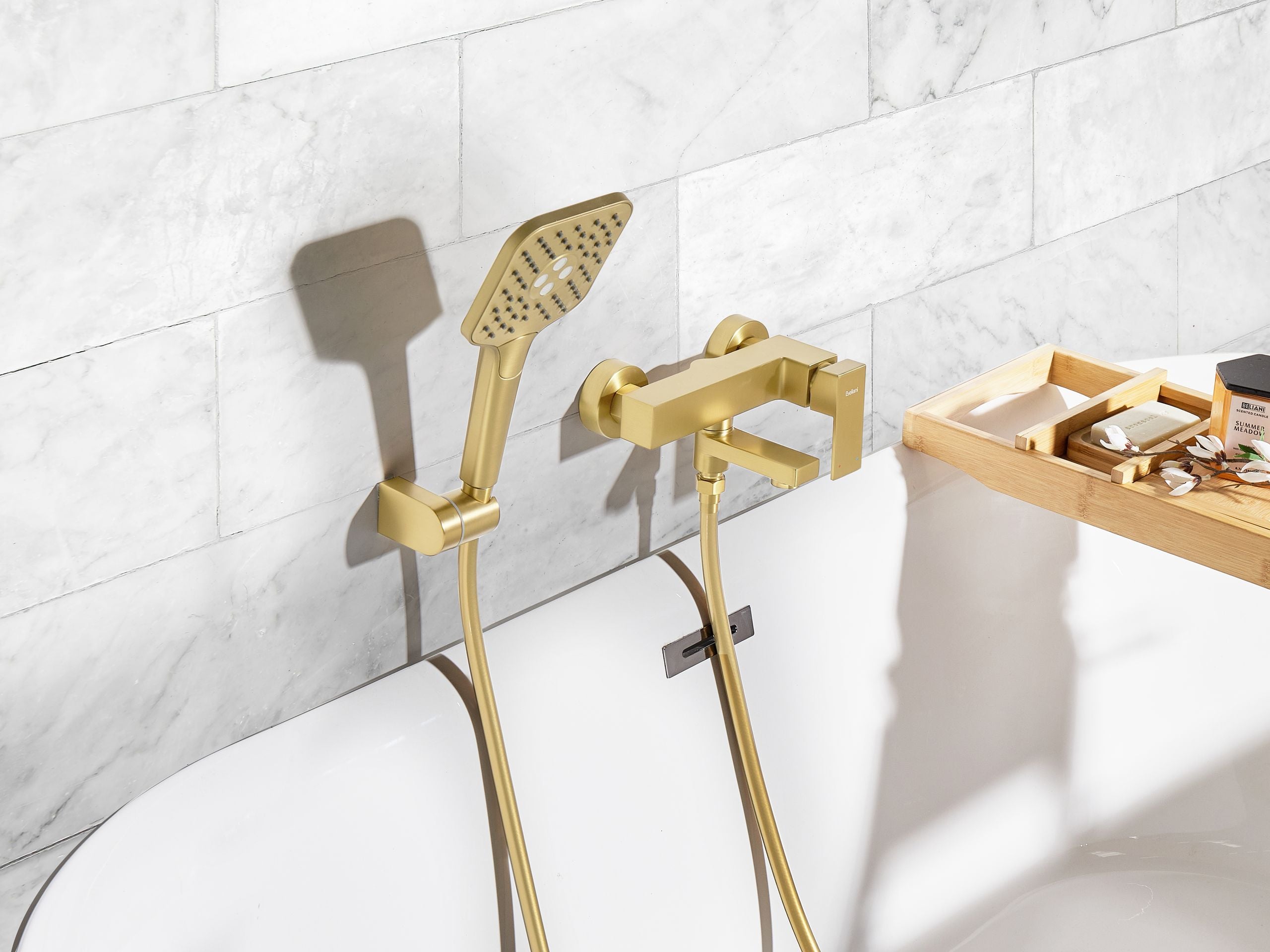 Tyylikäs ammehana käsisuihkulla. Tämä minimalistista ilmettä ja korkeaa toiminnallisuutta yhdistävä, seinään kiinnitettävä amme- ja suihkuhana tuo hienovaraista eleganssia moderniin kylpyhuoneeseen. Yksinkertainen muotoilu pitää tilan siistin näköisenä, kun taas kullanvärinen viimeistely lisää ripauksen ylellisyyttä. Veden virtauksen ja lämpötilan säätely sekä ammehanan ja käsisuihkun välinen vaihto käy helposti, mikä tekee käytöstä nautinnollista. Kestävä messinkirunko takaa pitkäikäisen kestävyyden ja vaivattoman puhdistuksen.