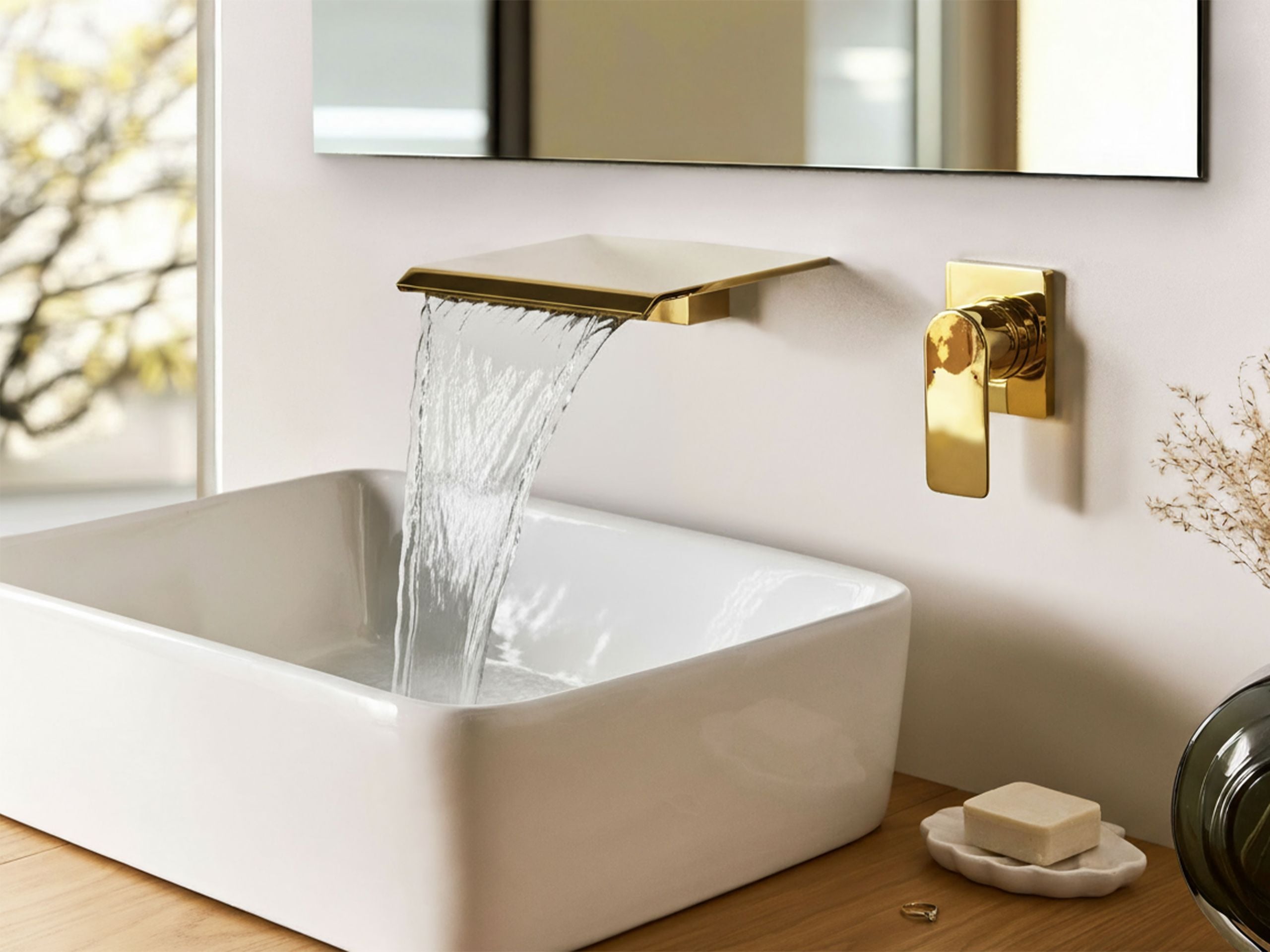 Moderni pesualtaan vesiputoushana. Tuo kylpyhuoneeseesi ripaus nykyaikaista luonnetta tällä tyylikkäällä, kaksiosaisella seinään asennettavalla pesuallashanalla. Kestävästä messingistä valmistetussa hanassa on minimalistinen muotoilu ja yksi vipu, jota on kätevä ja helppo hallita. Vesiputousnokka lisää rauhoittavaa, kylpylätyyppistä vaikutelmaa, joka saa tilan tuntumaan sekä modernilta että tyylikkäältä. Se tarjoaa yksinkertaisen tavan piristää tilaa jollakin, joka näyttää hyvältä ja toimii kauniisti.