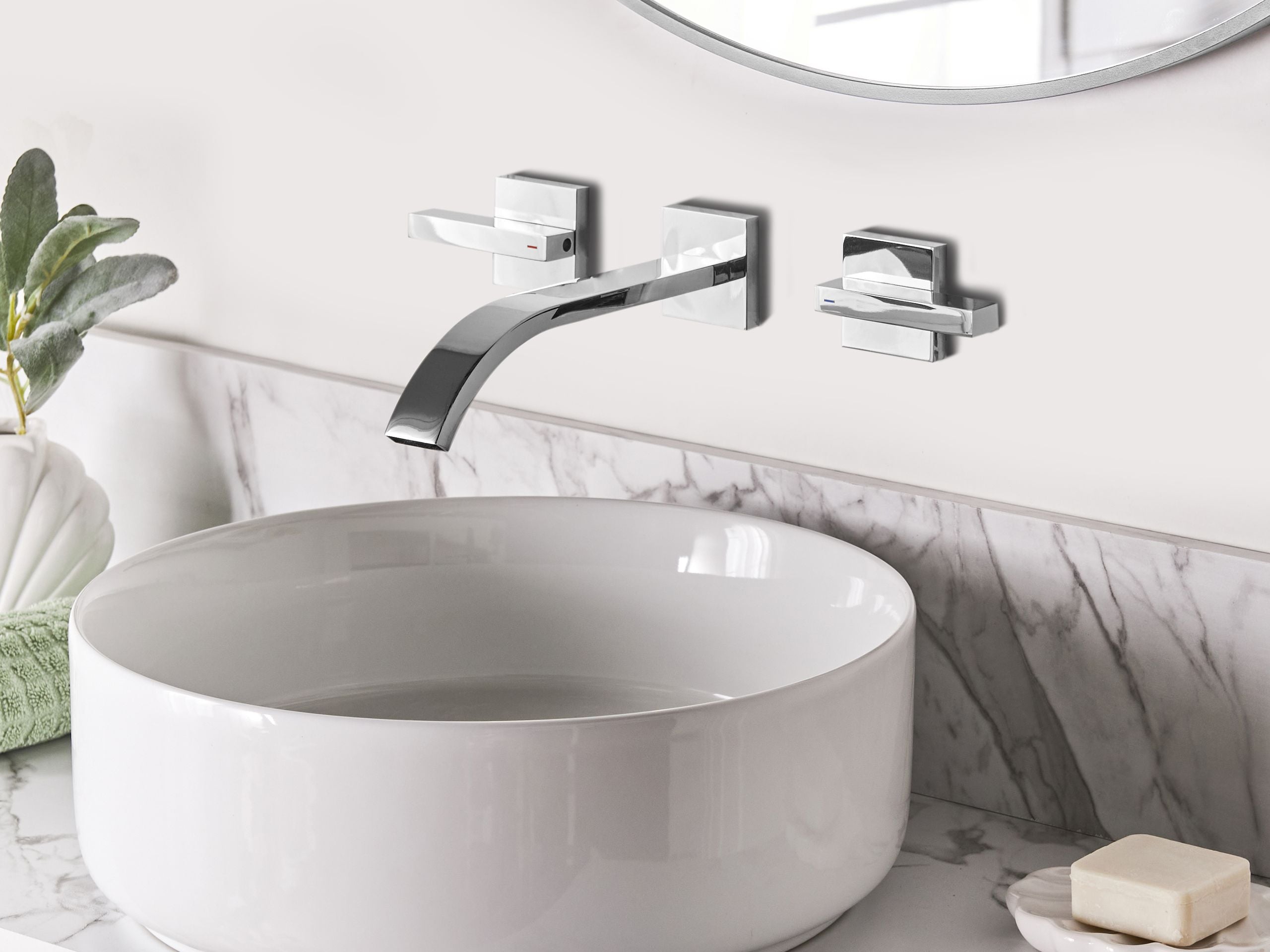 Pesualtaan hana kahdella kahvalla. Tämä seinään asennettava pesuallashana on täydellinen valinta jokaiseen moderniin kylpyhuoneeseen. Kevyesti kaareva nokka ja minimalistinen ulkonäkö tuovat tilaan siistin, nykyaikaisen ilmeen. Kaksivipuinen muotoilu mahdollistaa helpon veden lämpötilan säädön, mikä tekee hanasta yhtä toimivan kuin tyylikkään. Se on valmistettu korkealaatuisesta messingistä, joten se on tehty kestämään ja tuo hienostuneen lisän kylpyhuoneen sisustukseen.
