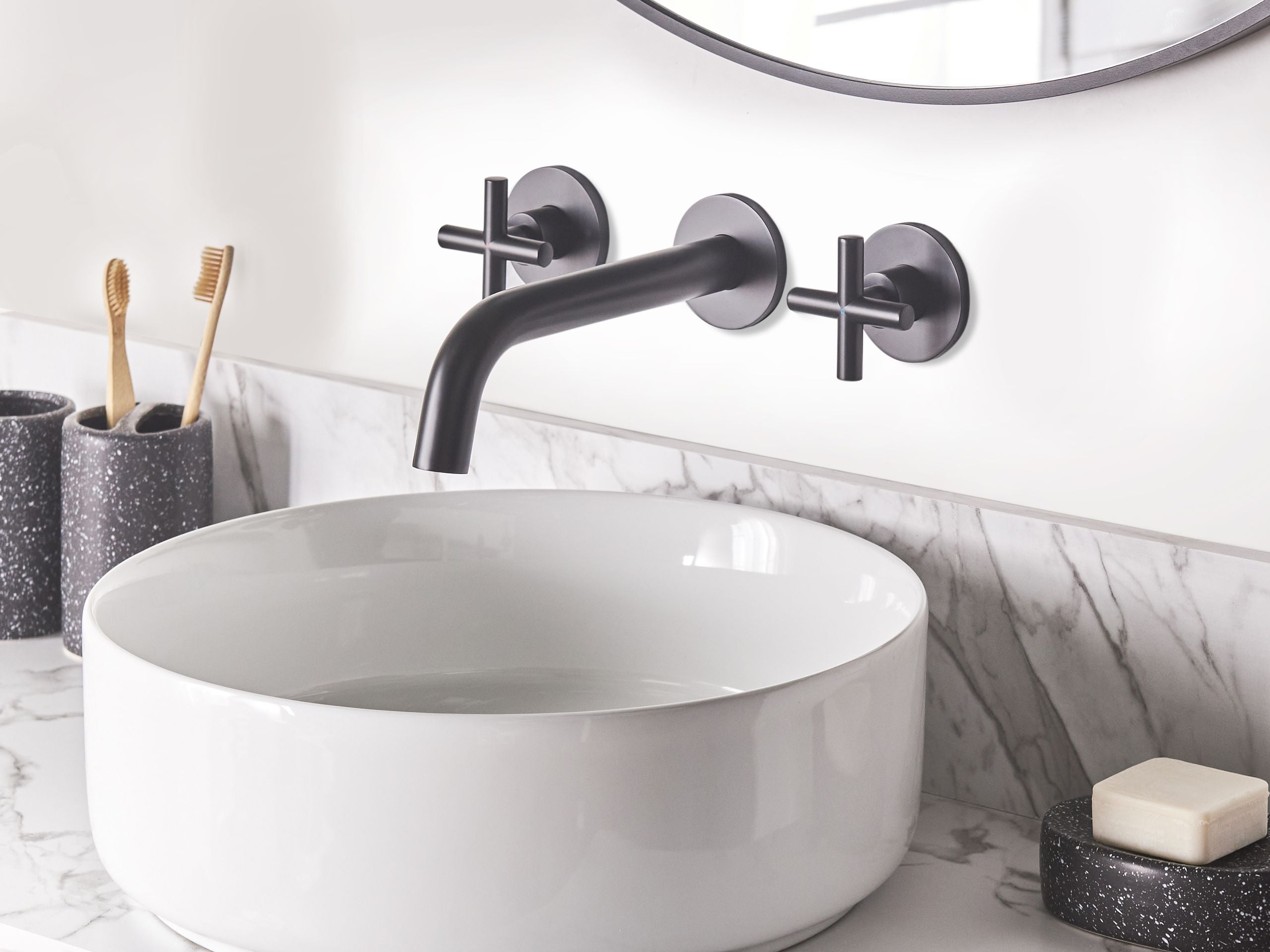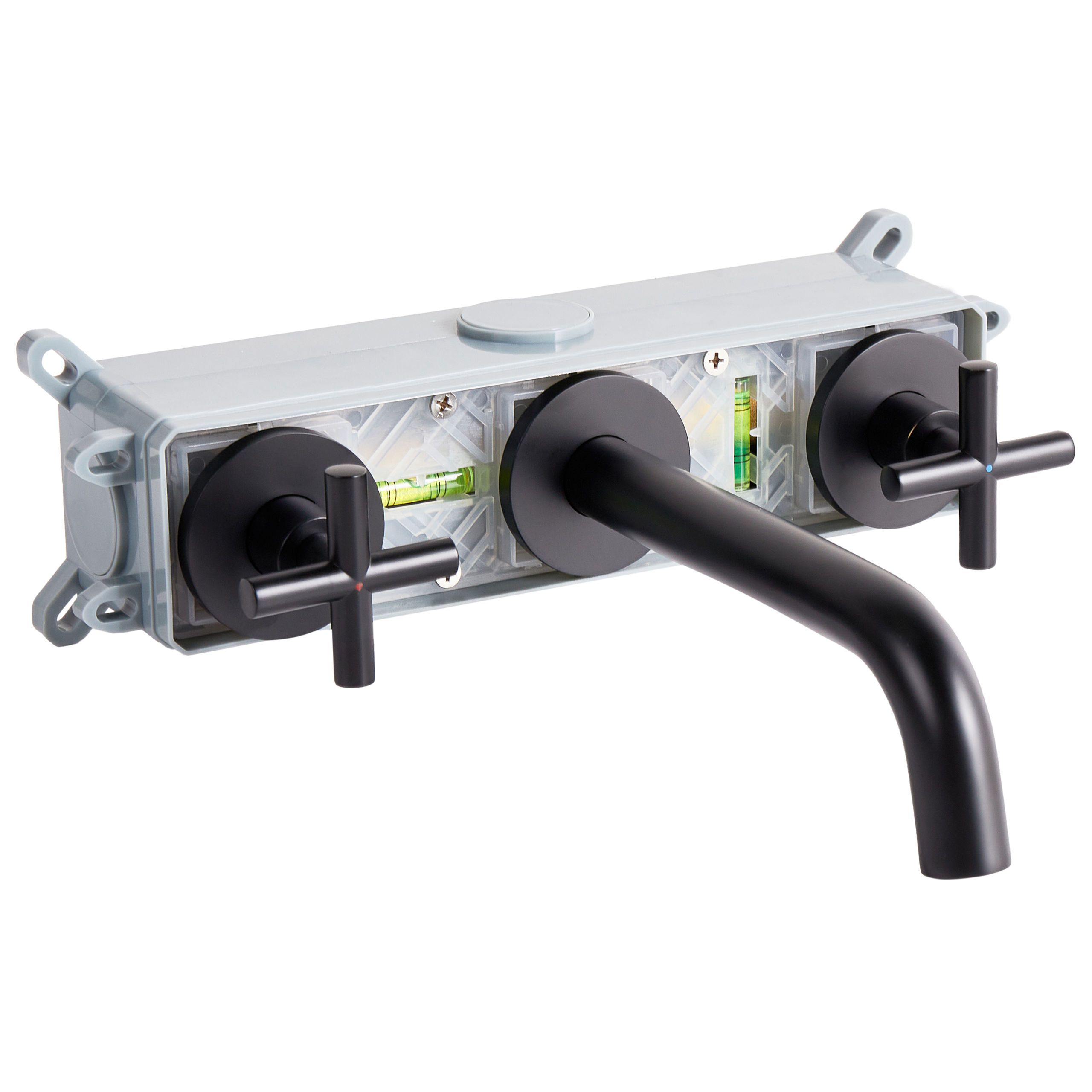 Kaksivipuinen pesualtaan hana. Lisää kylpyhuoneeseesi ripaus eleganssia tällä seinään kiinnitettävällä pesuallashanalla, joka on suunniteltu antamaan tilalle puhdas ja viimeistelty ilme. Se on valmistettu kestävästä messingistä, jossa on mattamusta viimeistely. Pitkä nokka ja klassiset ristikahvat takaavat helpon ja tyylikkään hallinnan. Kaksivipuinen rakenne tarjoaa ihanteellisen lämpötilansäädön ja yhdistää toiminnallisuuden sekä ajattoman viehätyksen.