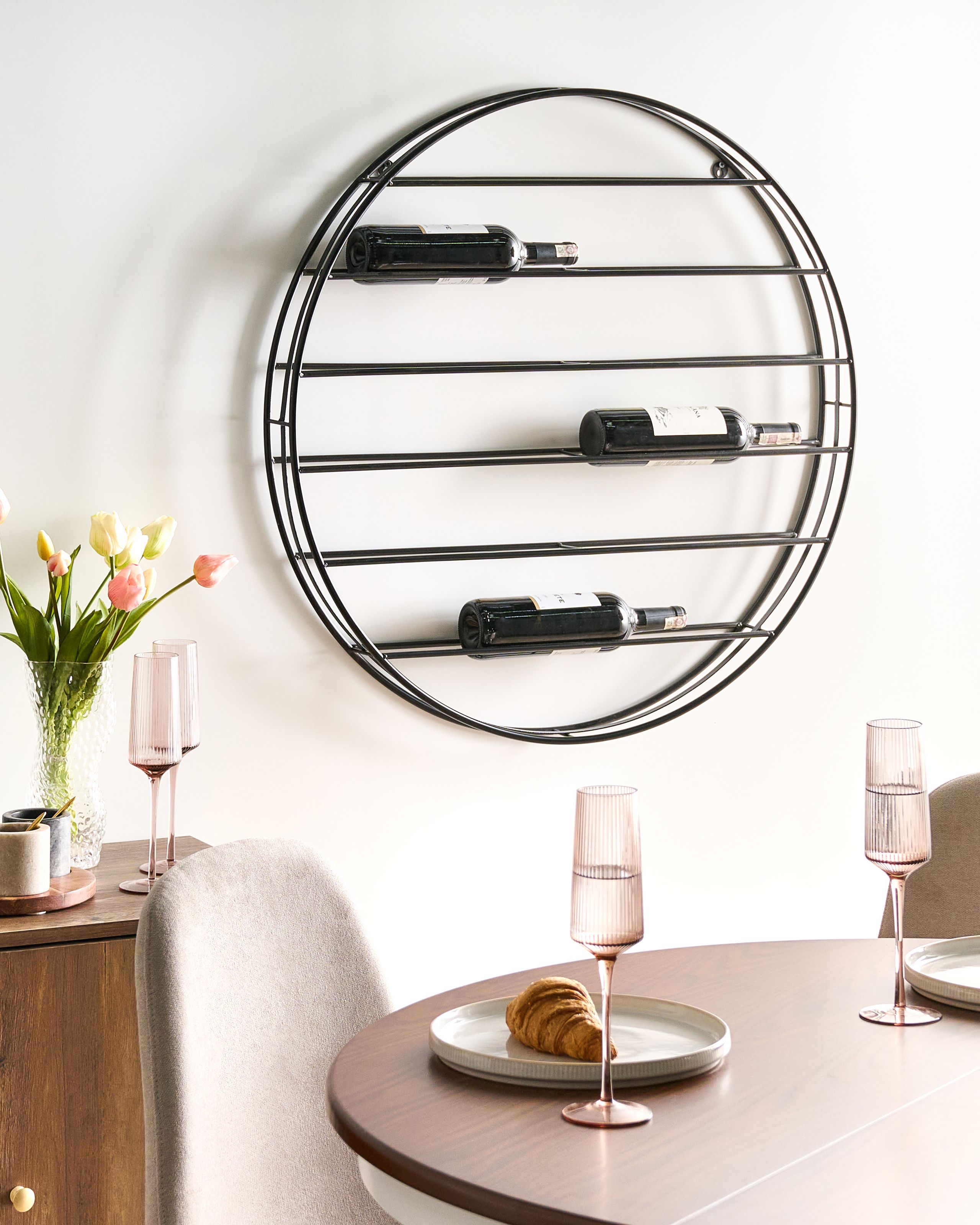 Pyöreä seinään kiinnitettävä viiniteline 10 pullolle. Tämä seinään kiinnitettävä viinipulloteline yhdistää modernin muotoilun ja käytännöllisen säilytystilan, tarjoten tyylikkään tavan esitellä viinikokoelmaa seinällä. Sen näyttävä, pyöreä siluetti ei vain korista seinää, vaan tarjoaa myös vaakasuoran säilytyspaikan usealle pullolle, minkä ansiosta viinikokoelmasta tulee visuaalinen keskipiste. Teline on valmistettu kevyesti kiiltävästä, maalatusta raudasta, joka takaa poikkeuksellisen kestävyyden ja lisää modernia vetovoimaa sekä täydentää mitä tahansa sisustusta. Se sopii erinomaisesti kaikille, jotka arvostavat tehokasta tilankäyttöä ja visuaalista houkuttelevuutta.