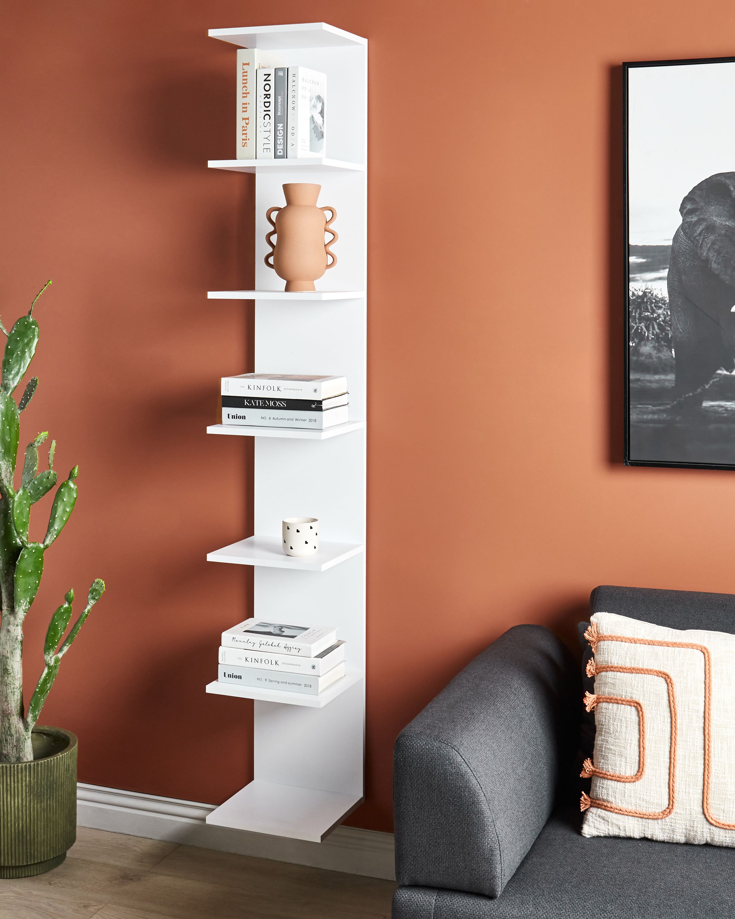 Moderni seinälle ripustettava kirjahylly. Tämä tyylikäs ja kompakti seinähylly lisää ripauksen modernia ilmettä mihin tahansa tilaan minimalistisella muotoilullaan. Kuusi tilavaa hyllyä tarjoavat runsaasti tilaa kirjojen ja koristeiden esittelyyn lattiatilaa viemättä. Se on valmistettu kestävästä laminoidusta lastulevystä, mikä tekee siitä kevyen mutta tukevan valinnan, joka kohottaa mitä tahansa nykyaikaista sisustusta.