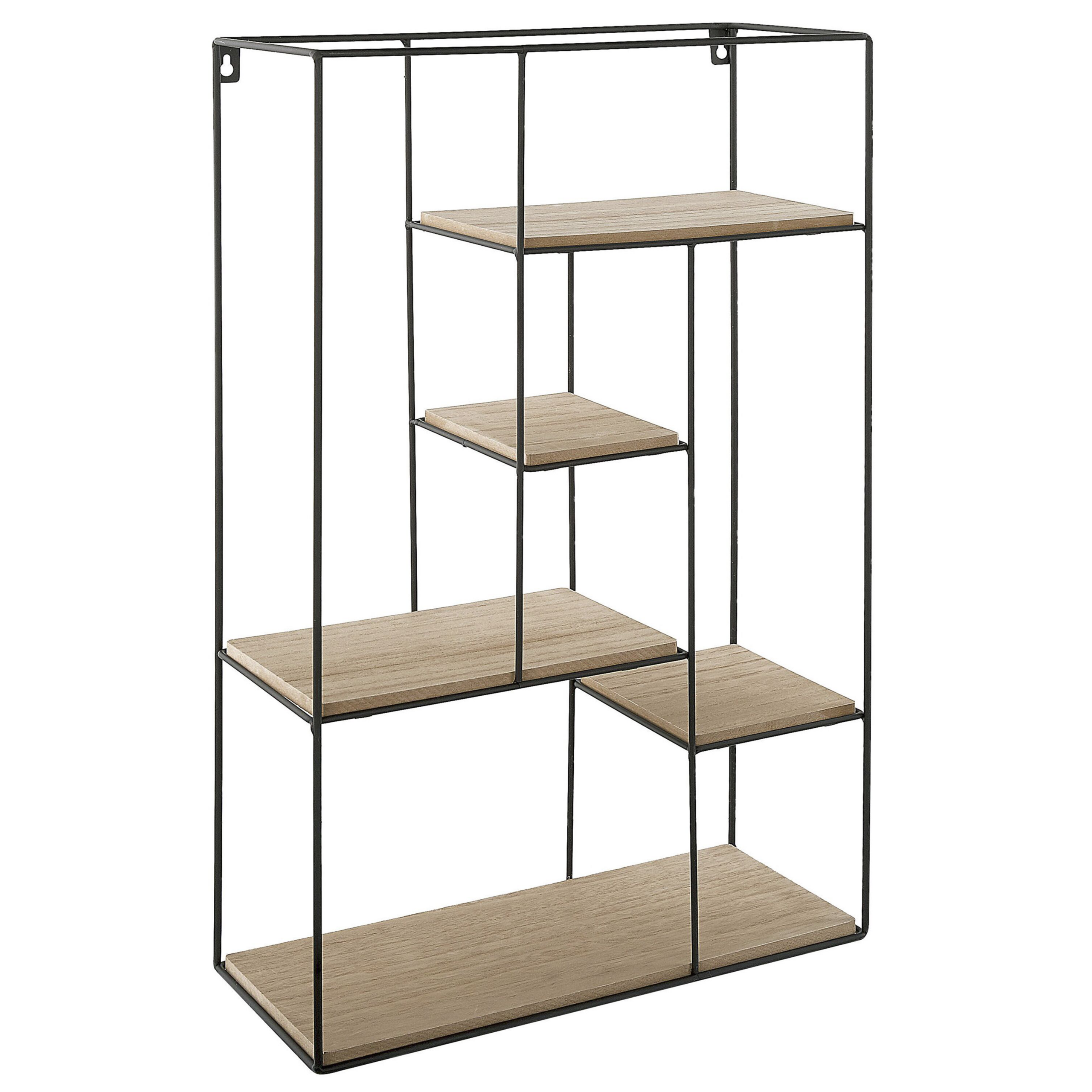 Minimalistinen ripustettava hylly. Tyylikäs ja toimiva säilytysratkaisu, joka toimii hyvin kaikissa huoneissa. Modernin puun sekä mustan metallin yhdistelmä on helppo yhdistää kodin muuhun sisustukseen. Ripustaminen seinälle on erittäin helppoa kiinnityskoukkujen ansiosta. Aseta hyllylle esimerkiksi toimiston tarvikkeita, kirjoja tai koriste-esineitä.