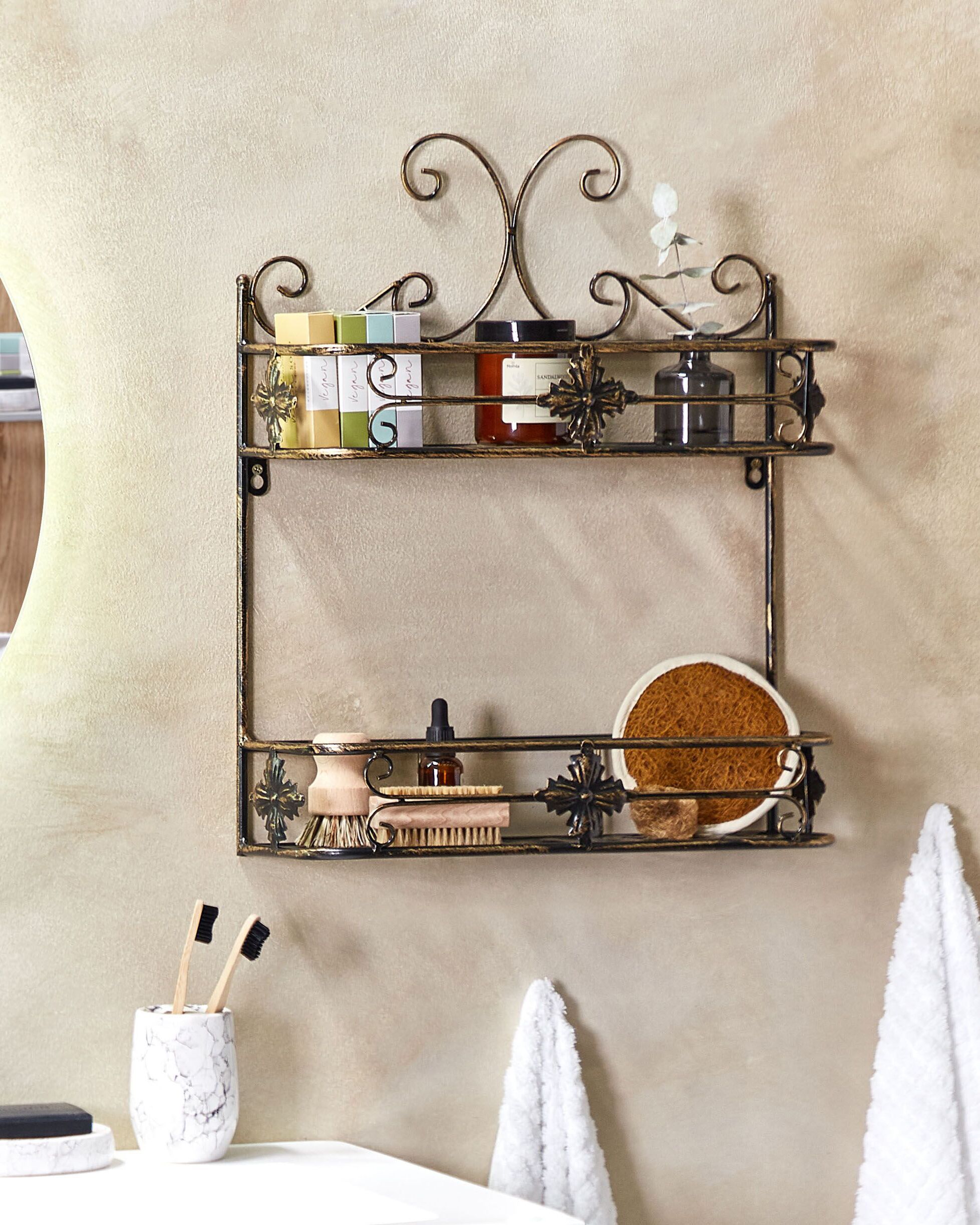 Retrotyylinen haalistunut hylly kylpyhuoneeseen. Tämä pieni mutta tilava hylly auttaa sinua organisoimaan kylpyhuoneesi. Raudasta valmistetussa hyllyssä on kaksi tasoa, jotka tarjoavat tilaa kauneus-, kylpytuotteille sekä muille pienille esineille. Peilin viereen tai vessan päälle ripustettuna se on käytännöllinen ja koristeellinen aksentti. Koristeellisen muotoilunsa ja mustan haalistuneen näköisen värinsä ansiosta hylly sopii täydellisesti mihin tahansa retro- tai maalaistyyliseen sisustukseen.