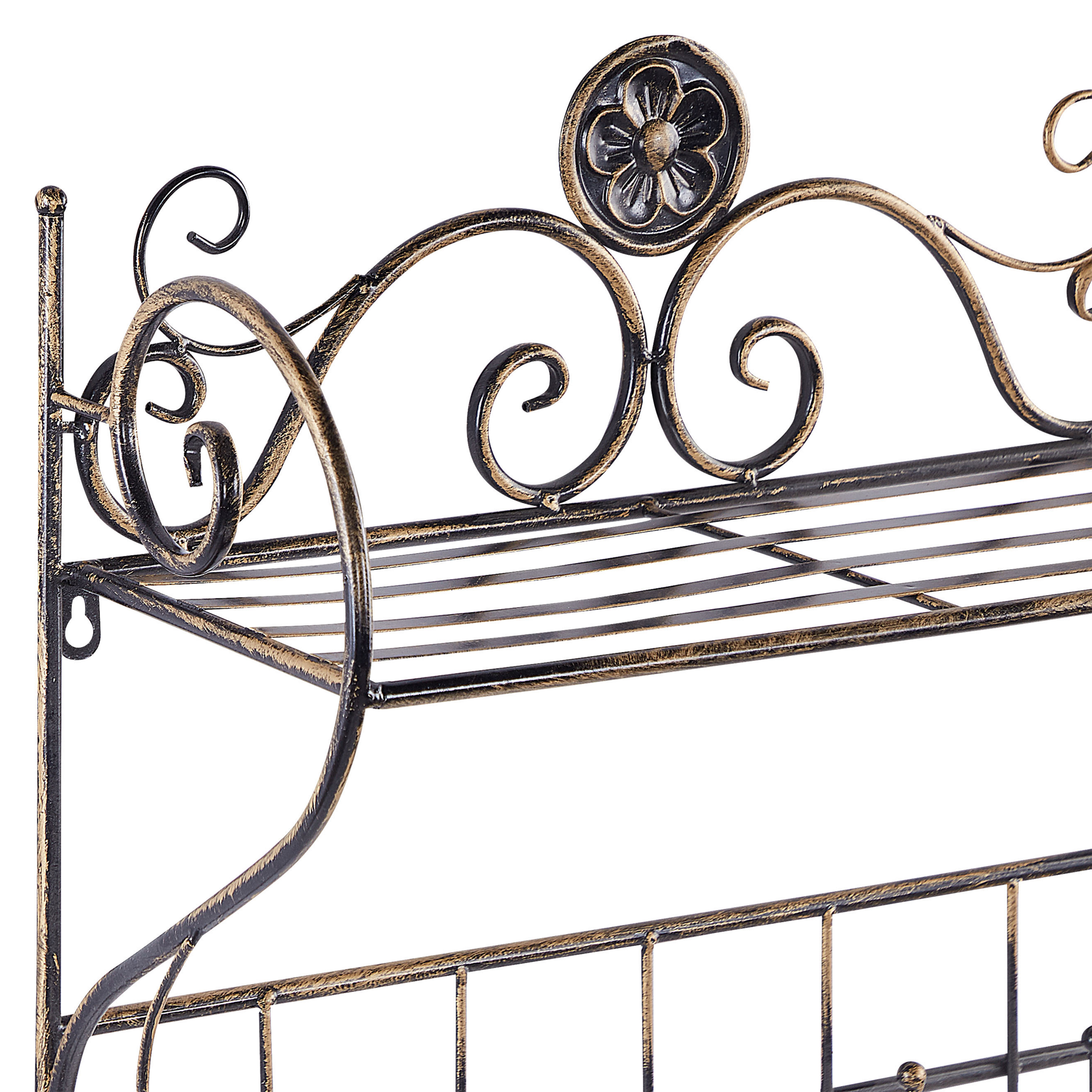 Maalaistyylinen haalistunut hylly kylpyhuoneeseen. Tämä kaunis hylly on täydellinen kaluste kylpyhuoneeseen tai eteiseen. Raudasta valmistettu hylly on helppohoitoinen ja tukeva. Vintage-tyylisten kaarevien kulmien sekä mustan haalistuneen värin ansiosta se korostaa kauniisti retro- tai maalaistyylistä sisustusta. Hylly on täydellinen paikka kylpyhuoneen tarvikkeiden ja muiden kosmeettisten tuotteiden esillepanoon. Viisi käytännöllistä koukkua mahdollistavat pyyhkeiden tai pyykkikorin ripustamisen. Eteisessä se tarjoaa paljon tilaa hattujen, huivien sekä takkien säilyttämiseen.
