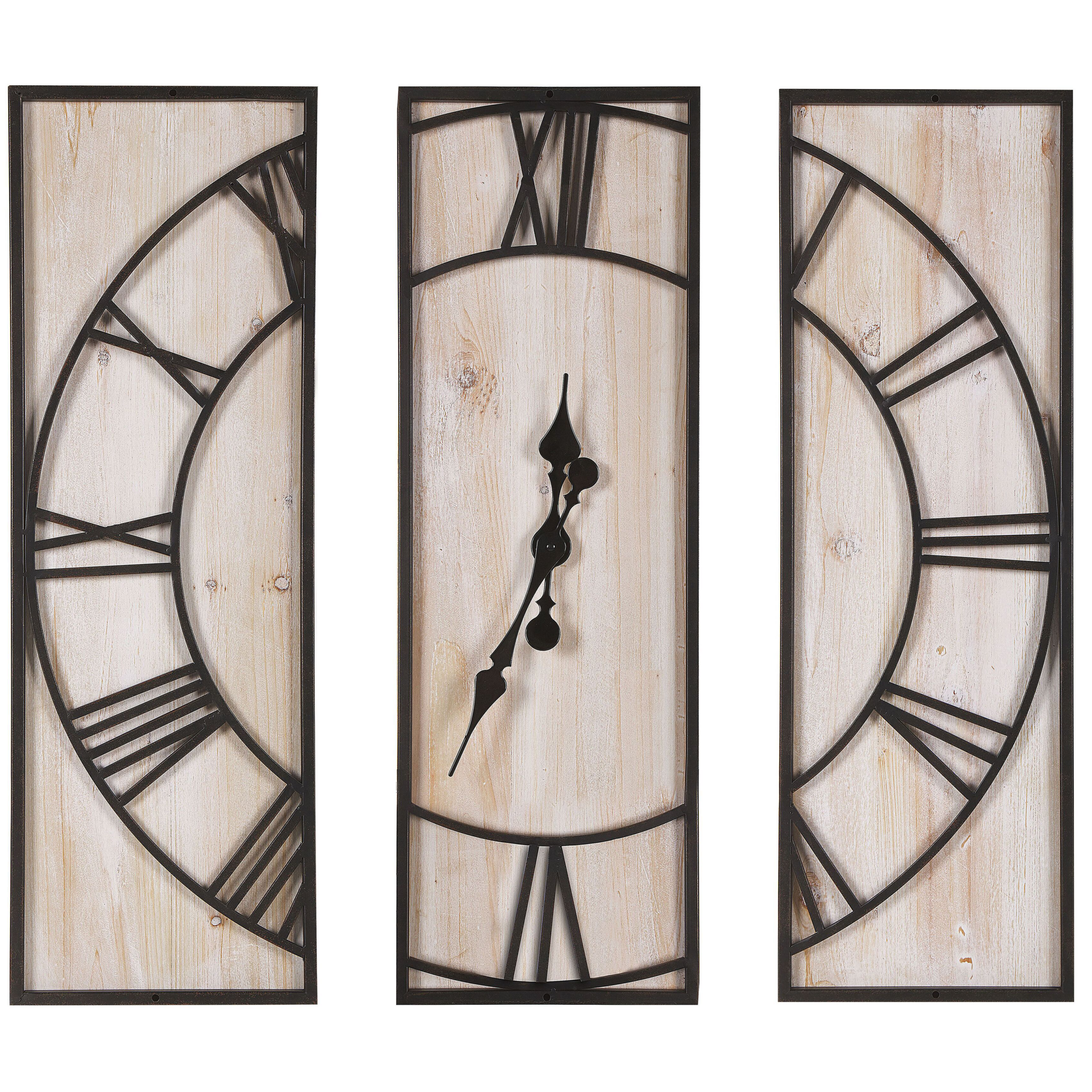 Kolmeosainen rustiikkinen kello. Tämä ainutlaatuinen kolmeosainen seinäkello on todellinen katseiden kääntäjä. Kello on valmistettu käsin kestävästä puusta ja se tuo sisustukseesi luonnollista ilmettä. Mustat metalliset kehykset tuovat kellolle vintage-henkeä. Osat ovat täysin erillisiä, joten voit määrittää itse minkä kokoiset välit jätät osien väleihin.