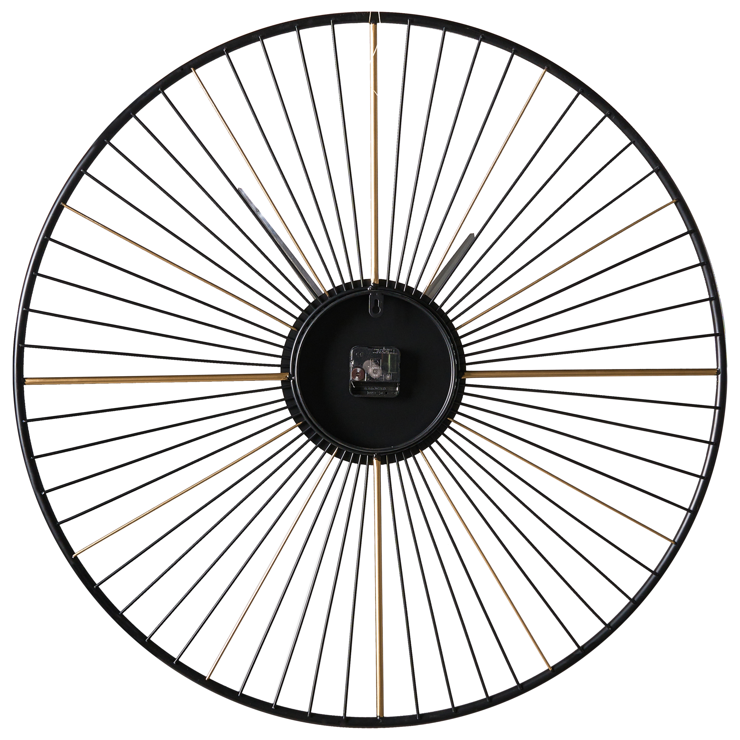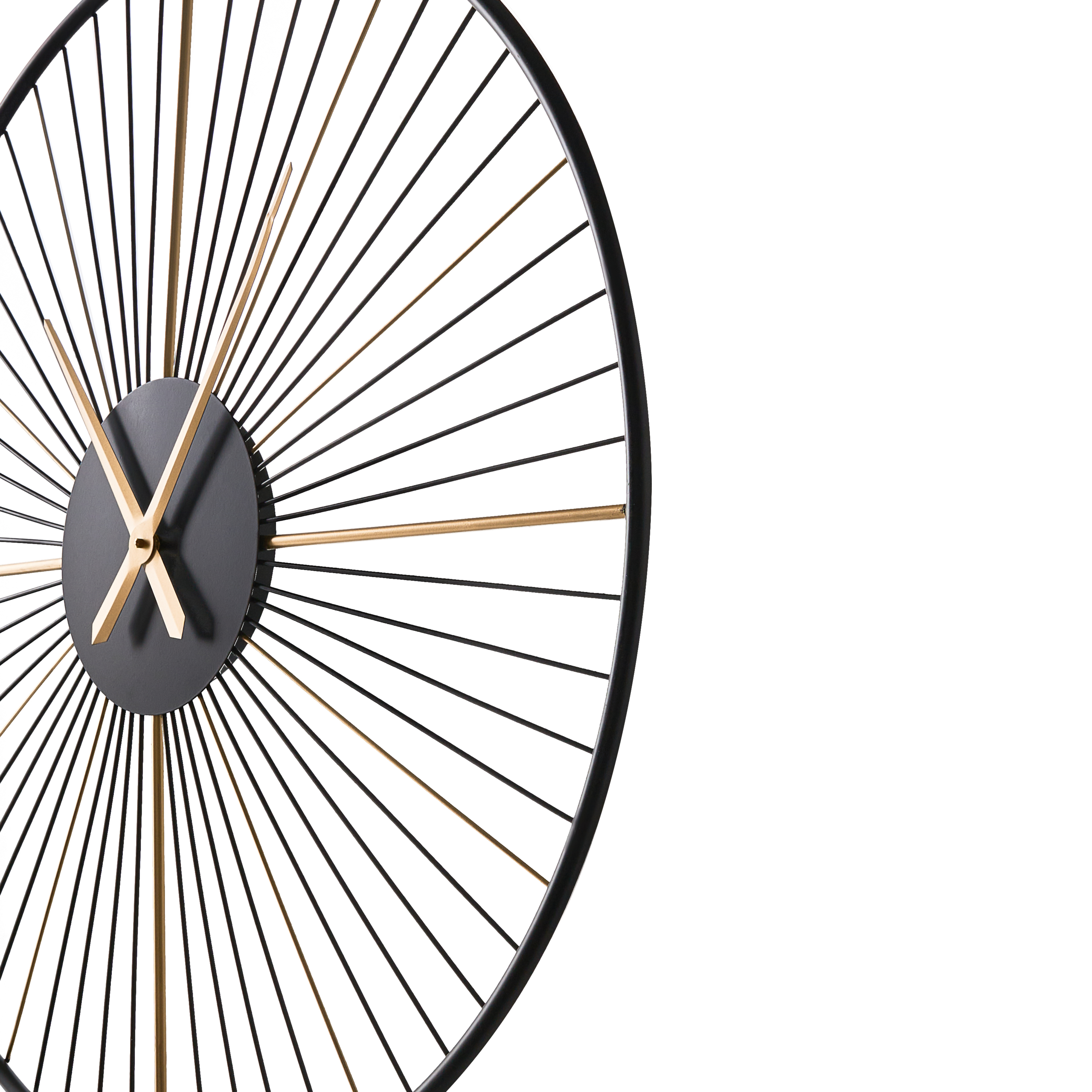 Minimalistinen seinään ripustettava kello. Tee vaikutus tällä pyöreällä, raudasta valmistetulla seinäkellolla, joka on saanut inspiraationsa auringonsäteistä. Yksityiskohtaiset, vuorottelevat mustat ja kullanväriset säleet luovat kiehtovan optisen vaikutelman, josta tulee välittömästi huoneen keskipiste. Suuri mutta kevyt rakenne tekee kellosta tyylikkään ja käytännöllisen lisän jokaiseen moderniin kotiin.
