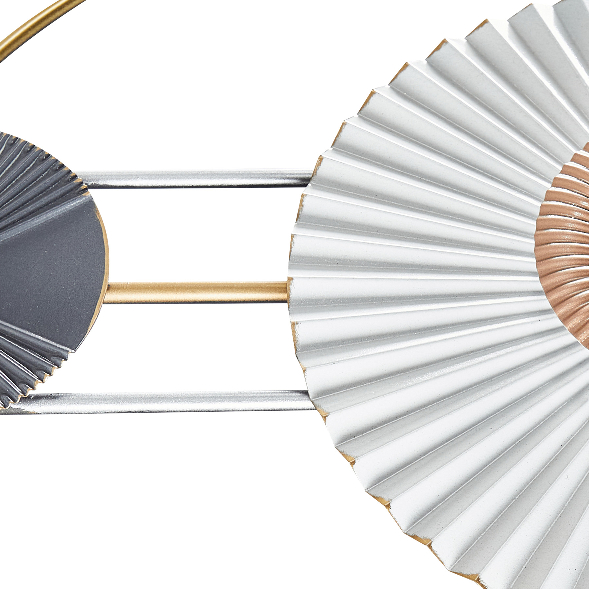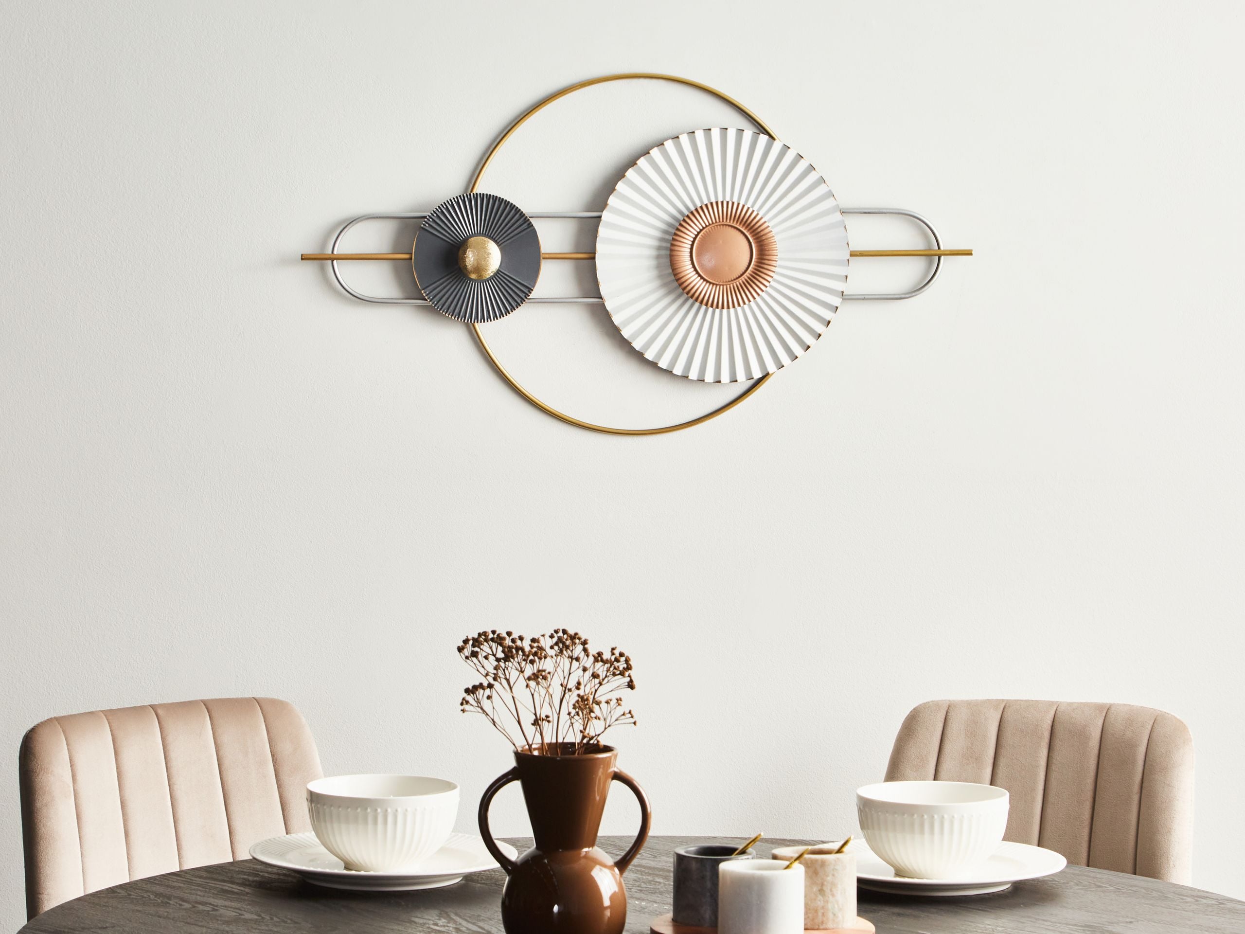 Moderni ripustettava koriste. Lisää sisustukseesi modernia särmää tällä näyttävällä, raudasta valmistetulla seinäkoristeella. Geometriset muodot ja kultaiset aksentit luovat tyylikkään ja hienostuneen ilmeen, joka sulautuu saumattomasti nykyaikaisiin sisustuksiin. Takana sijaitsevien kätevien koukkujen avulla koriste on mahdollista ripustaa sekä vaaka- että pystysuoraan. Se sopii täydellisesti eteisiin, olohuoneisiin ja ruokailutiloihin, tuoden tyyliä tilaa hukuttamatta.