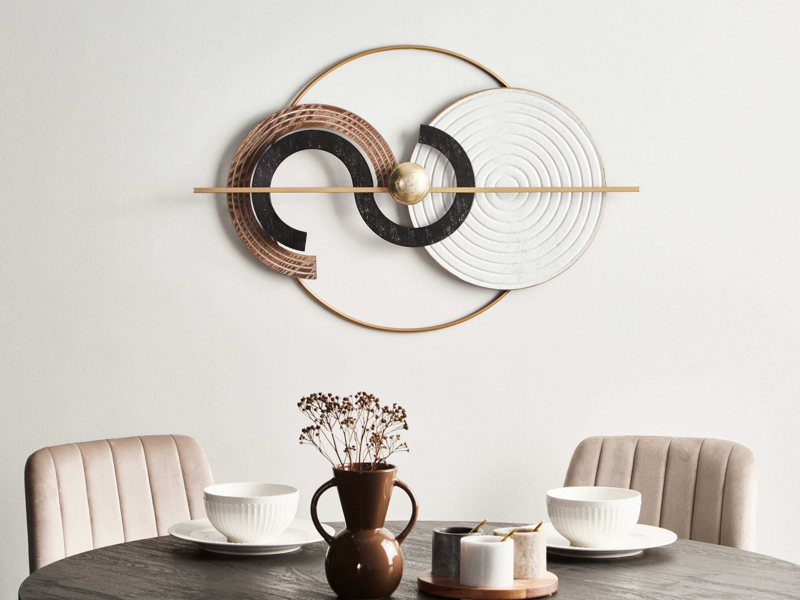 Moderni ripustettava koriste. Tämä tyylikäs, modernia muotoilua ja eleganssia yhdistävä raudasta valmistettu seinäkoriste erottuu kauniisti hienovaraisilla kullanvärisillä korostuksillaan. Sen nykyaikainen tyyli tekee siitä näyttävän lisän olohuoneiden lisäksi myös useisiin sisustuksiin. Takaosassa olevat kätevät koukut varmistavat vaivattoman ripustuksen sekä vaaka- että pystysuoraan. Seinäkoriste on täydellinen valinta lisäämään hienostuneisuutta mihin tahansa kotiin.