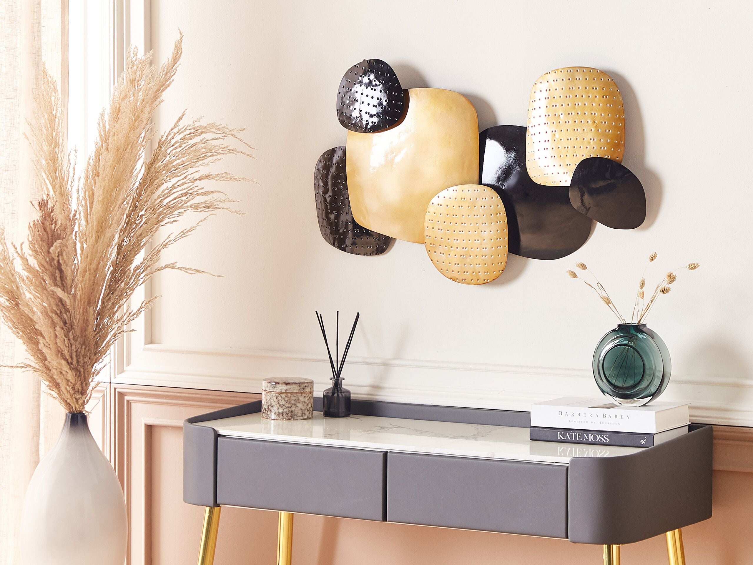 Glamour-tyylinen seinäkoriste. Tuo ylellistä tunnelmaa kotiisi tällä tyylikkäällä seinäkoristeella. Se on valmistettu käsin kestävästä ja pitkäikäisestä raudasta. Ainutlaatuinen abstrakti muotoilu ja geometriset muodot saavat koristeen sulautumaan täydellisesti moderneihin tai glamour-tyylisiin tiloihin. Ripusta se seinälle ja ihastu kultaisen ja mustan väriyhdistelmän luomasta siluetista.