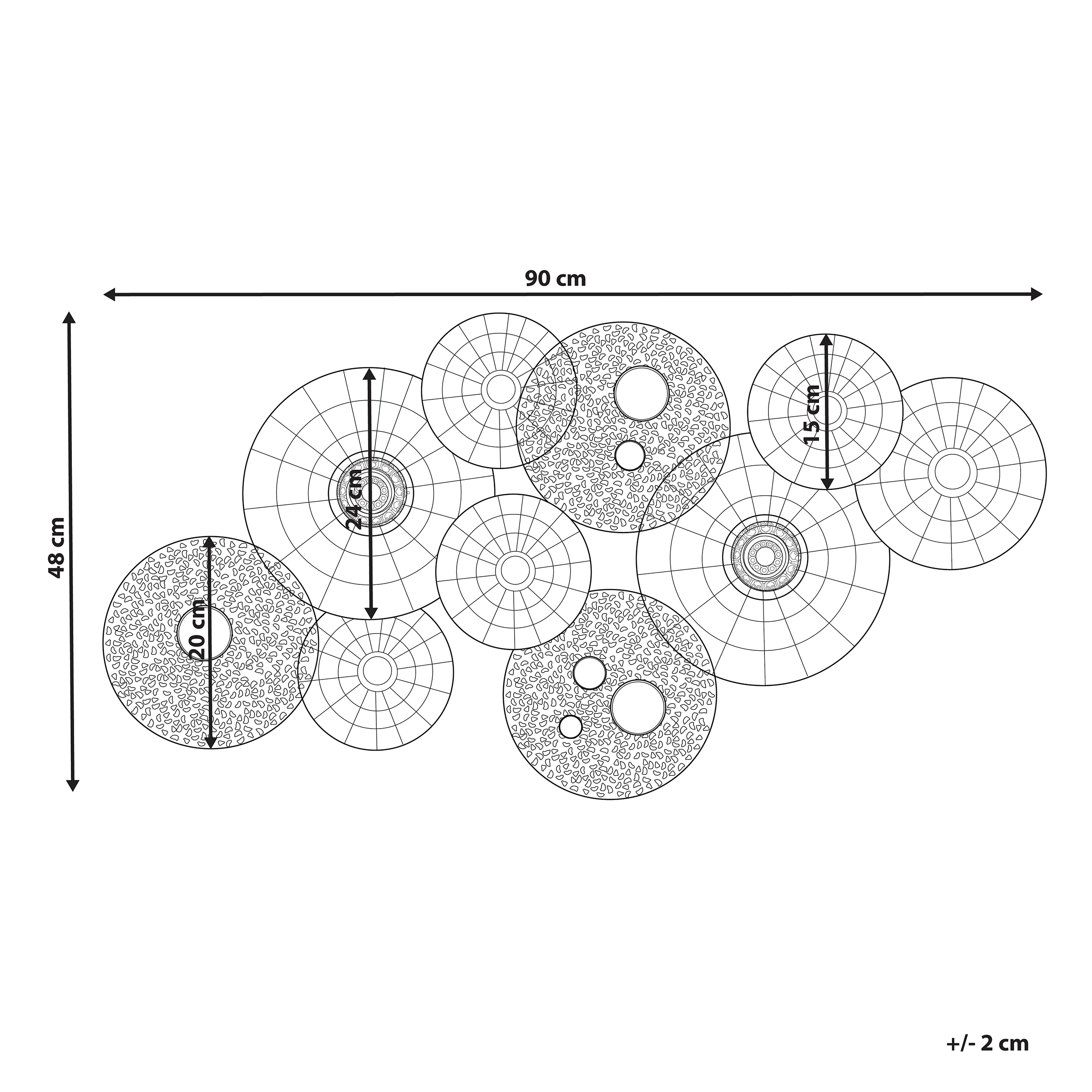 Epäsäännöllisesti muotoiltu seinäkoriste. Piristä kotiasi tällä ihastuttavalla ja modernilla seinäkoristeella. Epäsäännöllisesti järjestellyt pyöreät metalliset laatat tuovat sisustukseen itämaista tunnelmaa. Koriste voidaan ripustaa joko pysty- tai vaakasuuntaisesti.