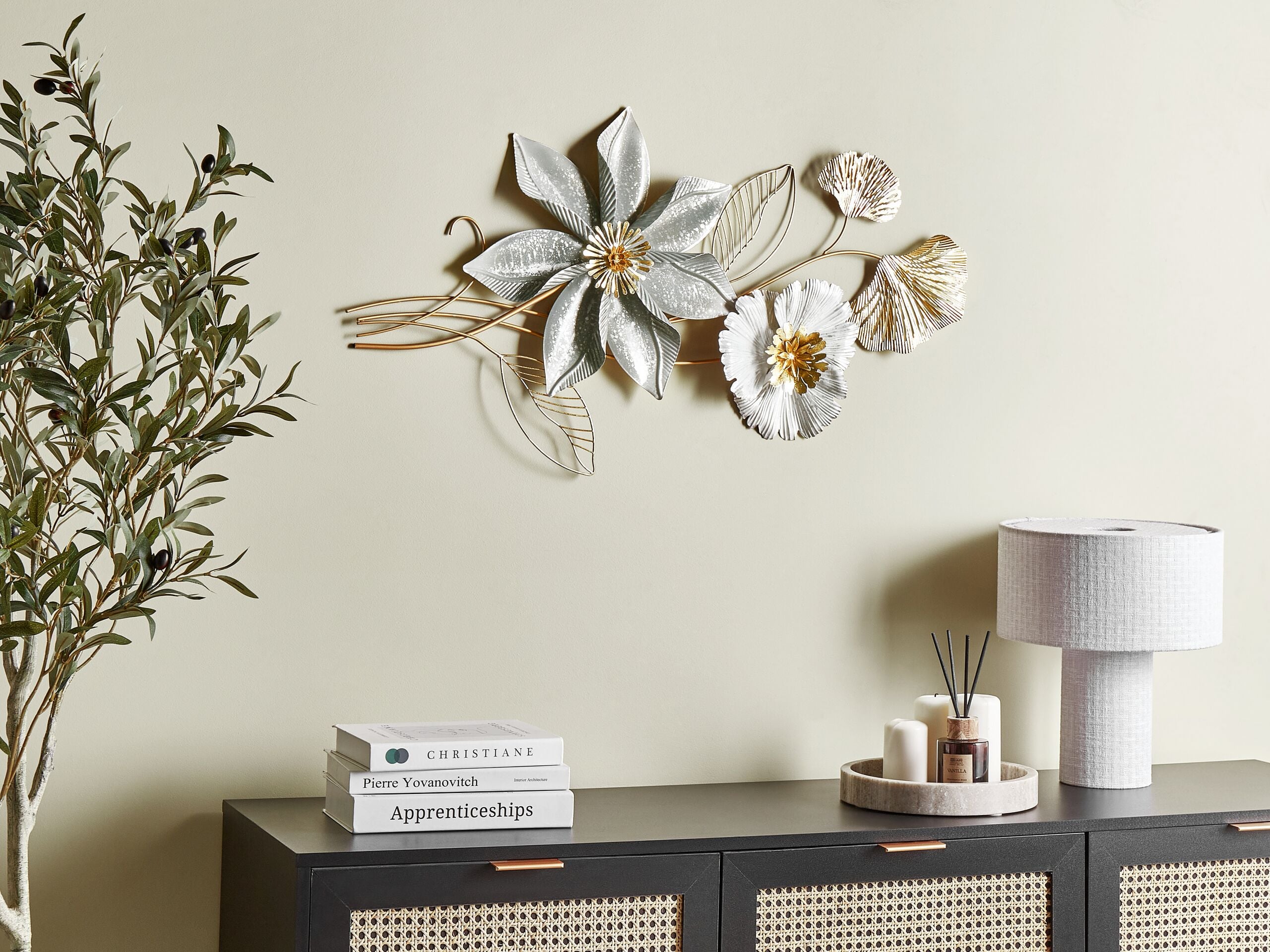 Kukkakuvioinen käsintehty seinätaide. Tämä seinäkoriste on valmistettu pitkäikäisestä ja helposti puhdistettavasta metallista, ja siinä esiintyy hienostunut kukkakuvio hillityissä väreissä sekä hohtavilla kultaisilla korostuksilla. Koristeen ainutlaatuiset sekä hohtavat yksityiskohdat tekevät siitä täydellisen lisän glamouriin ja moderniin sisustukseen, ja se piristää välittömästi mitä tahansa huonetta. Tässä teoksessa yhdistyvät tyylikkyys sekä pehmeys, ja takana olevien koukkujen ansiosta se on helppo ripustaa seinälle, mikä lisää tilan hienostuneisuutta.