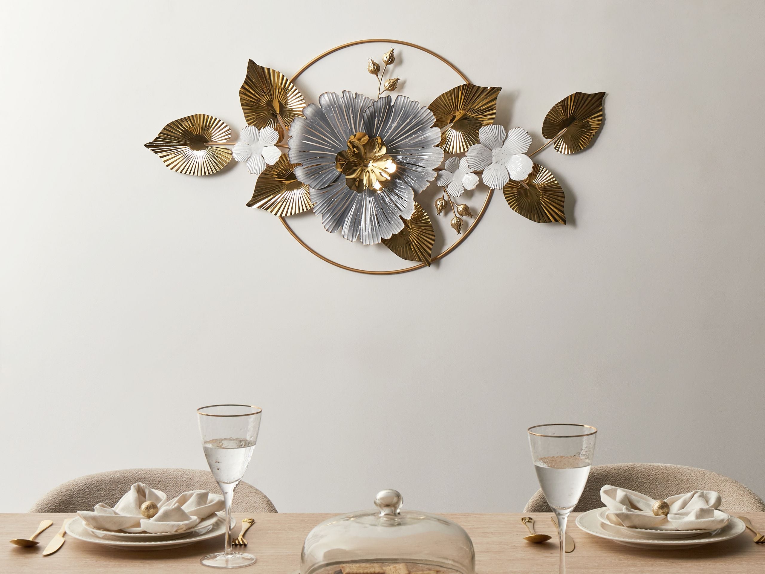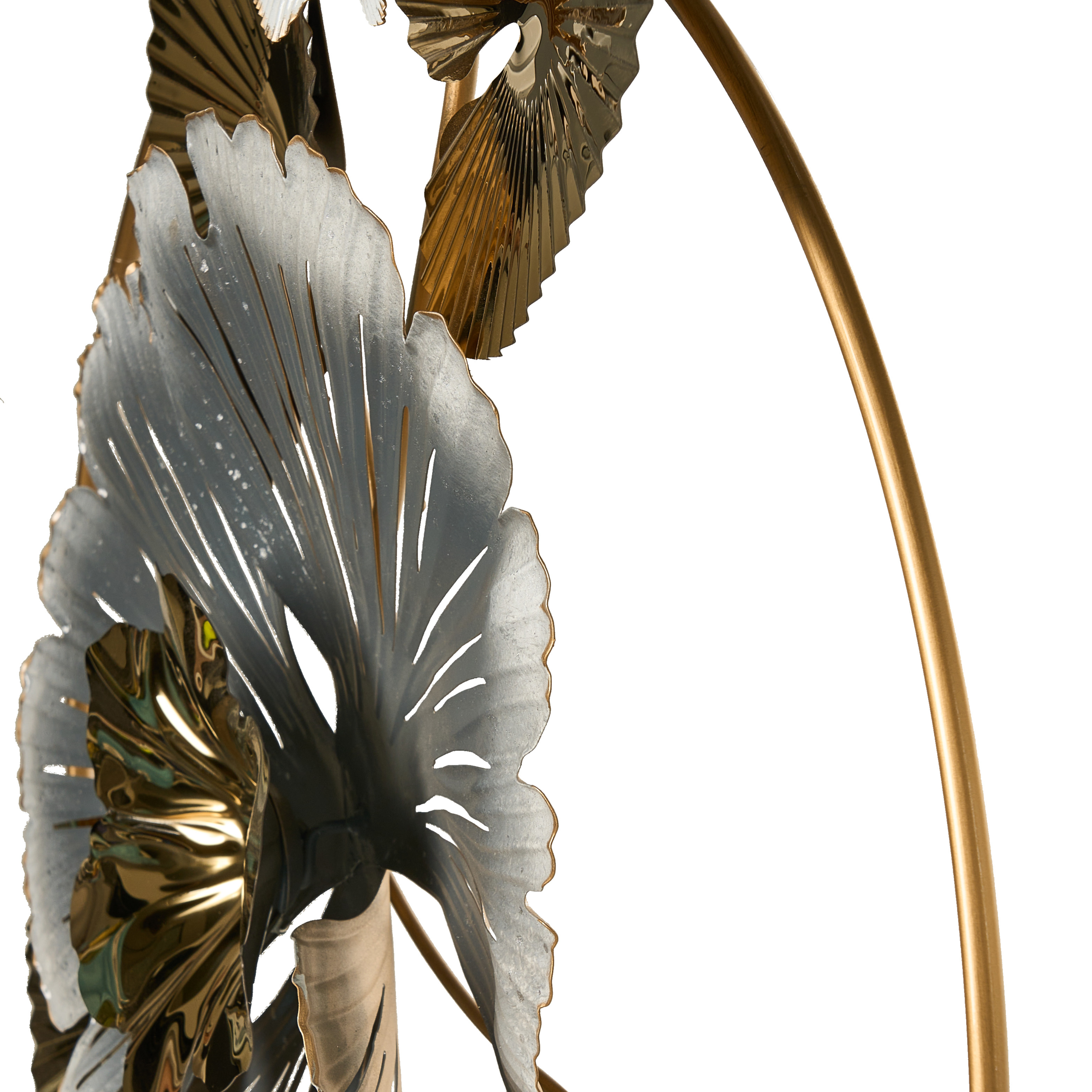 Ripustettava koriste kukilla ja lehdillä. Tämä ainutlaatuinen seinäkoriste lumoaa elegantilla kullan ja hopean yhdistelmällään luoden seinälle ylellisen aksentin. Koristeen keskipisteenä toimii suuri hopea kukka, jota ympäröivät kullanväriset lehdet ja pienemmät geometriset muodot, jotka kaikki on suljettu kullanväriseen kehykseen. Kestävästä ruostumattomasta teräksestä valmistettu koriste sopii täydellisesti olohuoneeseen, makuuhuoneeseen tai kotitoimistoon.