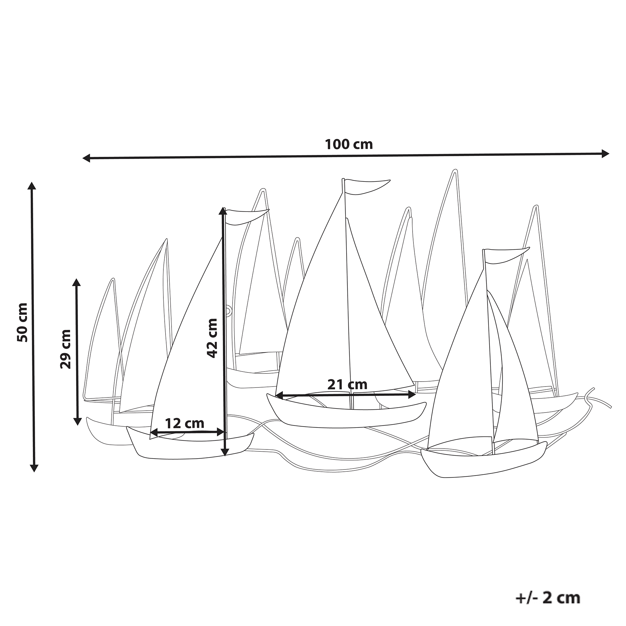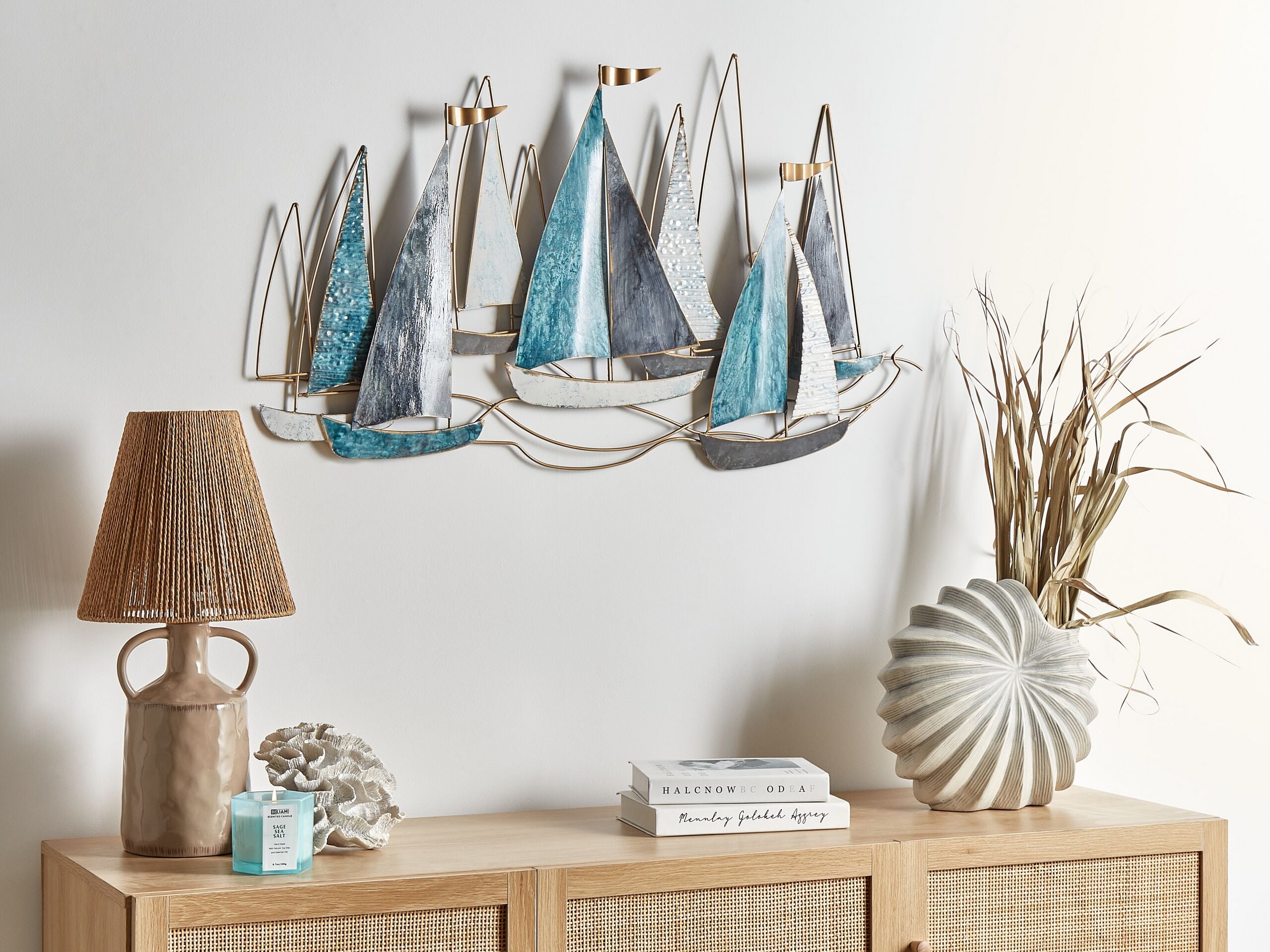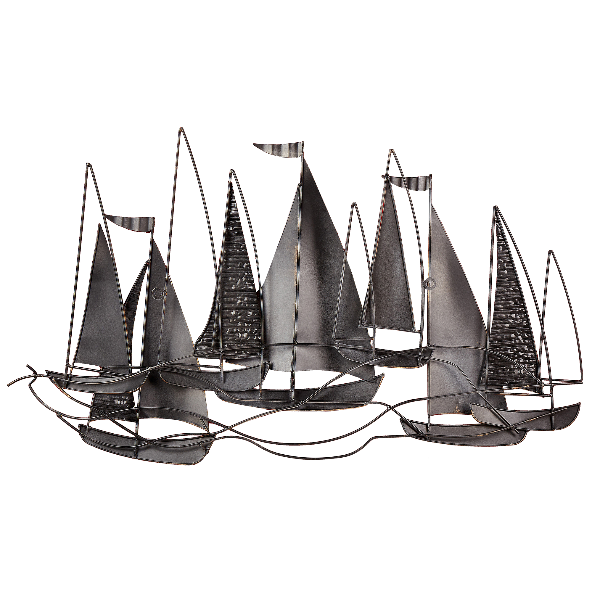 Käsintehty ripustettava koriste purjeveneillä. Kestävästä ja helppohoitoisesta raudasta käsin valmistettu seinäkoriste huokuu välimerellistä tunnelmaa muotoilunsa ansiosta. Kultaisilla yksityiskohdilla viimeistelty ja useita sinisen sävyjä sisältävä koriste koostuu useista purjeveneistä, jotka lisäävät hienostuneisuutta ja tyyliä mille tahansa seinälle. Takapuolelle sijoitetut ripustuskoukut tekevät koristeen ripustamisesta vaivatonta. Merellisen muotoilunsa ansiosta tämä seinäkoriste sopii sekä moderneihin että rannikkomaisiin sisustuksiin.