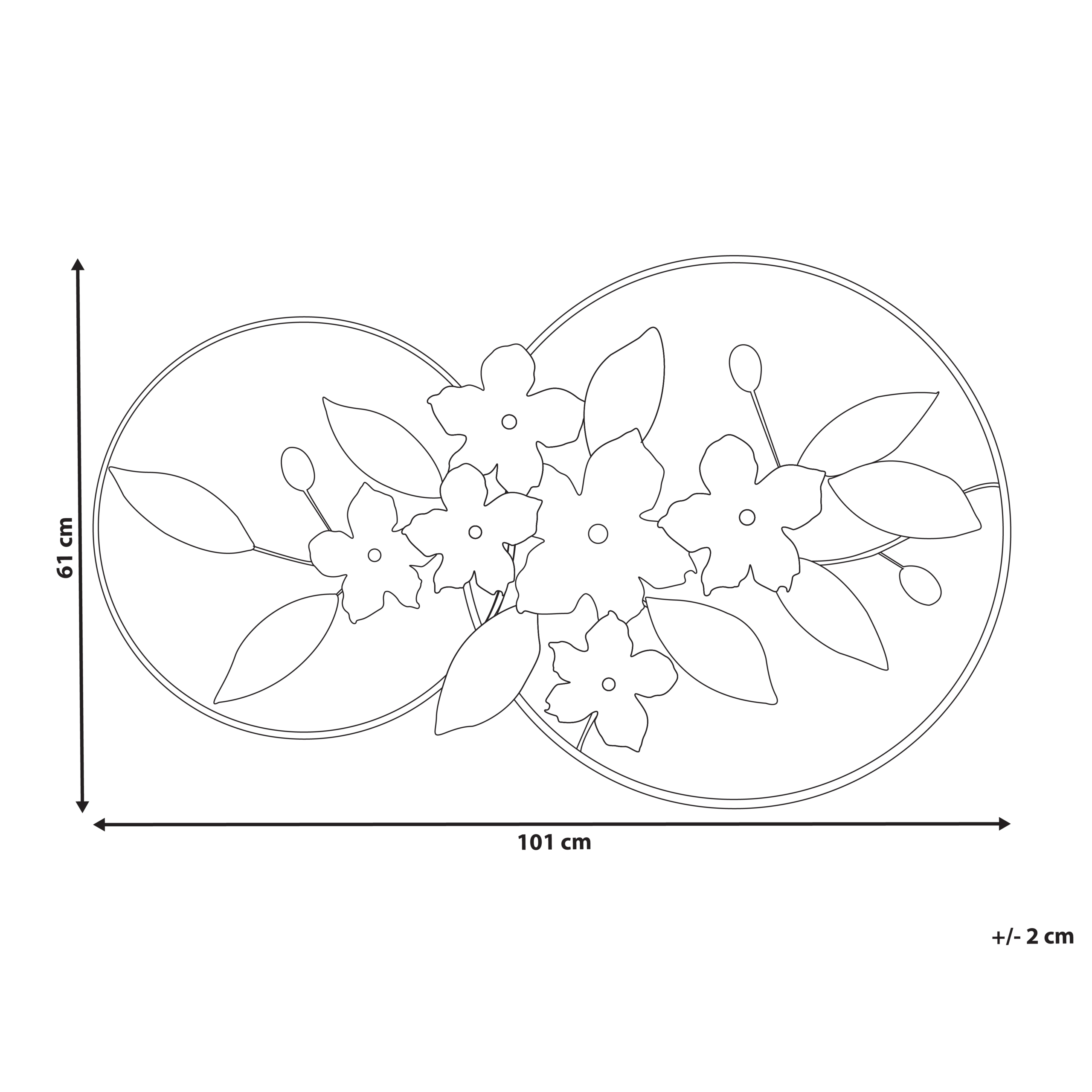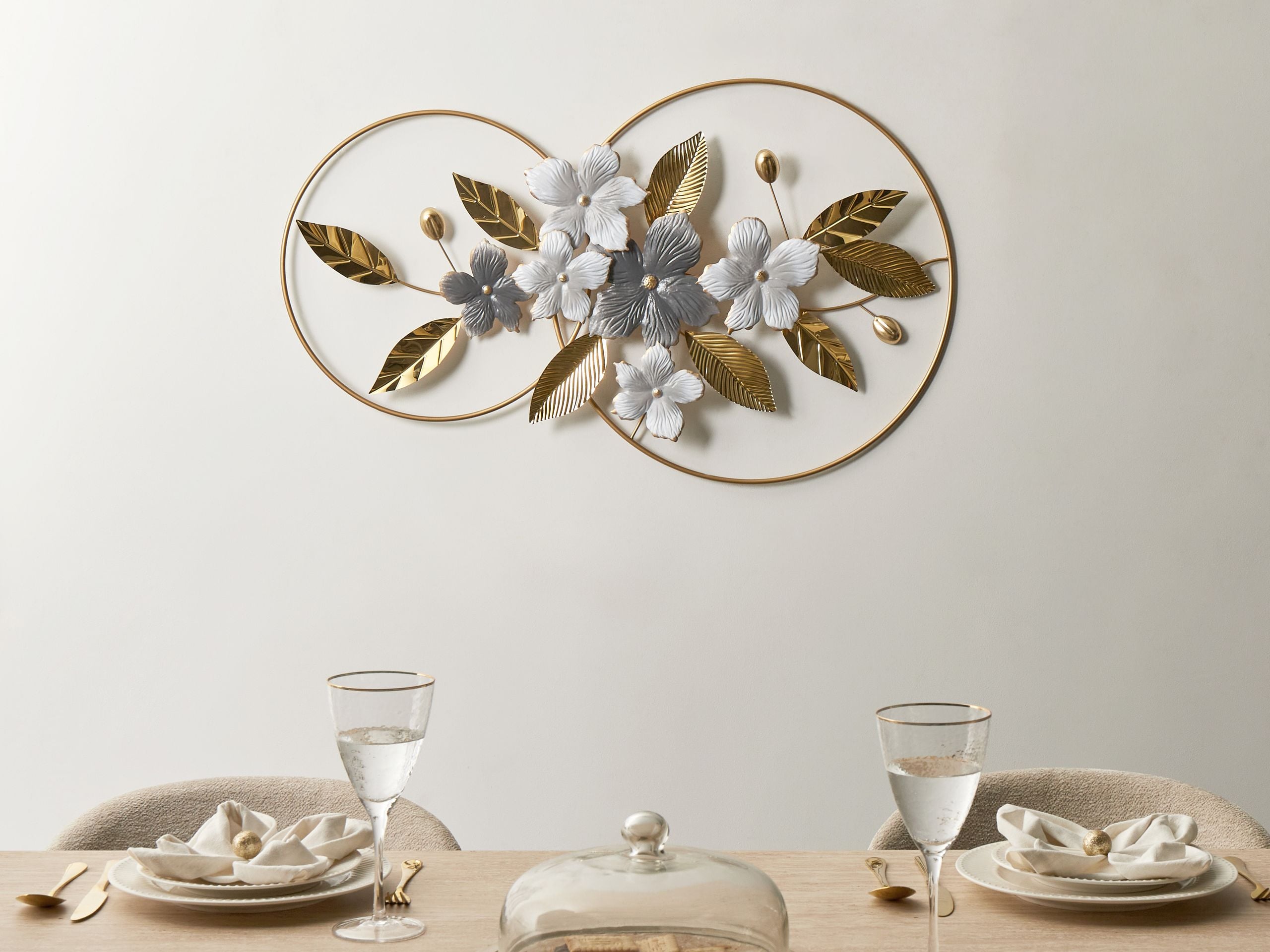 Glamour-tyylinen ripustettava koriste. Tämä ainutlaatuinen seinäkoriste yhdistää modernin ja art deco -tyylin herkkiin luontomotiiveihin. Ruostumattomasta teräksestä valmistettu koriste esittää tyyliteltyjä kukkia ja lehtiä eleganteissa harmaan, valkoisen ja kullan sävyissä, jotka on suljettu kahden päällekkäisen renkaan sisään. Se on erinomainen lisä olohuoneeseen, ruokailutilaan tai makuuhuoneeseen tuoden sisustukseen hienostunutta ja ylellistä tunnelmaa.