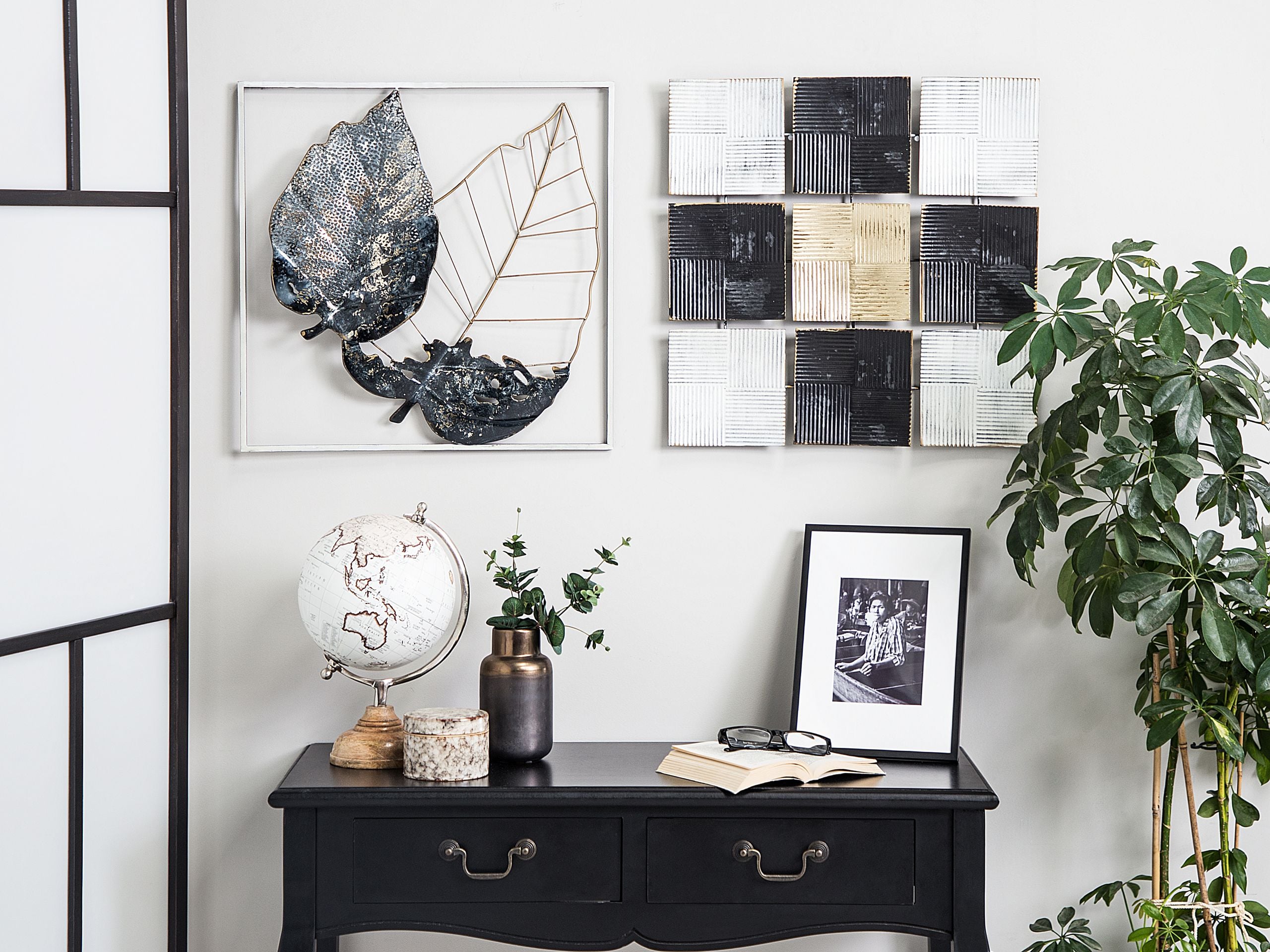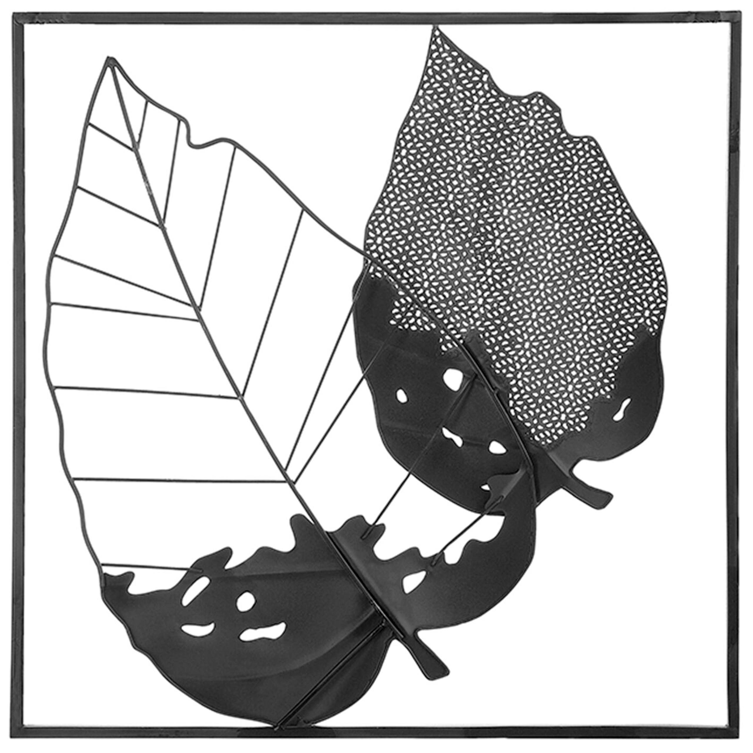 Tyylikäs lehden muotoinen seinäkoriste. Tämä veistoksellinen seinäkoriste on ainutlaatuinen ja kaunis lisä mille tahansa seinälle. Kokonaan metallista valmistettu koriste koostuu nelikulmaisesta kehyksestä, jonka sisään on asetettu kaksi suurta lehteä. Koristeelliset lehdet yhdistävät avonaista ja kiinteää muotoilua, luoden orgaanista ja industriaalista tunnelmaa huokuvan teoksen. Ripusta se muiden modernien koristeiden ja taulujen joukkoon luodaksesi rohkean ja näyttävän galleriaseinän.