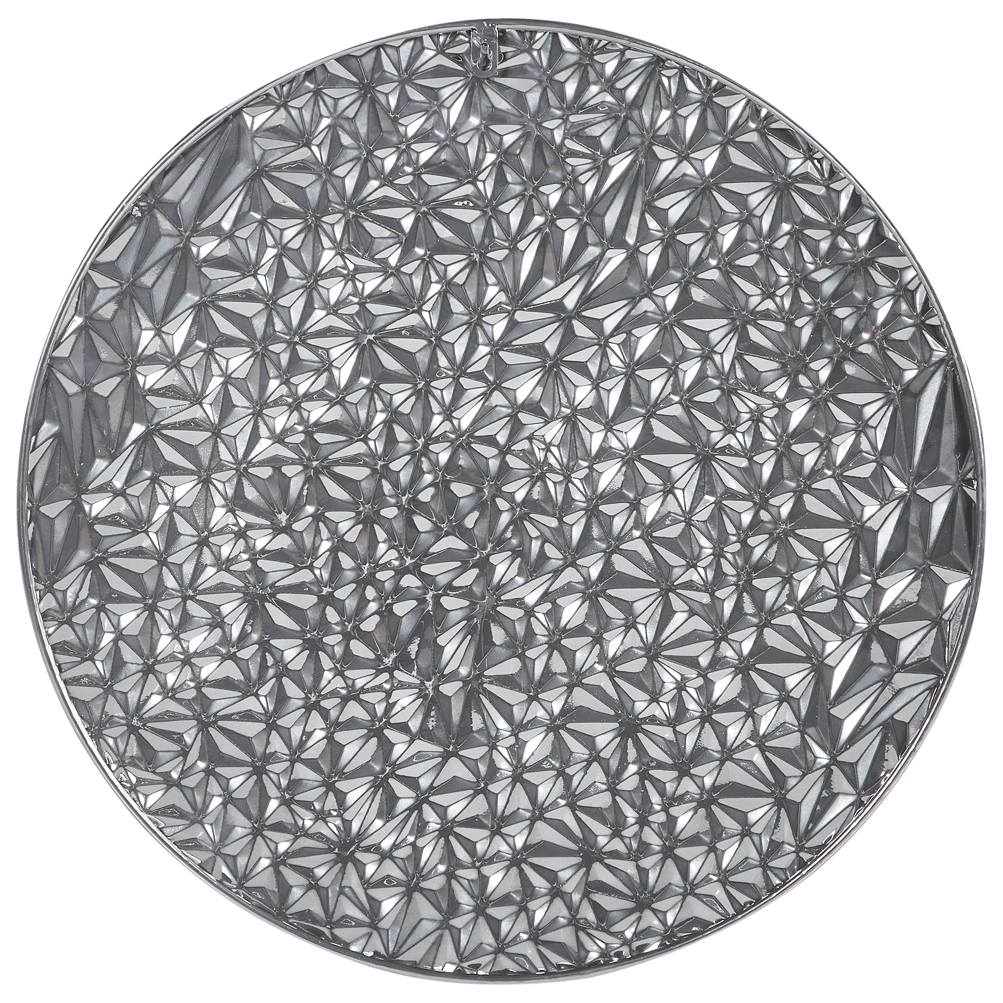 Industriaalinen pyöreä ripustettava koriste. Tämä pyöreä, metallisen hopeanvärisestä raudasta valmistettu seinäkoriste omaa epätasaisen, teksturoidun pinnan ja yhdistää industriaalisen sekä glamour-tyylisen estetiikan. Heijastava viimeistely lisää syvyyttä, mikä tekee koristeesta näyttävän keskipisteen moderneihin, loft-tyylisiin tai nykyaikaisiin tiloihin. Integroitu ripustuskoukku takaa helpon ripustuksen, joten seinäkoriste sopii kauniisti olohuoneisiin, eteisiin tai kotitoimistoihin, joissa tavoitellaan rohkeaa mutta eleganttia ilmettä.