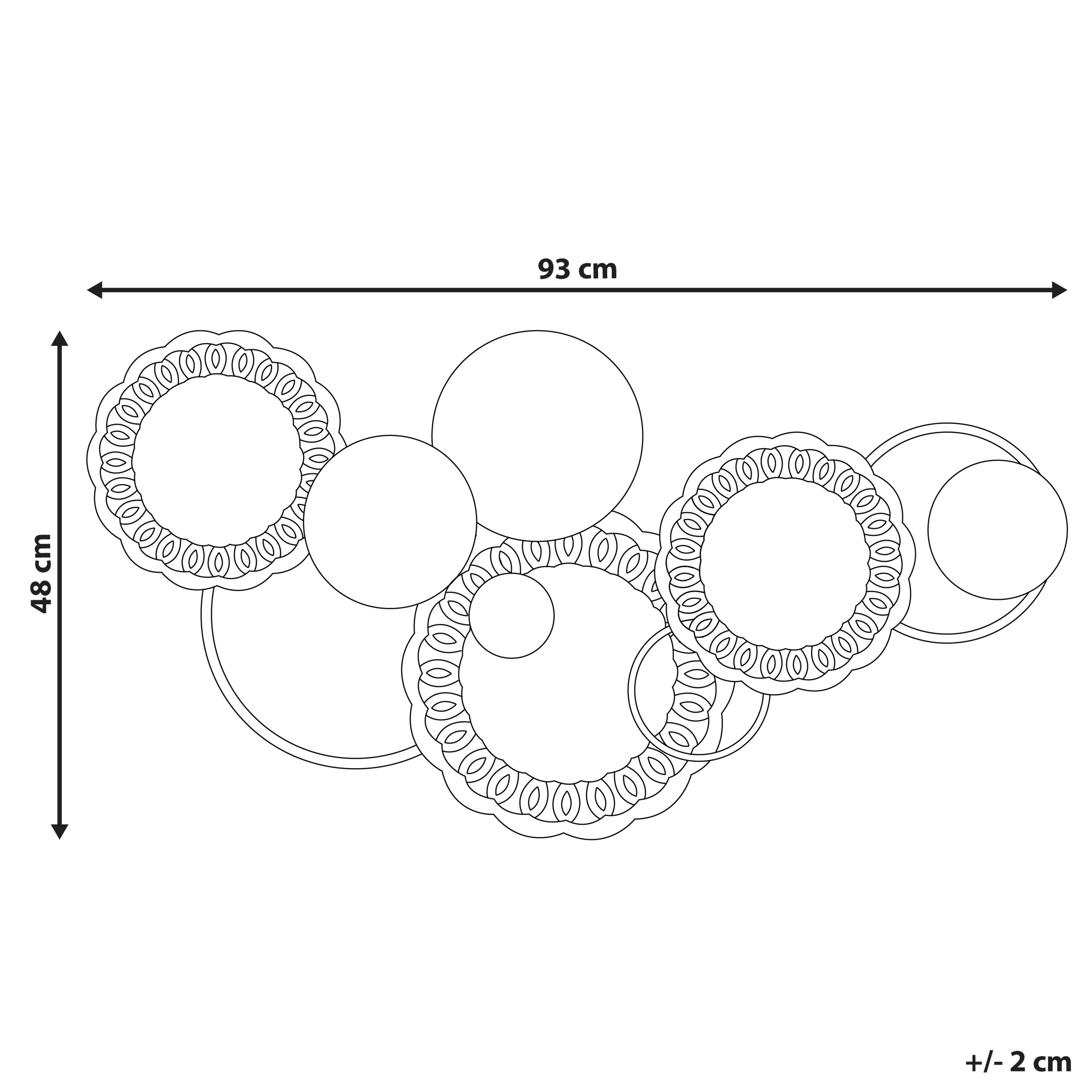 Ainutlaatuinen käsintehty seinätaide. Tässä kestävästä ja vähän huoltoa vaativasta raudasta valmistetussa seinäkoristeessa on useita eri mallisia ja kokoisia ympyräkuvioita, joiden kultaiset yksityiskohdat luovat hienovaraista hohtoa. Seinätaide antaa viehättävän vintage-vaikutelman, joka sopii täydellisesti industriaalisiin ja rustiikkisiin sisustuksiin. Ainutlaatuisen teoksen ripustaminen seinälle on vaivatonta sen takana olevien kätevien koukkujen ansiosta.