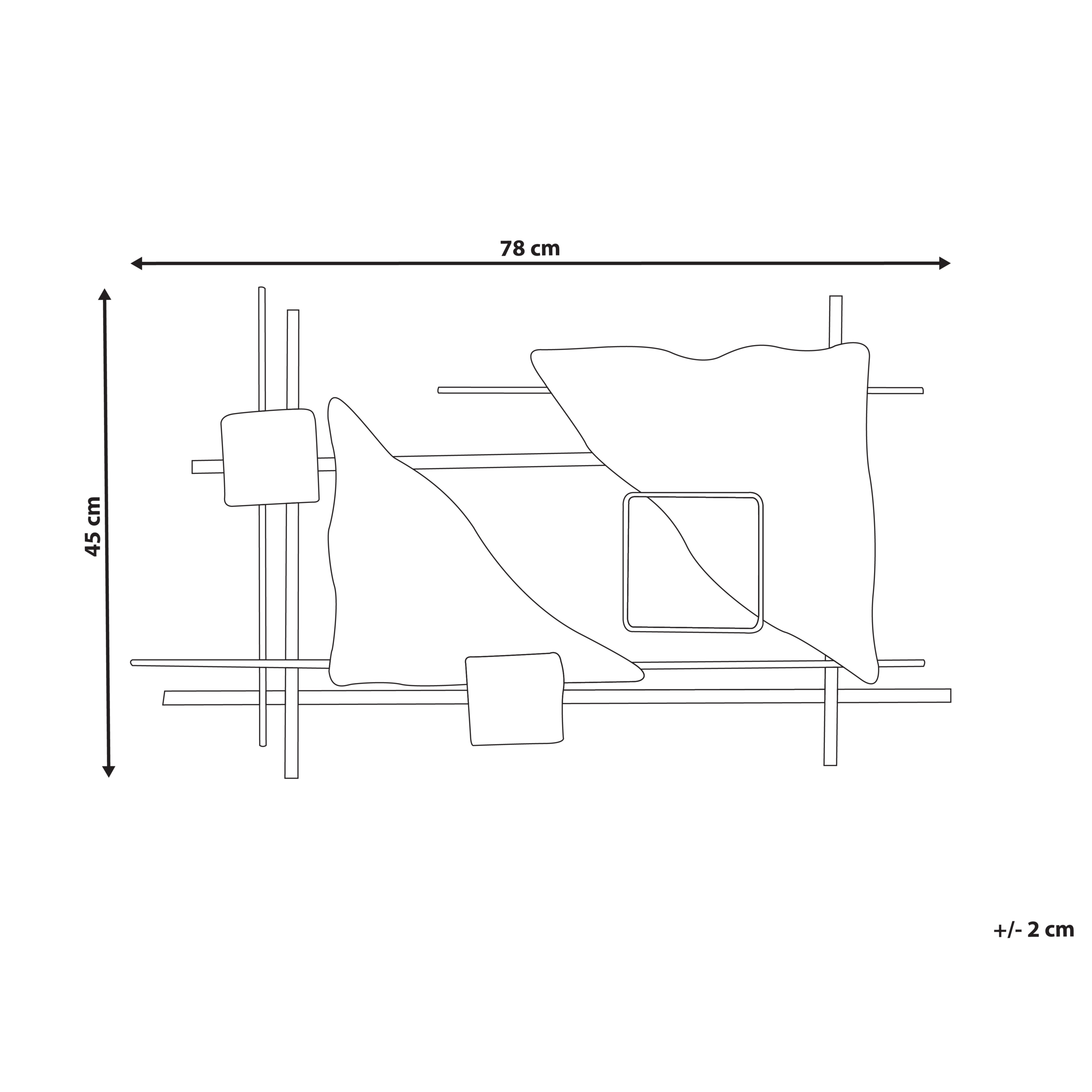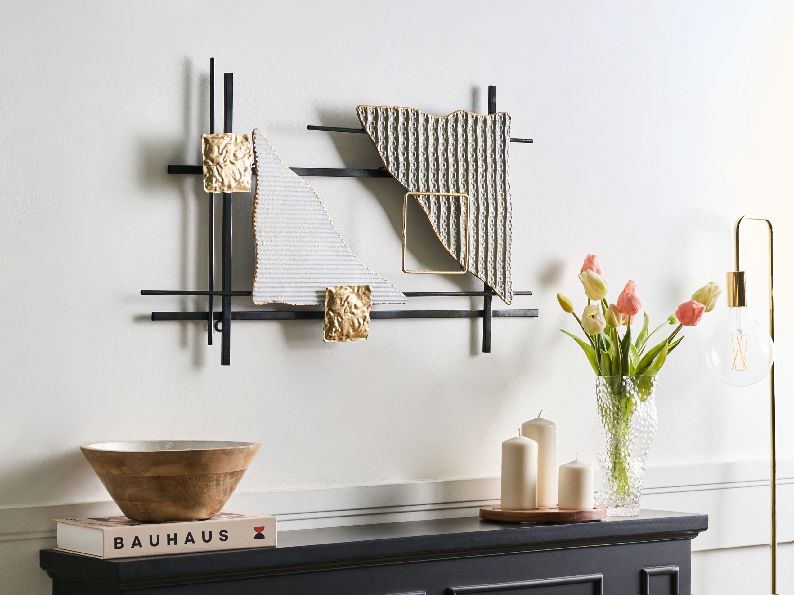 Käsintehty abstrakti seinäkoriste. Määritä seinägalleria uudelleen tällä rohkealla, raudasta valmistetulla seinäkoristeella, joka yhdistää modernin muotoilun ja hienostuneen eleganssin. Abstrakti kokonaisuus koostuu geometrisista muodoista, joita kehystävät taakse asetetut mustat viivat. Yhdessä ne luovat ainutlaatuisen estetiikan, joka sulautuu kauniisti osaksi mitä tahansa nykyaikaista sisustusta. Kullanväriset korosteet lisäävät hienovaraisen ripauksen glamouria ja tekevät koristeesta todellisen katseenvangitsijan, joka sopii moniin tiloihin, aina makuuhuoneesta eteiseen.