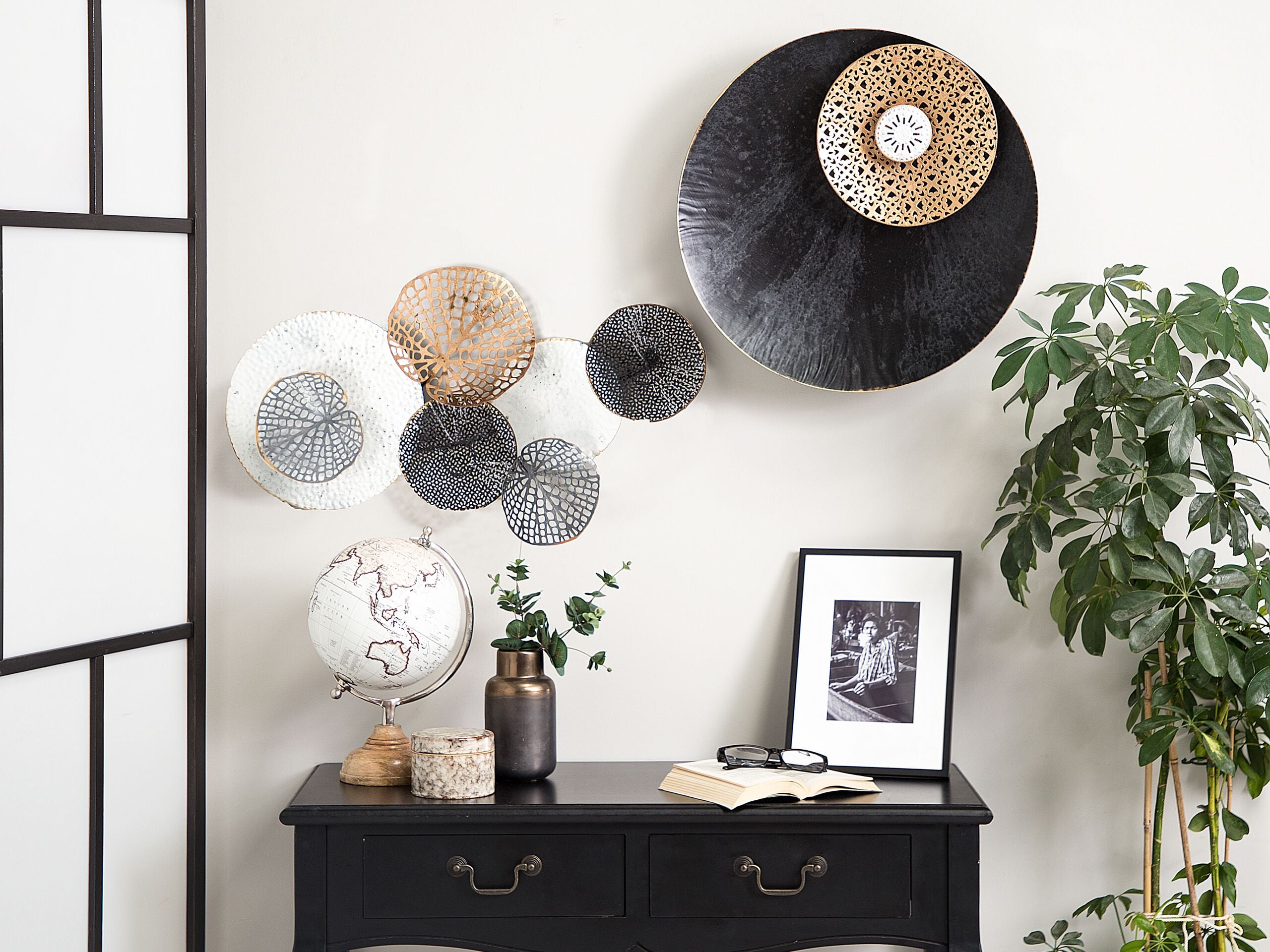 Pyöreä metallinen seinäkoriste. Tämä pyöreä seinäkoriste tyylikkäällä ja yksinkertaisella muotoilulla sopii täydellisesti moniin sisustustyyleihin. Tyylikkäiden värien ja muotoilun avulla luot helposti tyylikkään sisustuksen huoneeseen.