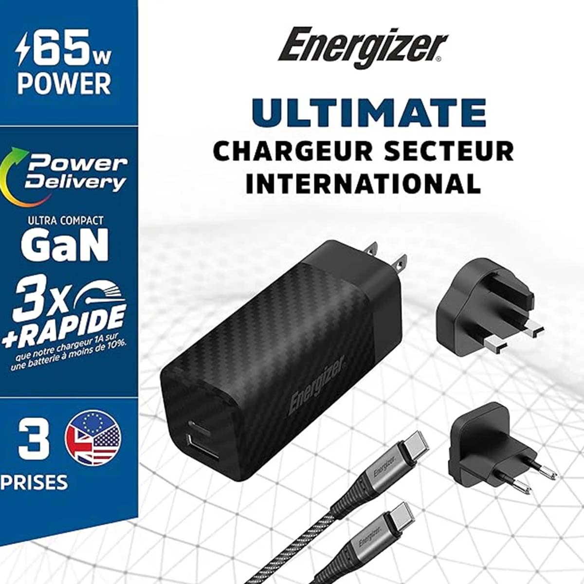 Tämä verkkolaturi syöttää virtaa ja lataa laitteita USB-C Power Delivery -portin kautta USB-A-porttiin, ja sen lähtöteho on 65 W. GaN-teknologia optimoi energianhallinnan ja rajoittaa lämmönhukkaa kompaktissa muodossa. Vaihdettavat verkkosovittimet takaavat yhteensopivuuden eurooppalaisten, brittiläisten ja yhdysvaltalaisten pistokkeiden kanssa. Mukana toimitetaan USB-C-kaapeli.