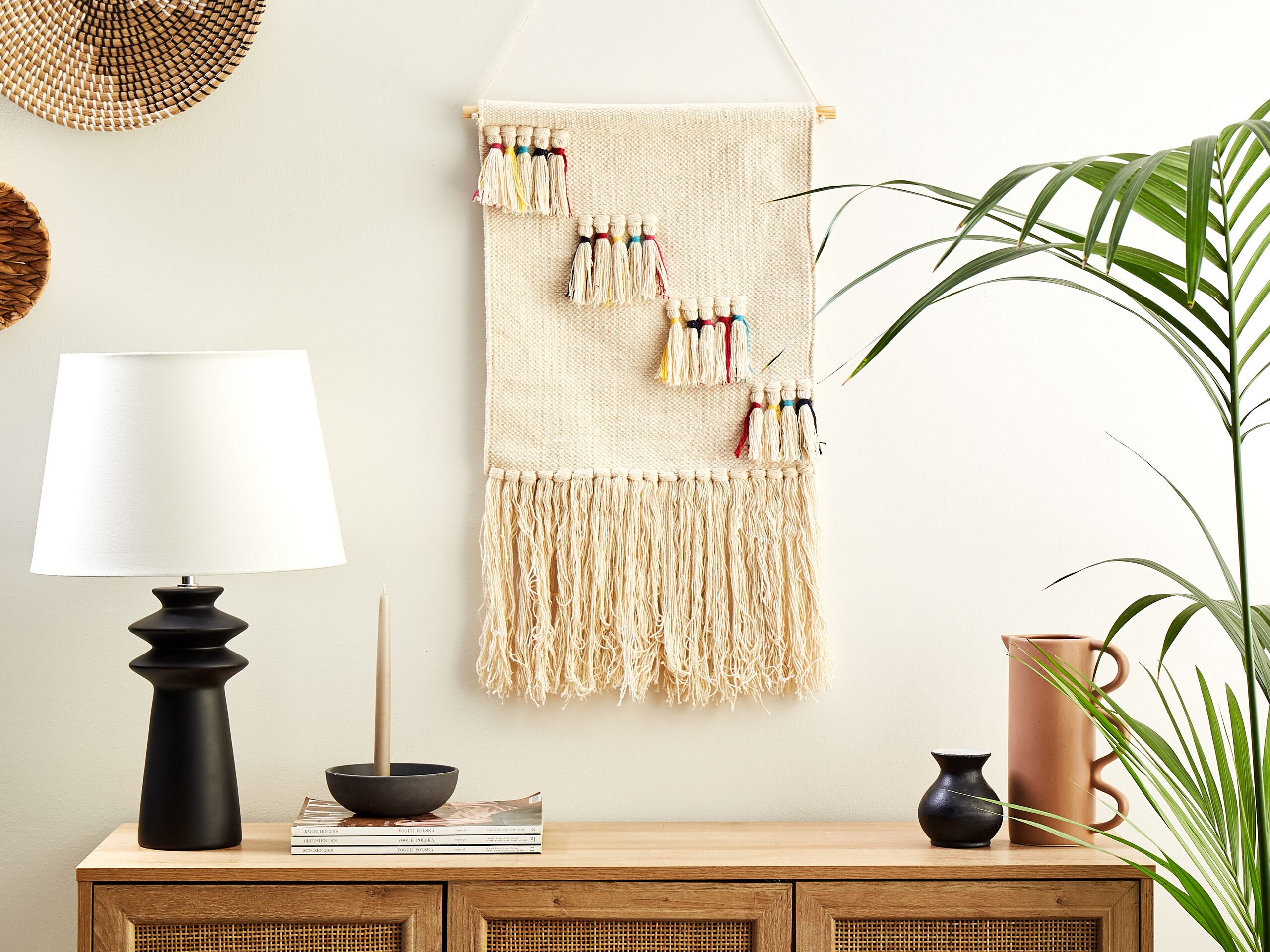 Käsintehty boho-tyylinen seinävaate tupsuilla. Viimeistele sisustuksesi ja anna sille kodikas ilme tällä seinäkoristeella. Puuvillasta käsinpunottua seinävaatetta koristavat kauniit tupsut, joissa on hienovaraiset moniväriset korosteet. Koriste on tuo ripauksen boho-tyyliä mihin tahansa tilaan, makuuhuoneesta olohuoneeseen. Lisäksi se sopii täydellisesti myös lastenhuoneeseen.