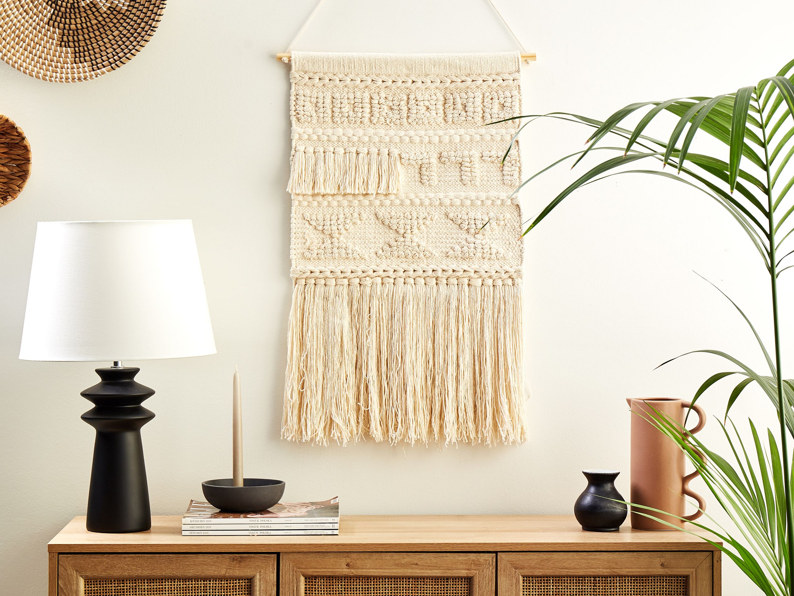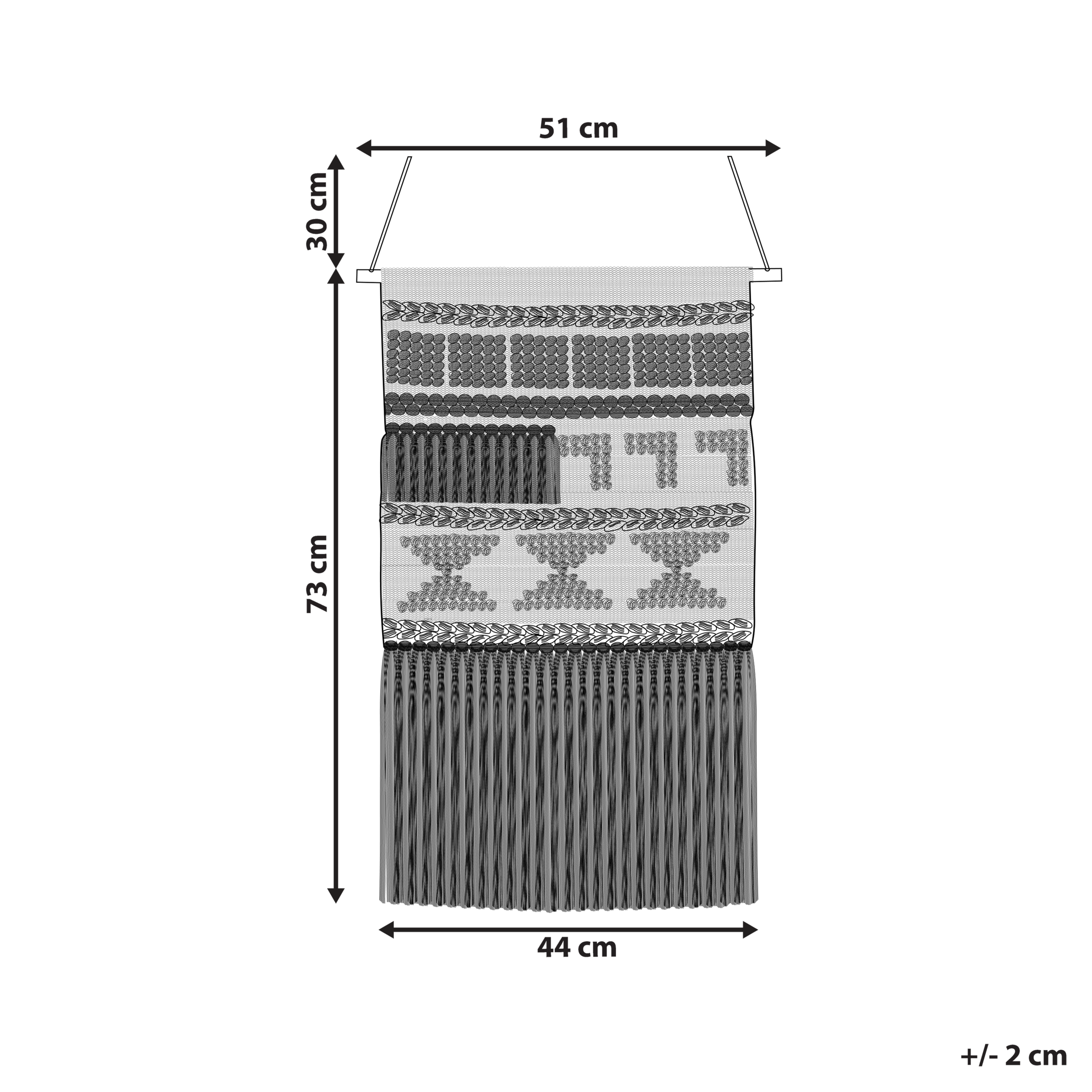 Käsintehty boho-tyylinen seinävaate tupsuilla. Tämä tyylikäs seinäkoriste tuo ripauksen boho-tyyliä ja kodikasta tunnelmaa mihin tahansa tilaan. Seinävaate on valmistettu käsin puuvillasta yksityiskohtiin huomiota kiinnittäen. Koriste on kevyt, jonka ansiosta se on helppo ripustaa seinälle. Aistikas geometrinen kuviointi ja suloiset tupsut tekevät siitä ainutlaatuisen lisän mihin tahansa sisustukseen.