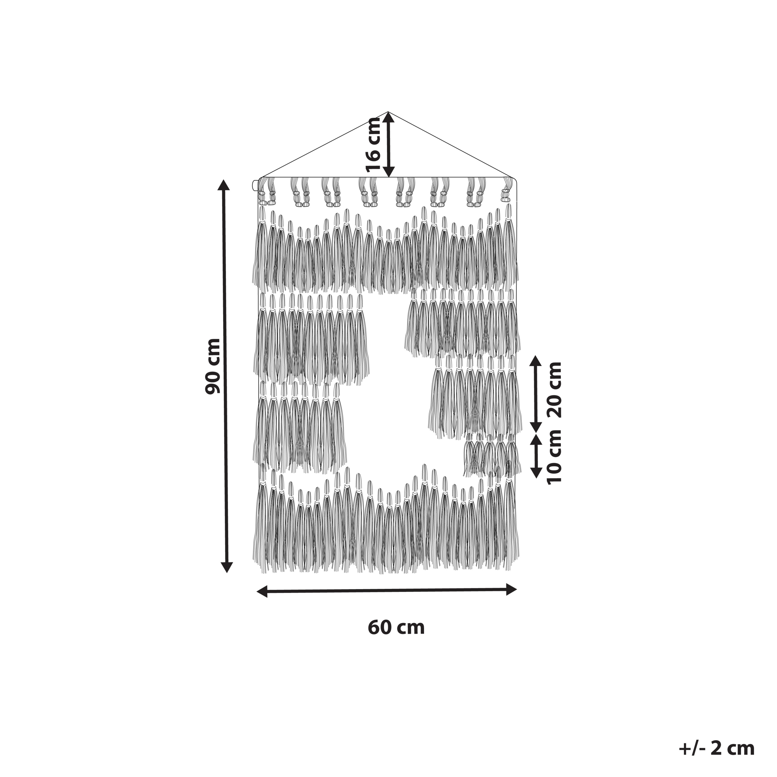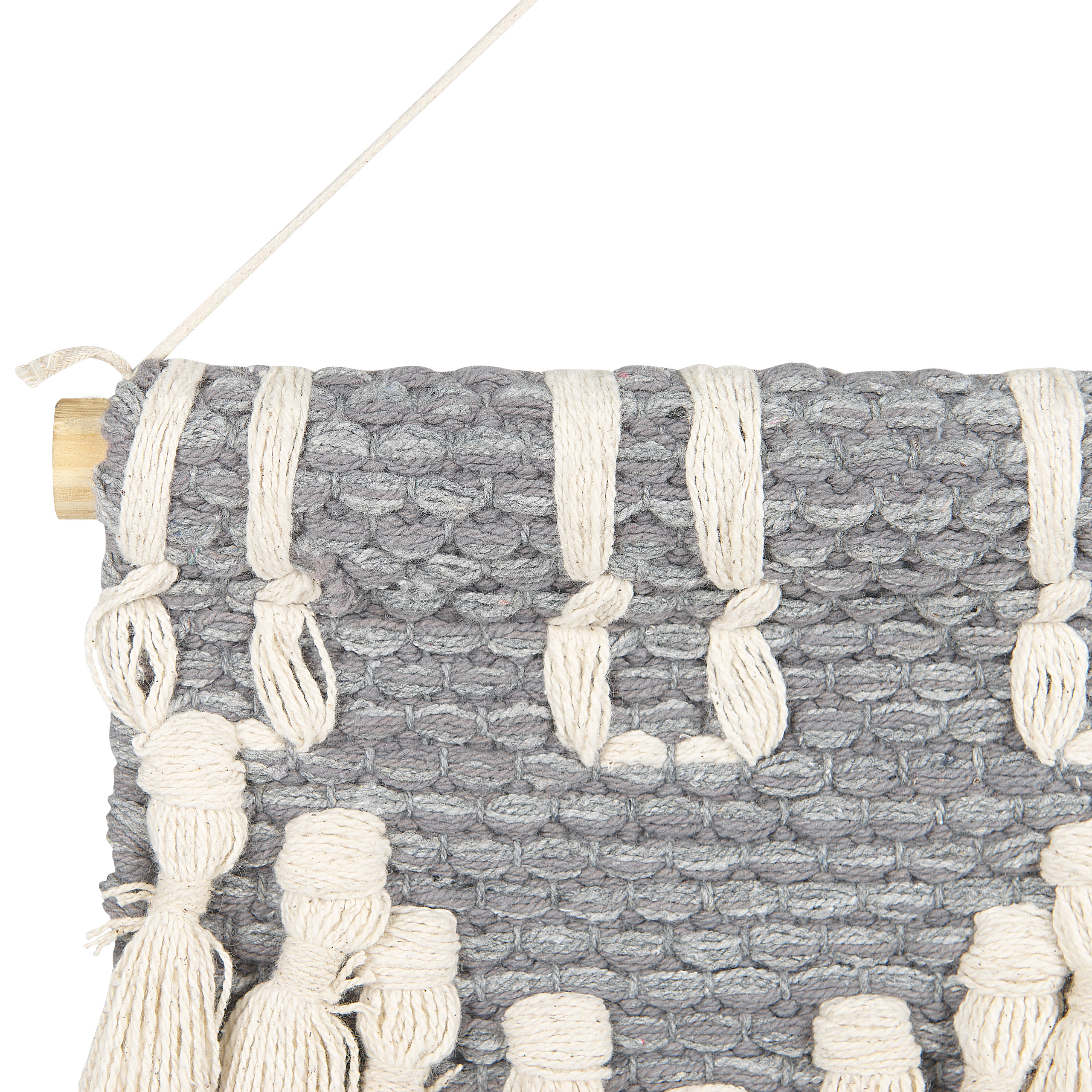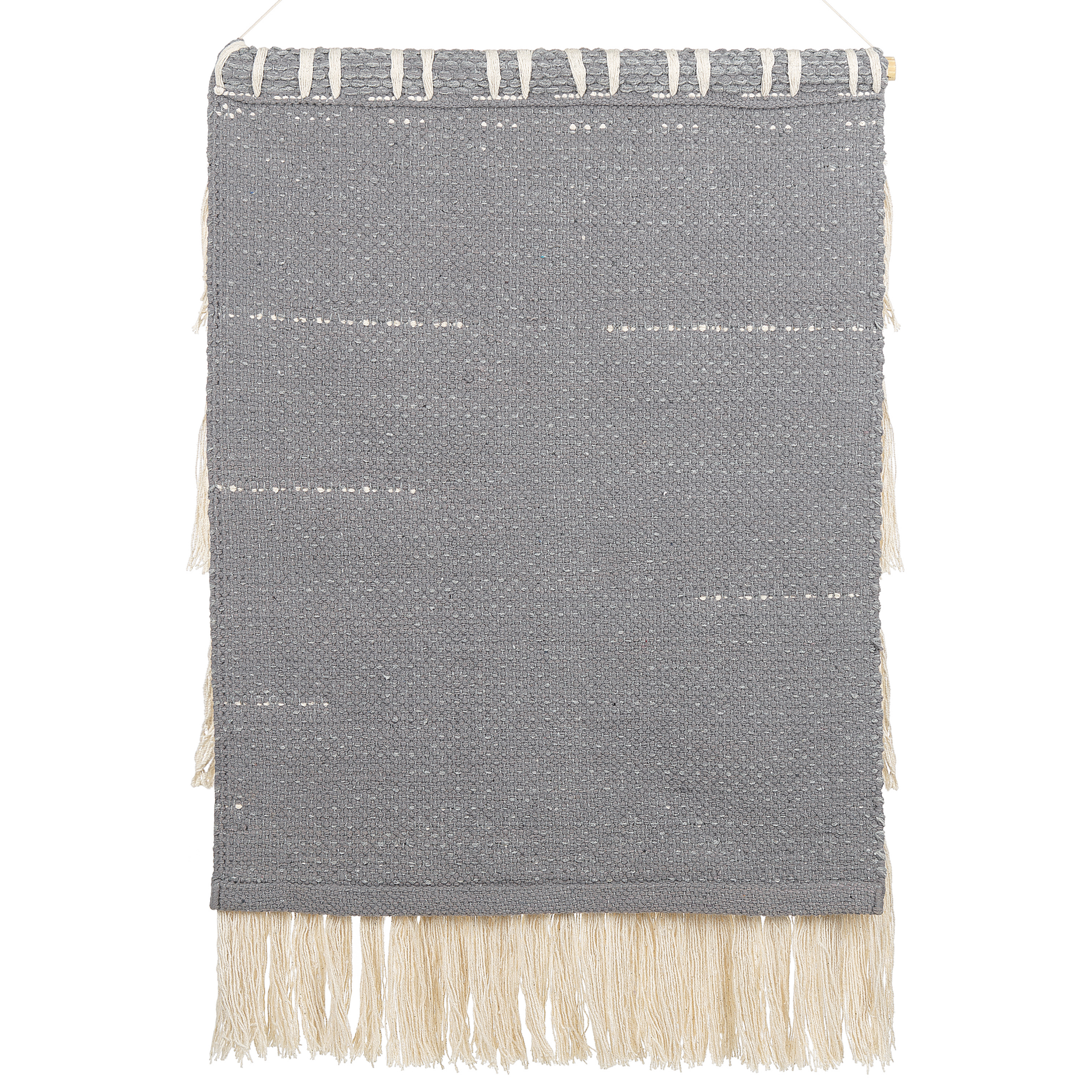 Pieni seinävaate hapsuilla. Tämä boheemia tyyliä ja modernia tyylikkyyttä yhdistelevä seinävaate on kiehtova lisä tilaan kuin tilaan. Tässä käsintehdyssä puuvillatuotteessa on tyylikäs harmaa tausta, jota koristavat herkät beigenväriset tupsut, jotka tuovat ripauksen tekstuuria ja kotoisuuden tunnetta mihin tahansa sisustukseen. Ripustin takaa turvallisen ja helpon ripustamisen niin olohuoneeseen, makuuhuoneeseen kuin eteiseenkin.