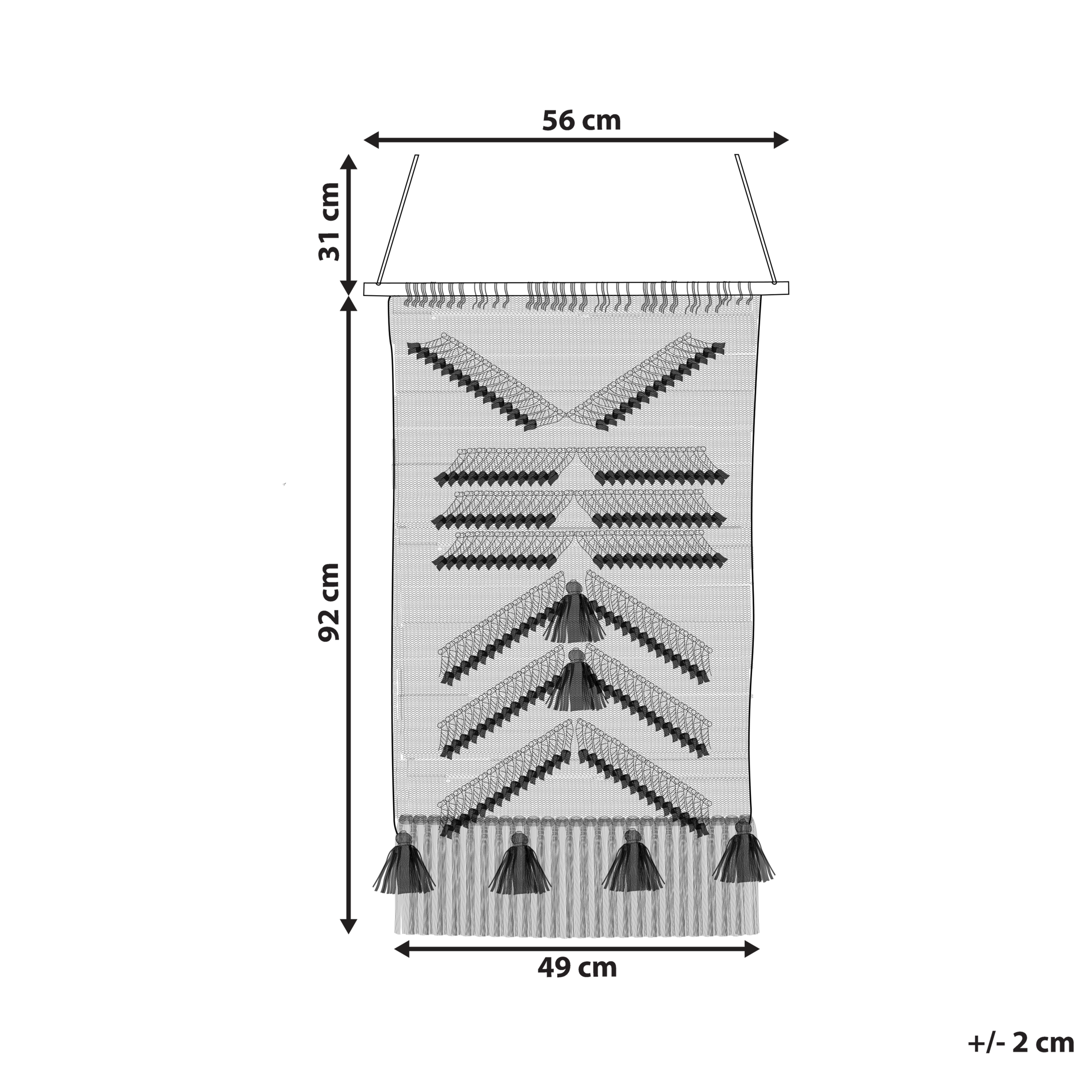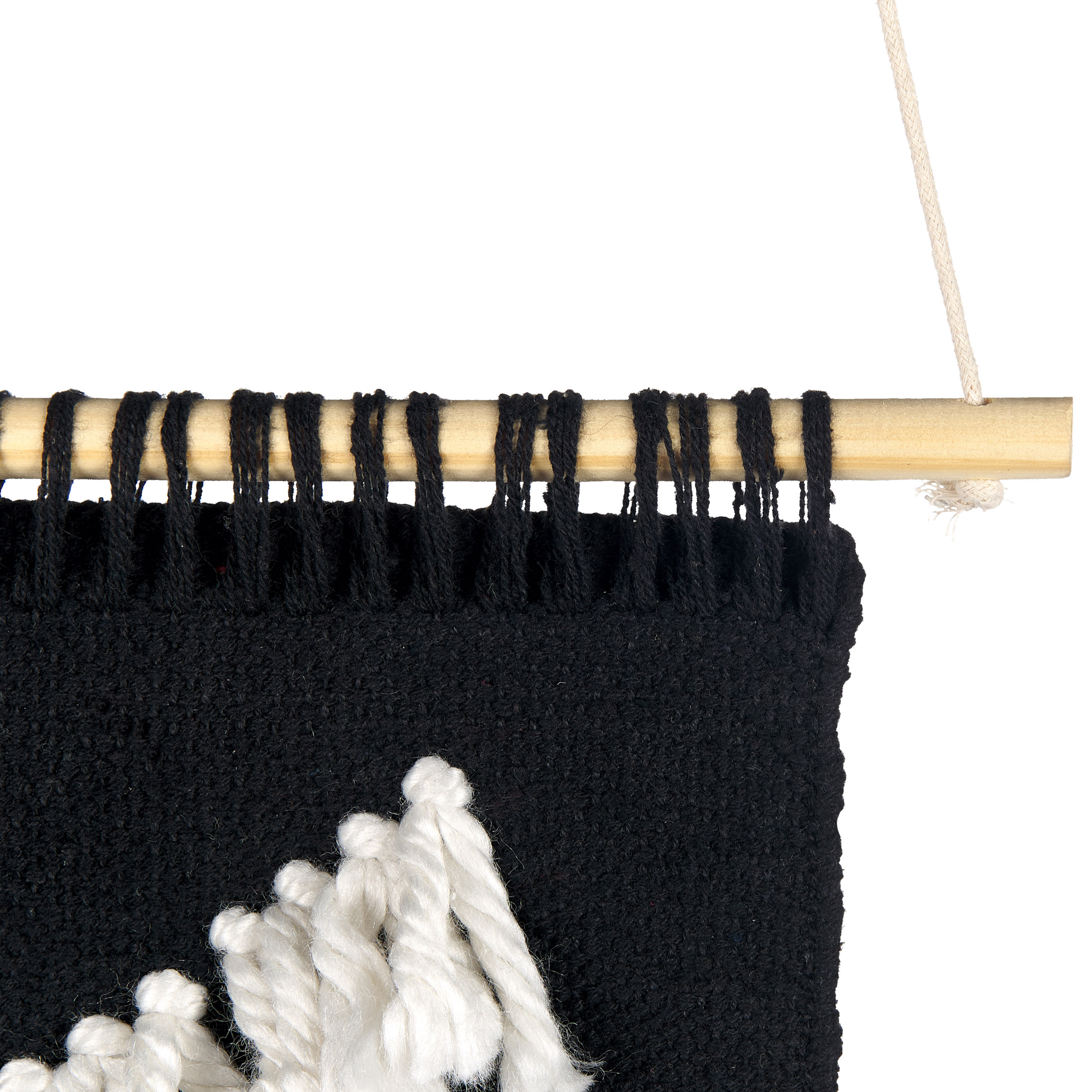 Käsintehty boho-tyylinen seinävaate hapsuilla. Tämä upea seinäkoriste on täydellinen boho-tyylinen koroste mihin tahansa tilaan. Valkoisilla hapsuilla ja pinkeillä tupsuilla koristeltu musta seinävaate on katseita keräävä lisä, joka sopii loistavasti moniin erilaisiin sisustuksiin. Koriste on valmistettu käsin korkealaatuisesta puuvillasta, jonka ansiosta se on kestävä, kevyt ja miellyttävän tuntuinen.
