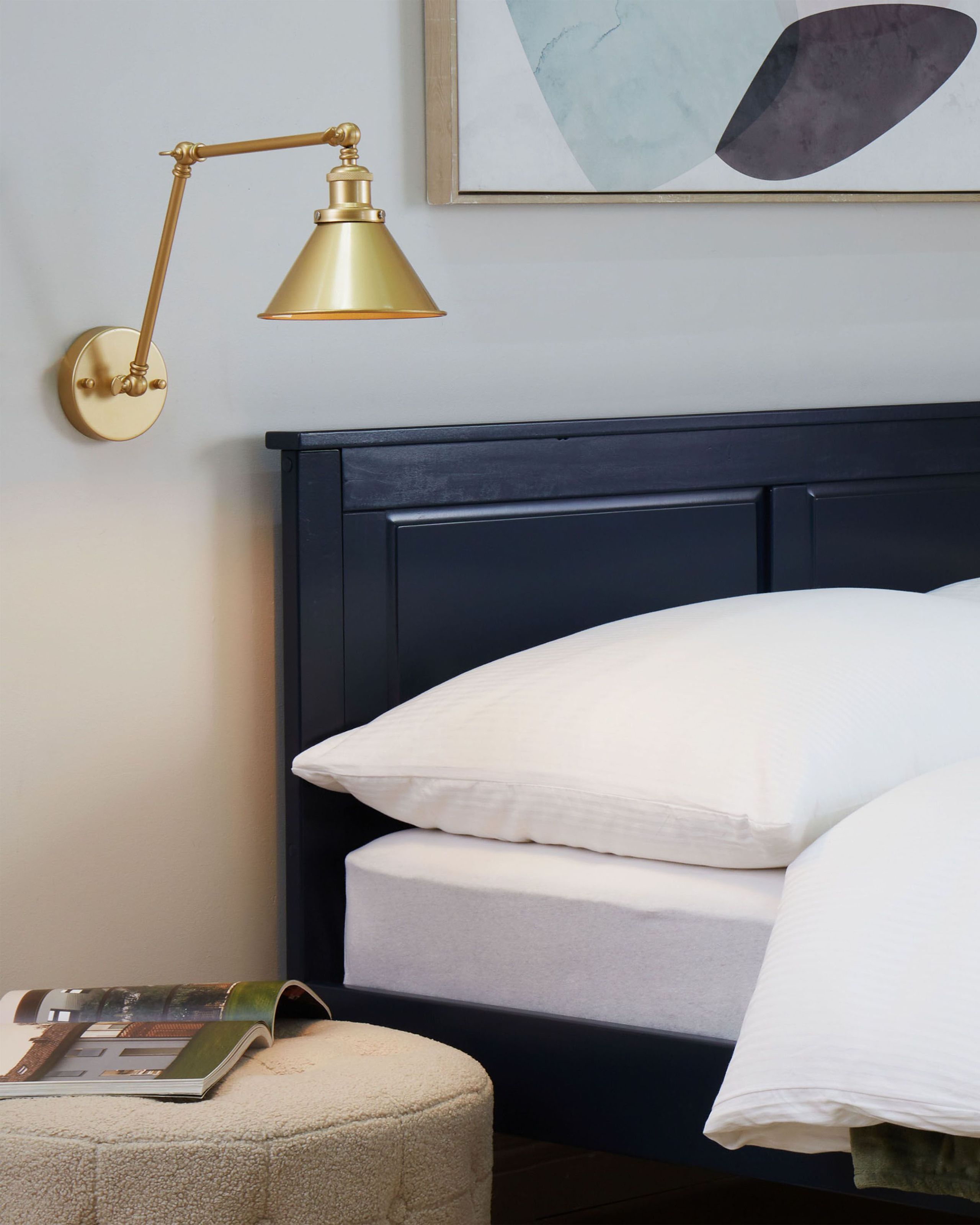 Säädettävä seinävalaisinsetti. Ajattoman tyylisesti suunniteltu seinävalaisinsetti sopii erinomaisesti niin moderneihin, klassisiin kuin industriaalisiinkin kodin sisustuksiin. Säädettävän varren ja varjostimen ansiosta ne ovat helposti muunneltavissa tarpeidesi mukaan ja toimivat loistavasti myös yövalaisimina. Kullanväriseksi maalattu kartiovarjostin lisää eleganttia ilmettä.