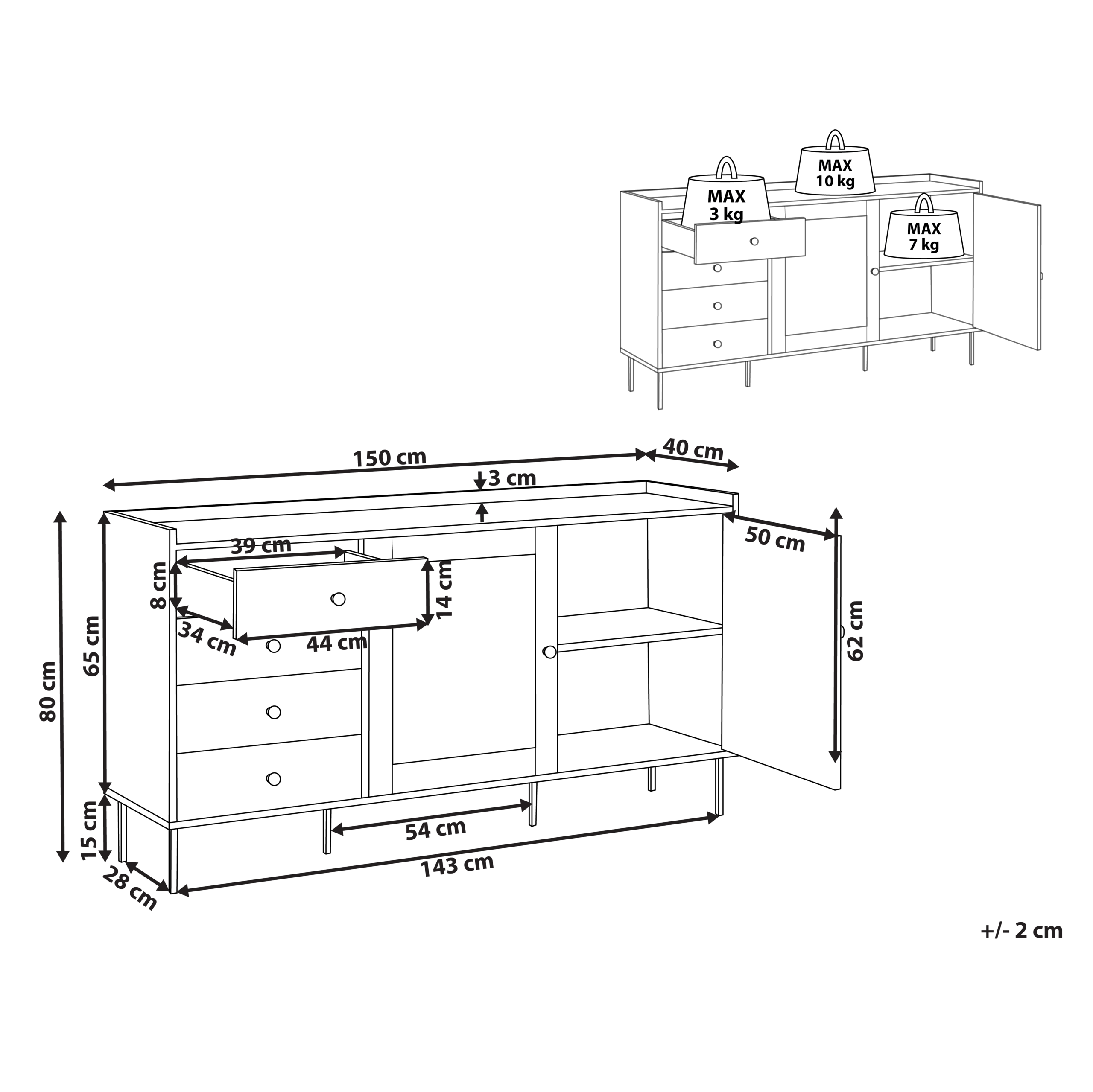 Skandinaavinen kaappi hyllyillä ja laatikoilla. Tämä senkki lisää mihin tahansa ruokailutilaan tai olohuoneeseen ripauksen hienostuneisuutta ajattomalla valkoisen ja mustan yhdistelmällään. Laatikoiden ja hyllyllisen kaapin yhdistelmä pitää sotkun poissa näkyvistä, helpottaen ruokailuvälineiden ja muiden kodin tarvikkeiden säilyttämistä. Se on valmistettu laminoidusta lastulevystä, mikä tekee senkistä monipuolisen valinnan, joka sopii sekä nykyaikaisiin että skandinaavisiin sisustuksiin.