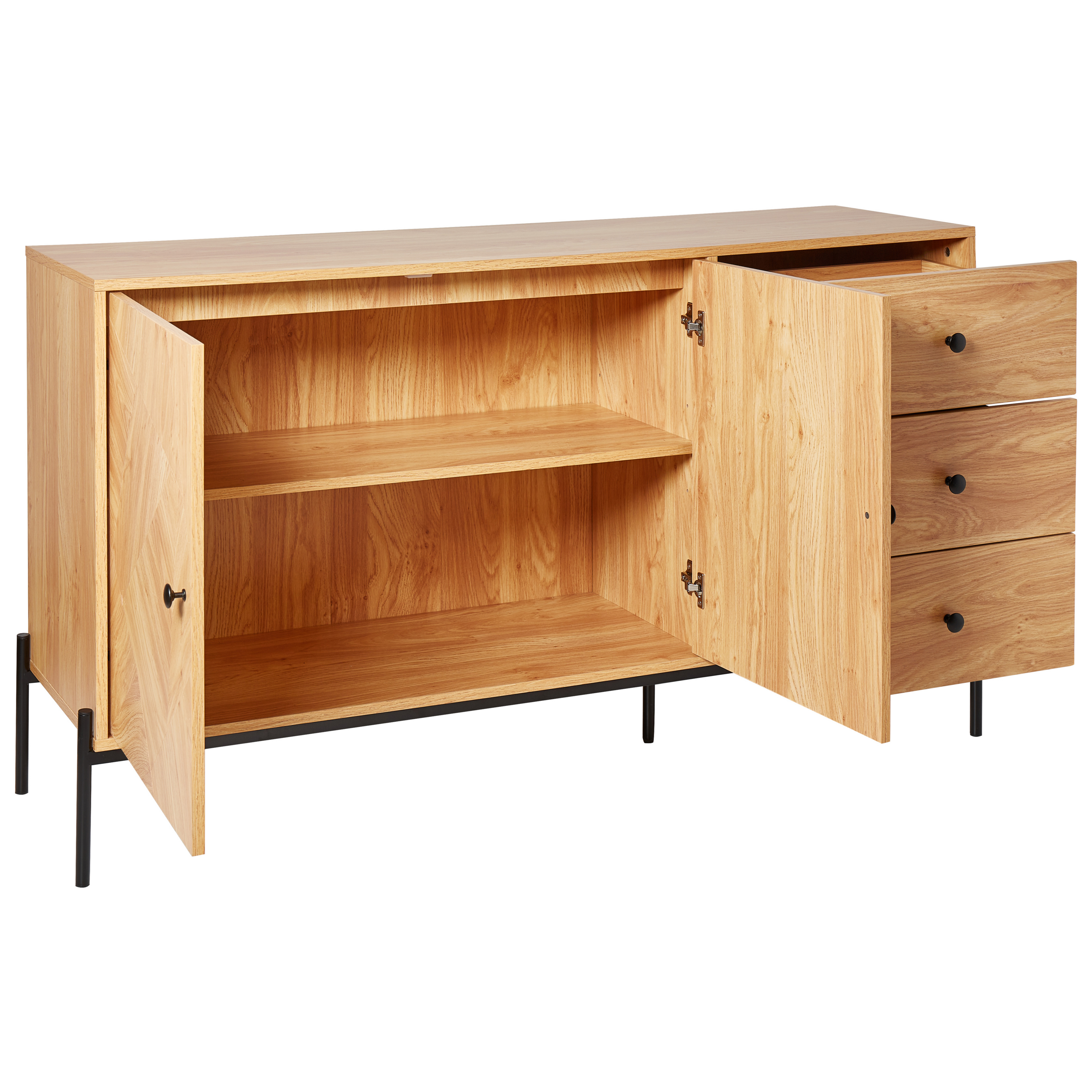 Tilava olohuoneen kaappi. Tämä tyylikäs senkki yhdistää retrohenkistä charmia ja modernia toiminnallisuutta, luoden säilytyskokonaisuuden, joka pitää välttämättömät tavarat järjestyksessä ja poissa näkyvistä. Senkissä on kolme tilavaa laatikkoa ja leveä kaappi, jossa on kaksi ovea ja runsaasti hyllytilaa. Vaalea puupinnoite erottuu upeasti mustasta rautajalustasta ja metalliseoskahvoista, jotka tuovat ripauksen industriaalista tunnelmaa. Kaappi sopii erinomaisesti ruokailutilaan, olohuoneeseen tai eteiseen, tarjoten käytännöllistä säilytystilaa ja ajattoman muotoilun, joka kohottaa mitä tahansa sisustustyyliä.