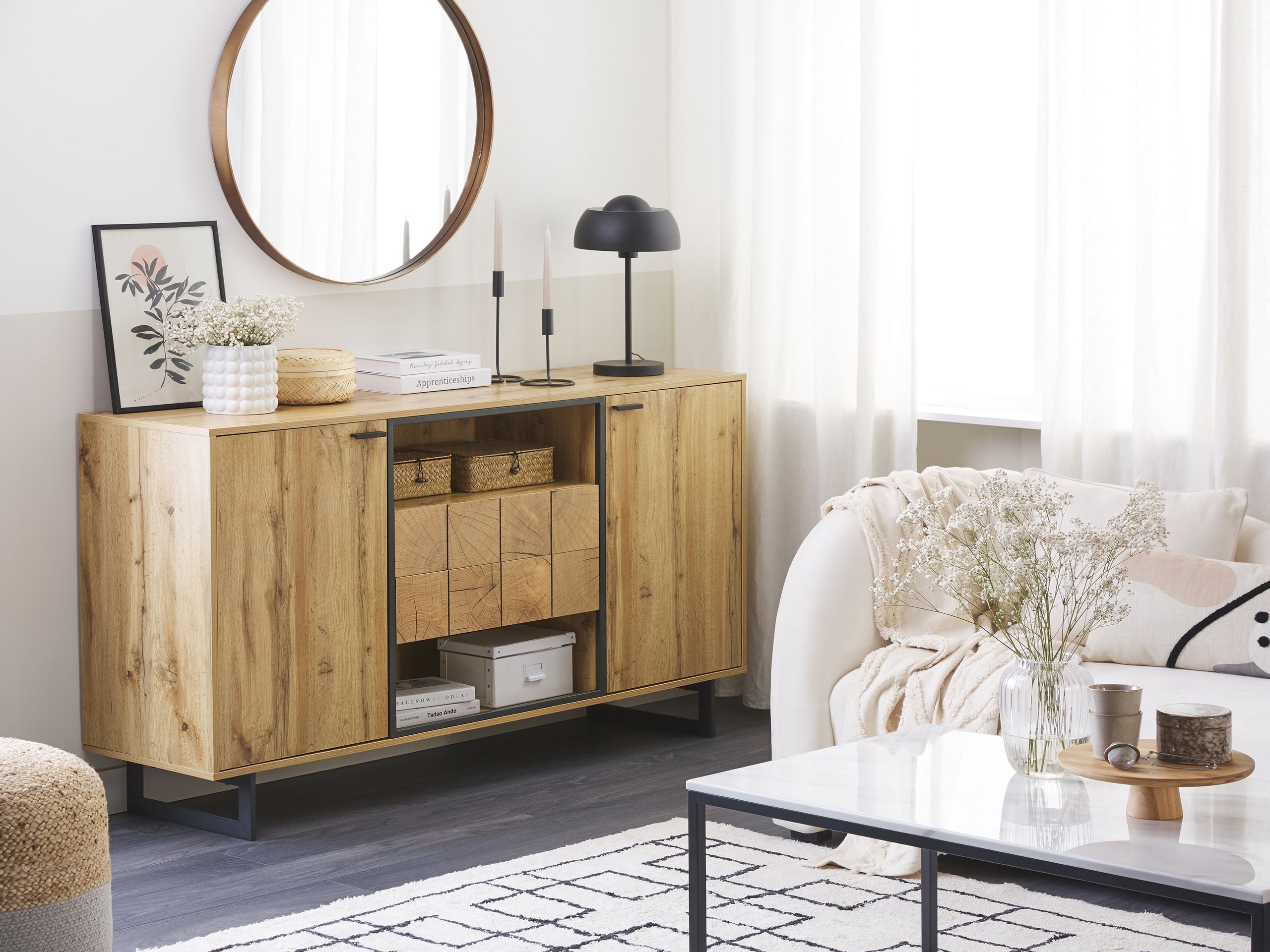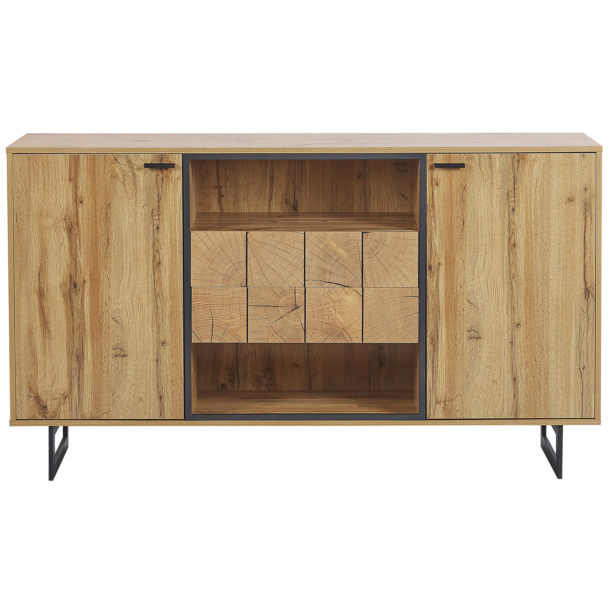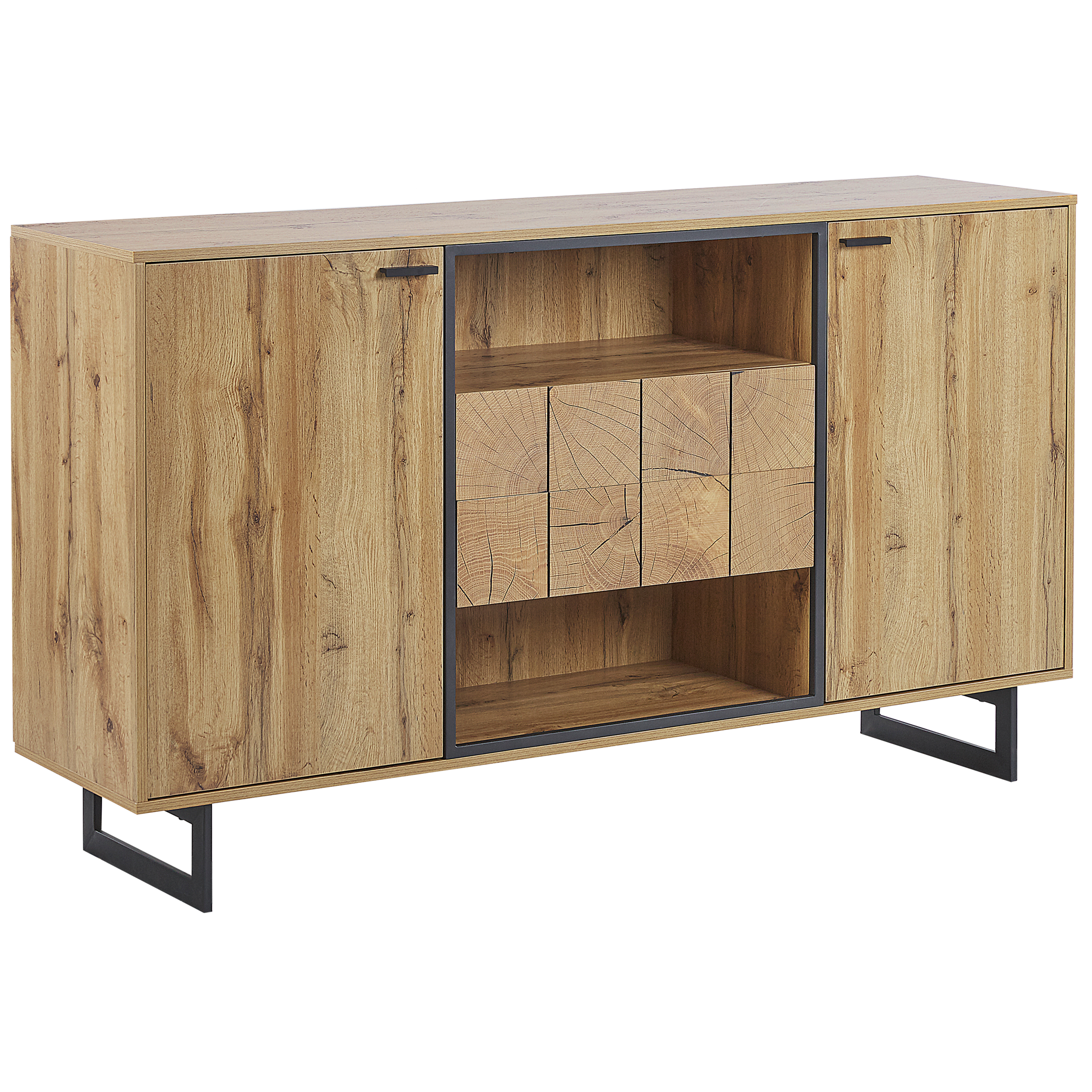 Rustiikkinen senkki kuudella hyllyllä. Tässä lipastossa yhdistyy moderni ja elegantti muotoilu ja ilme. Vaalean puun ja tummien metallijalkojen yksinkertaisuuden ansiosta lipasto sopii moneen sisustukseen, esimerkiksi rustiikkiseen, moderniin ja industriaaliseen. Lipastoon voit järjestellä kirjoja, tärkeitä papereita, pöytäliinoja tai vaikkapa astiastoja. Yksinkertainen design varmistaa käytännöllisyyden tilassa kuin tilassa.