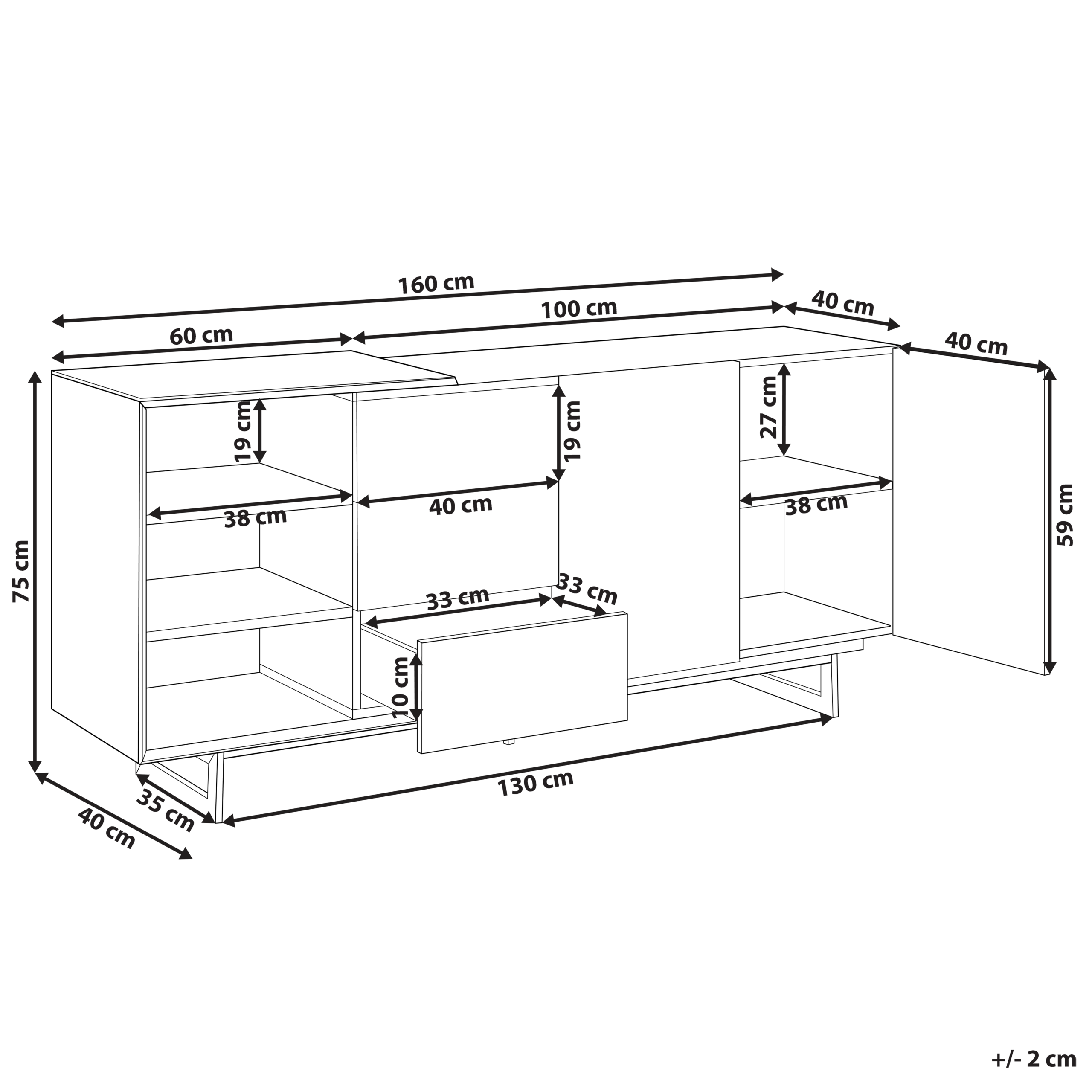 Skandinaavinen senkki hyllyillä ja laatikoilla. Tämä moderni senkki viimeistelee minkä tahansa olohuoneen tai ruokailutilan. Vaalean puunväristen laatikoiden ja kaapin sekä mustien hyllyjen yhdistelmä tekee senkistä tyylikkään ja toimivan lisän mihin tahansa sisustukseen. Sekä laatikot että hyllyt tarjoavat paljon säilytystilaa monille eri tavaroille. Korkealaatuisista materiaaleista valmistetussa senkissä on vankka ja leveä taso, laadukas viimeistely sekä tukevat teräsjalat, jotka takaavat vakauden.
