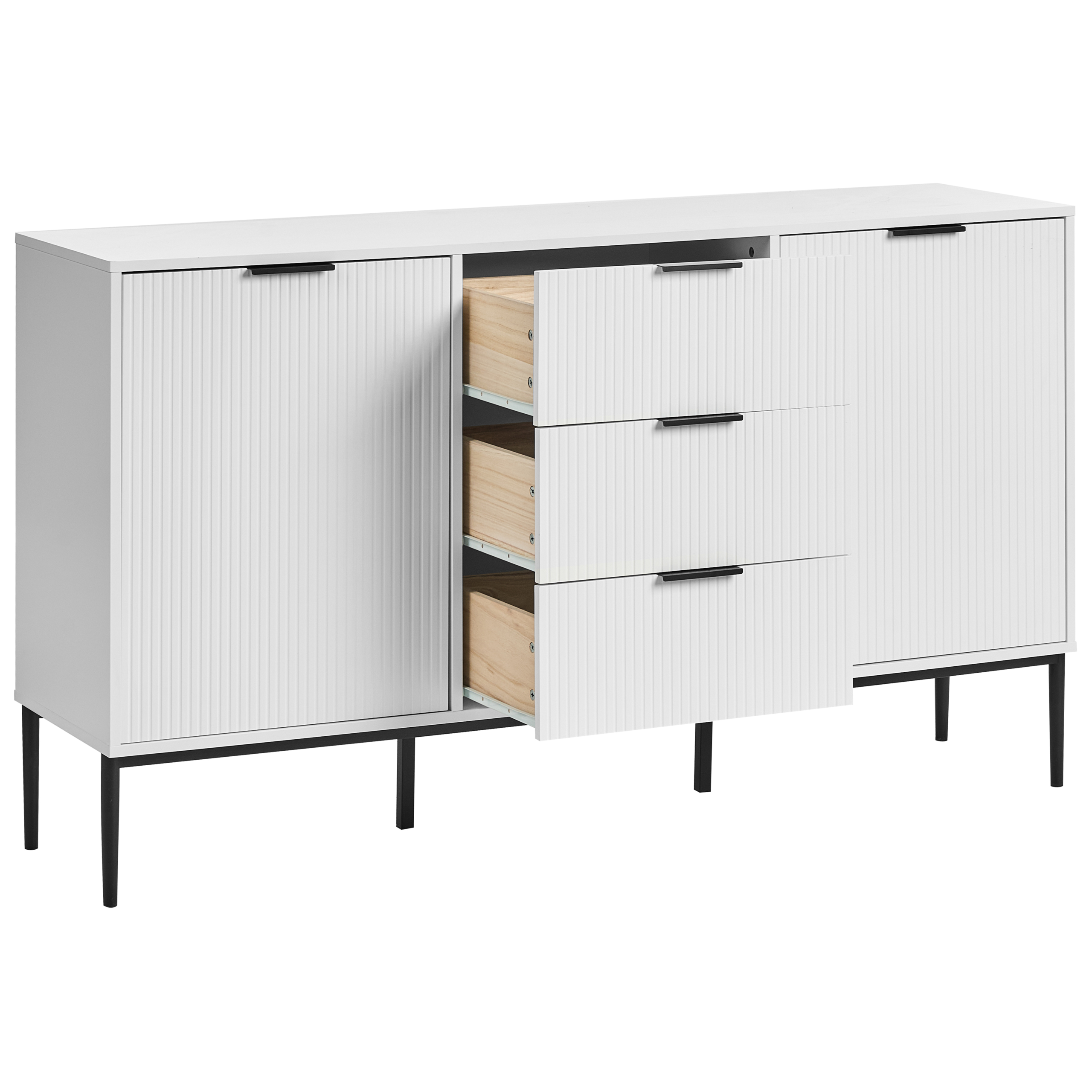 Uurrettu senkki kaapeilla ja laatikoilla. Tämä senkki on täydellinen lisä jokaiseen moderniin tai skandinaaviseen olohuoneeseen tai ruokailutilaan. Kestävästä MDF-levystä valmistetussa rungossa on lakattu pinta, joka antaa kiiltävän, elegantin ilmeen, kun taas mustat rautajalat varmistavat pitkäikäisen vakauden. Uurrettu etuosa lisää muotoiluun tyyliä, ja kolme syvää laatikkoa ja kaksi kaappia, joissa kussakin on kaksi hyllyä, tarjoavat käytännöllistä säilytystilaa erilaisille esineille.