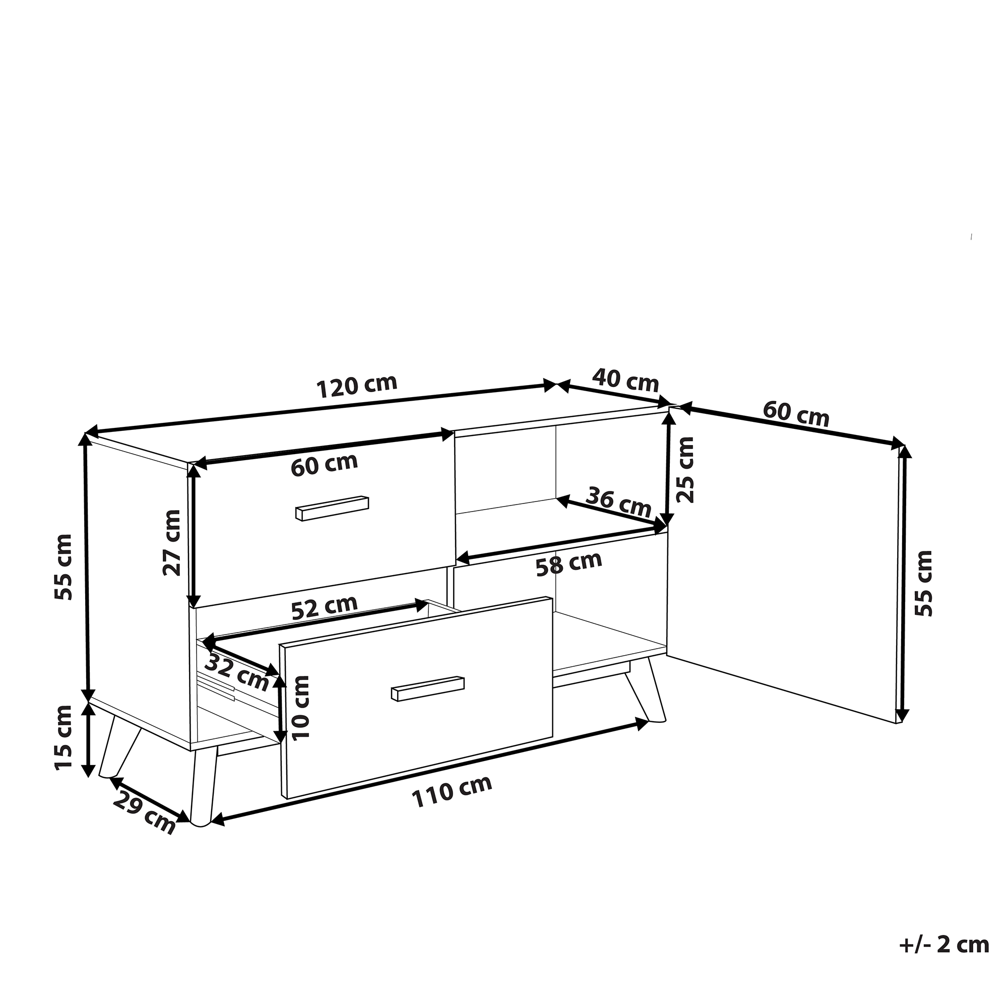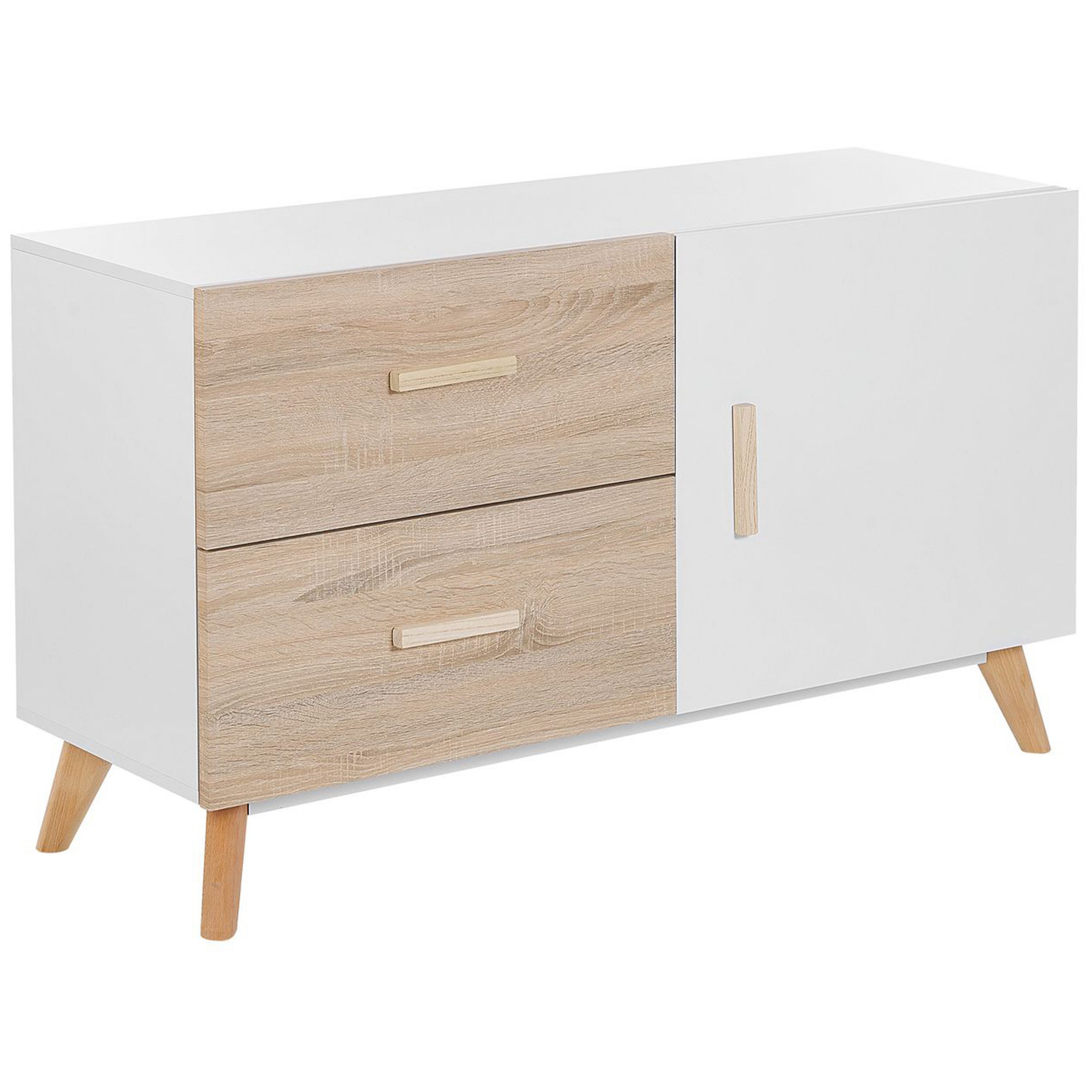 Minimalistinen lipasto hyllyillä ja laatikoilla. Jos etsit kaunista ja käytännöllistä sivupöytää, tämä kaluste on loistava valinta. Lipastossa on kaappi ja kaksi laatikkoa, ja sen lisäksi sen päällä on reilusti säilytystilaa. Voit hyödyntää sivupöytää halutessasi myös tv-tasona. Tuotteen runko on valmistettu kestävästä MDF-levystä ja jalat puusta.