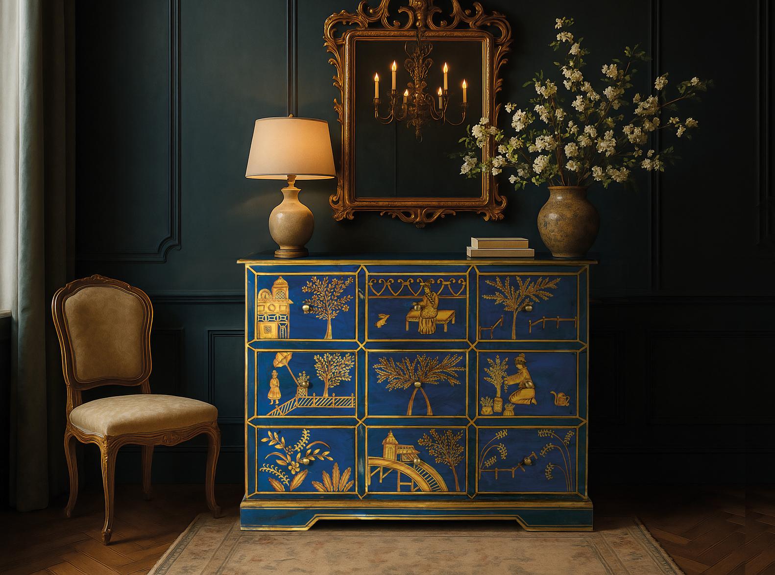 Tämä lipasto on valmistettu mangopuusta ja siinä on yhdeksän laatikkoa. Se on käsinmaalattu kultaisilla kuvituksilla, jotka kuvaavat itämaisia maisemia. Jokaisessa laatikossa on keskellä metallinen kahva. Kaapin pohjassa on hieman ulkoneva muotoiltu sokkeli, joka antaa elegantimman ja tukevamman pinnan samalla lisäten vakautta ja läsnäoloa kokonaisuuteen. Se on erittäin persoonallinen kaappi, joka sopii erinomaisesti boheemiin, vintage- tai eksoottiseen tyyliin sisustettuihin tiloihin. Etuosan mitat: 21 x 33 cm; Laatikon sisämitat: 18 x 31 x 32 cm; Kannen paksuus: 1,6 cm