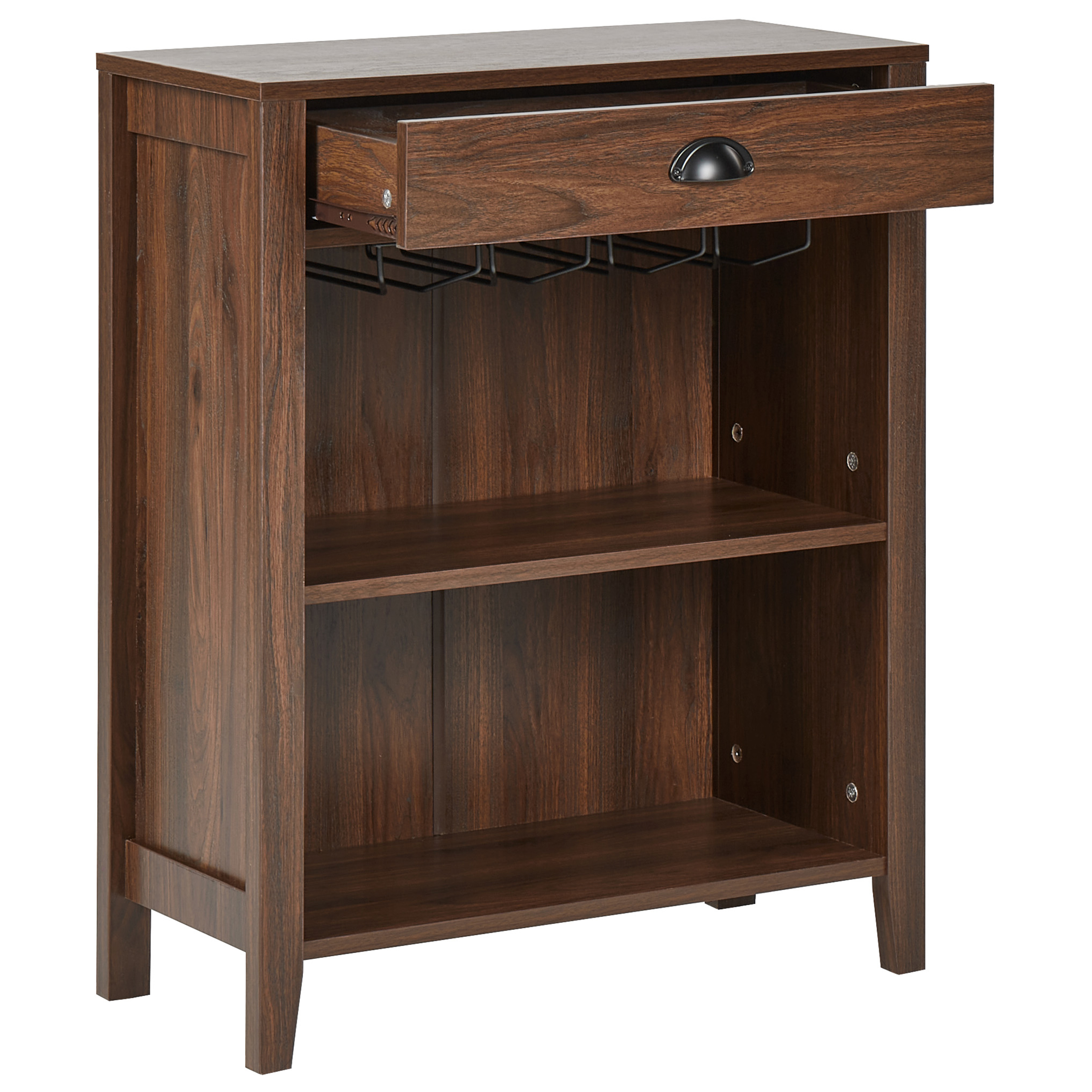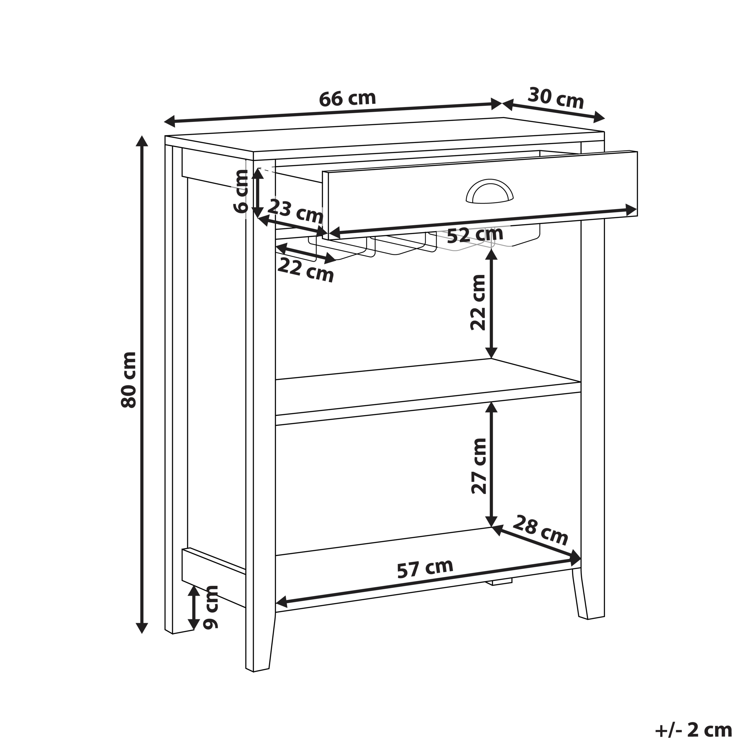 Perinteinen senkki viinilasitelineellä. Tämä retrotyylinen senkki yhdistää toiminnallisuuden ja perinteisen viehätyksen. Siinä on kaksi hyllyä, viinilasiteline sekä kätevä laatikko pikkuesineille. Senkki on valmistettu kestävästä lastulevystä, jonka tumma, puuta imitoiva viimeistely tuo lämpöä ja luonnontuntua mihin tahansa sisustukseen. Ajattoman muotoilunsa ansiosta se on hienostunut lisä jokaiseen tilaan.