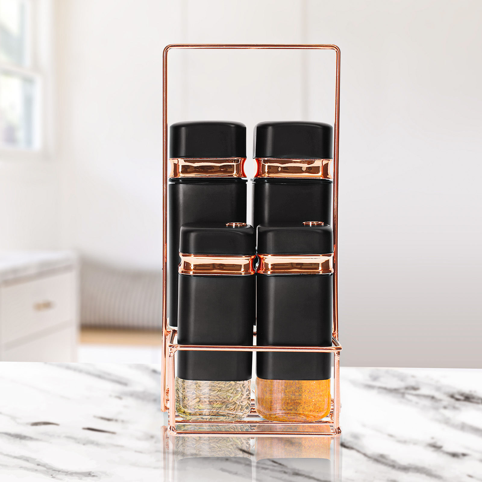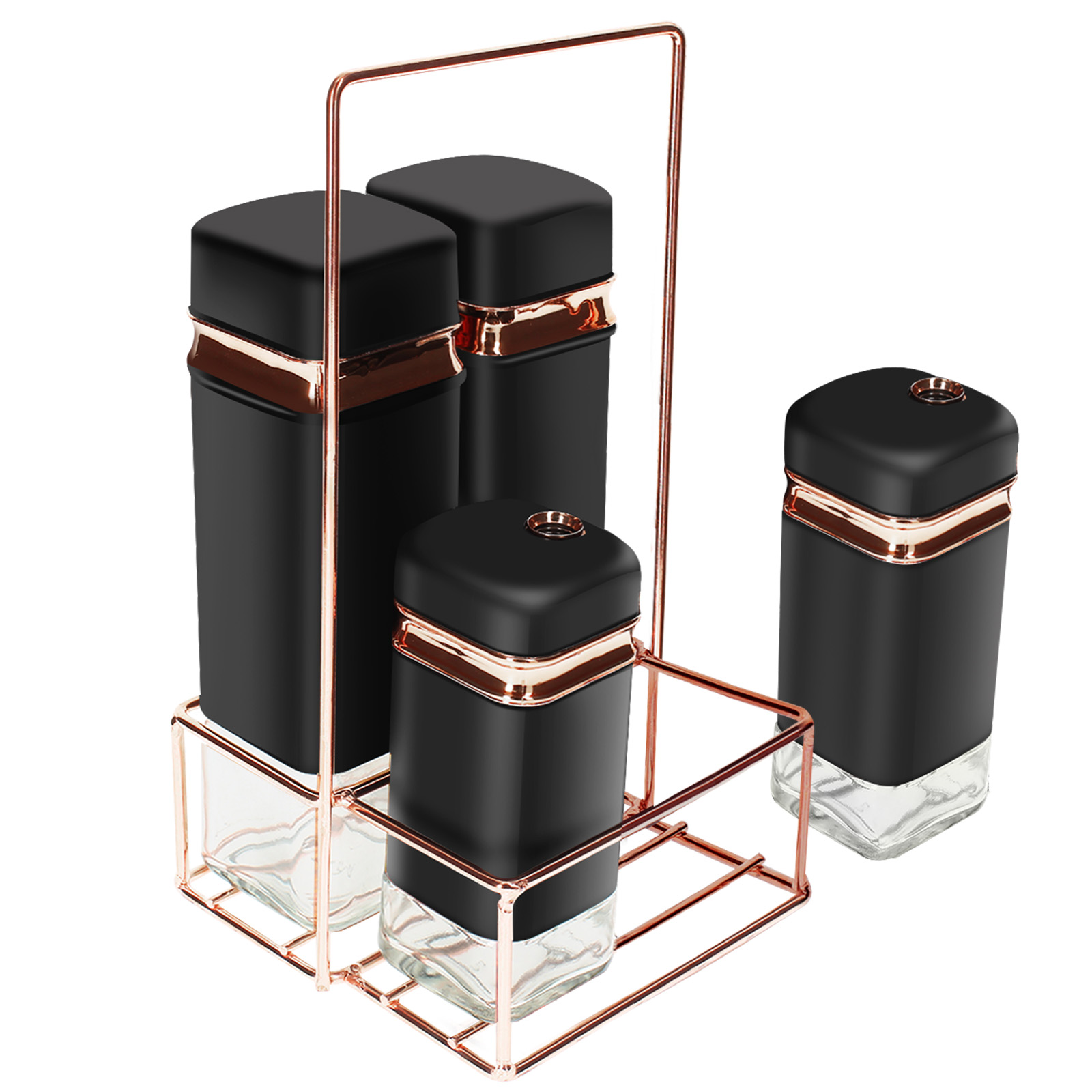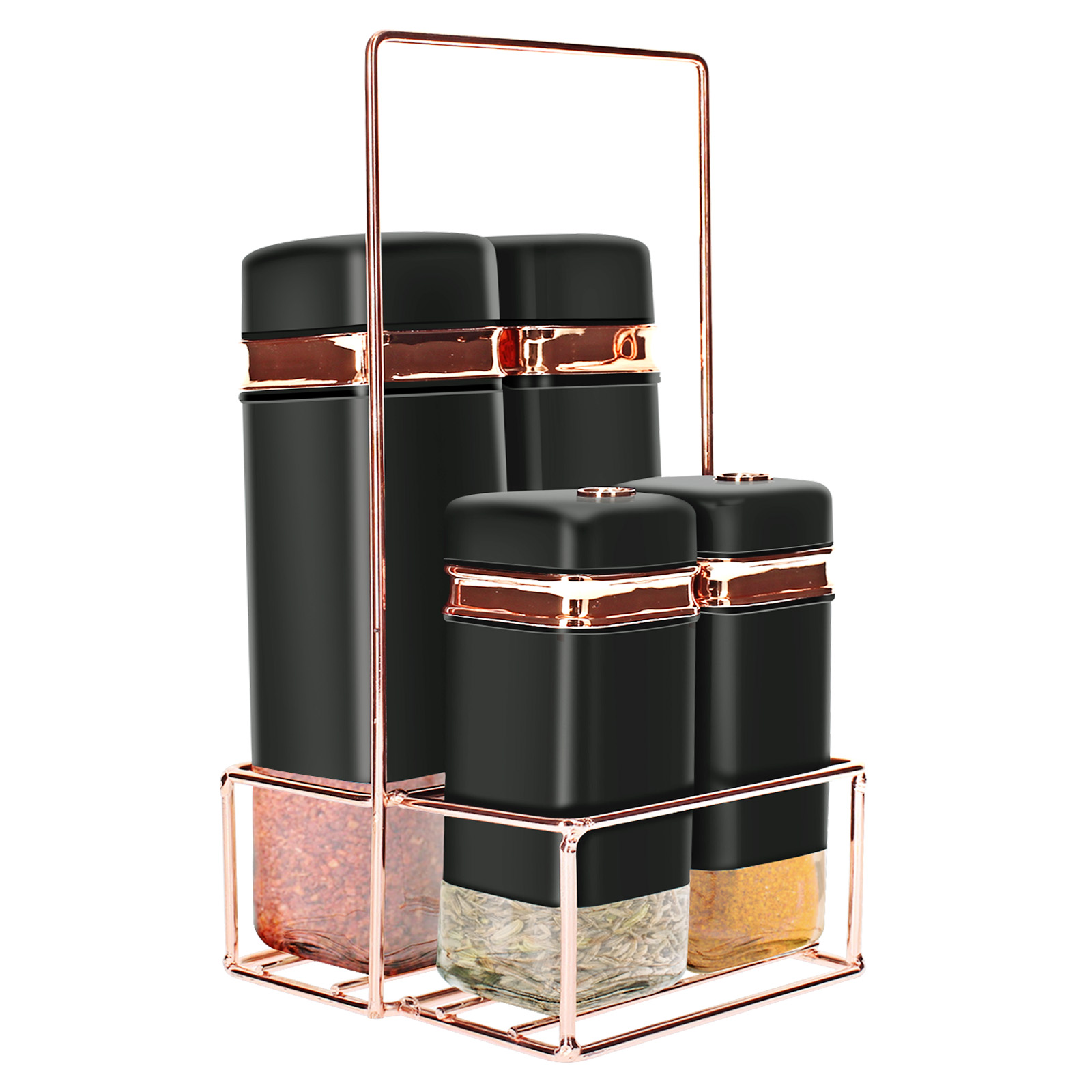 Lisää keittiöösi tyyliä ja järjestystä tällä 4 lasisen maustepurkin sarjalla, kaksi 150 ml:n ja kaksi 250 ml:n purkkia, joissa on mustat metallikannet ja tyylikkäät kuparikoristeet. Kuparinvärisen metallitelineen ansiosta mausteet ja yrtit ovat aina saatavilla, ja se antaa tyylikkään lisän työtasollesi. Ihanteellinen tuoreuden säilyttämiseen ja hienostuneeseen tarjoiluun.