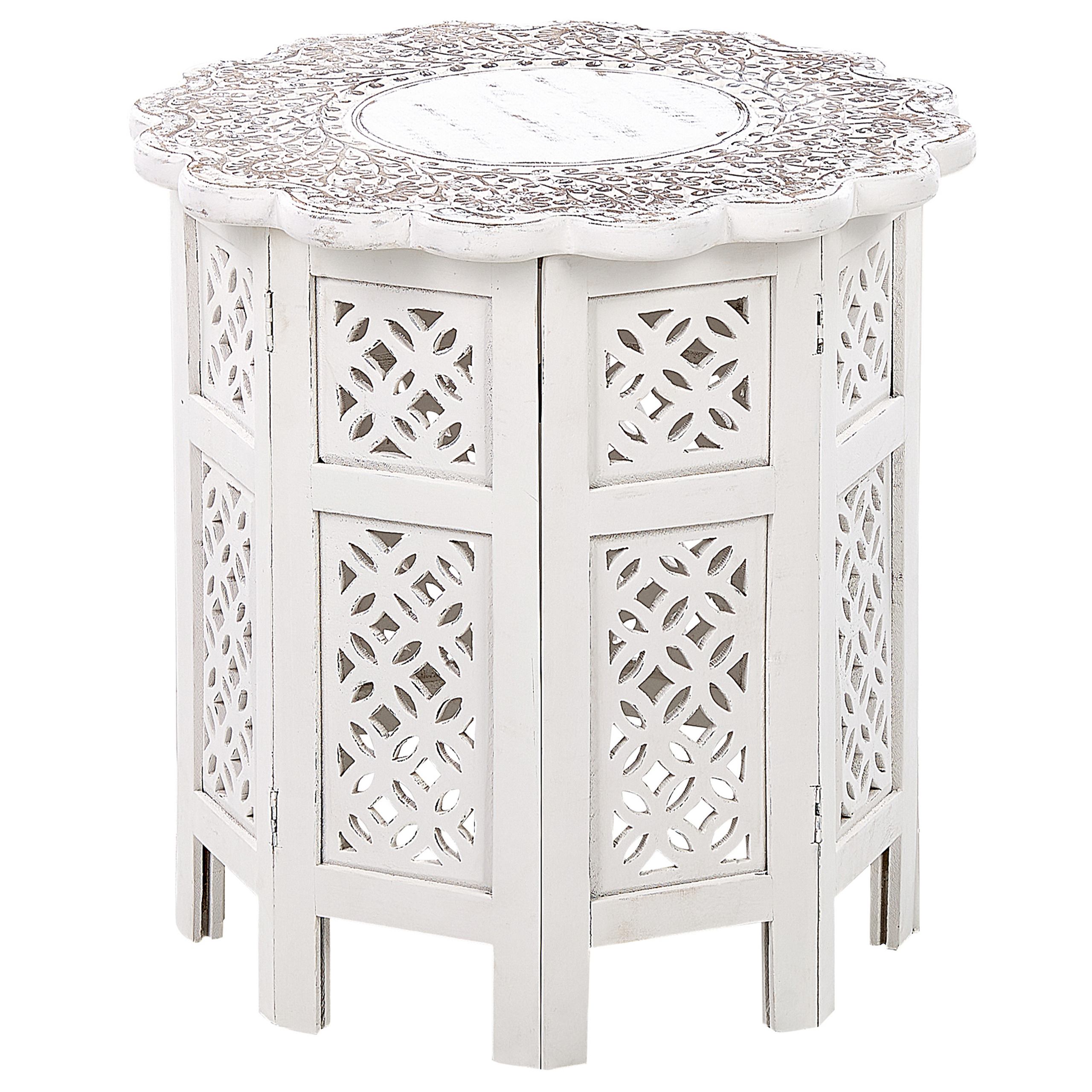 Marokkolaistyylinen sivupöytä. Tämä sivupöytä on ihastuttava koroste olohuoneeseesi. Luonnollisesta ja kestävästä mangopuusta valmistetussa pöydässä on ainutlaatuinen rakenne. Sekä pöytälevy että pääpaneelit on koristeltu taidokkaasti veistetyillä kuvioilla, jotka tuovat marokkolaista tunnelmaa sisustukseen. Haalistunut viimeistely korostaa sivupöydän kuviointia kauniisti. Aseta sivupöytä eteiseen ja koristele se pöytävalaisimella tai kasveilla tai sijoita se olohuoneen sohvan viereen, jolloin voit laskea sille kahvikuppisi tai kirjasi sohvalla rentoutuessasi.
