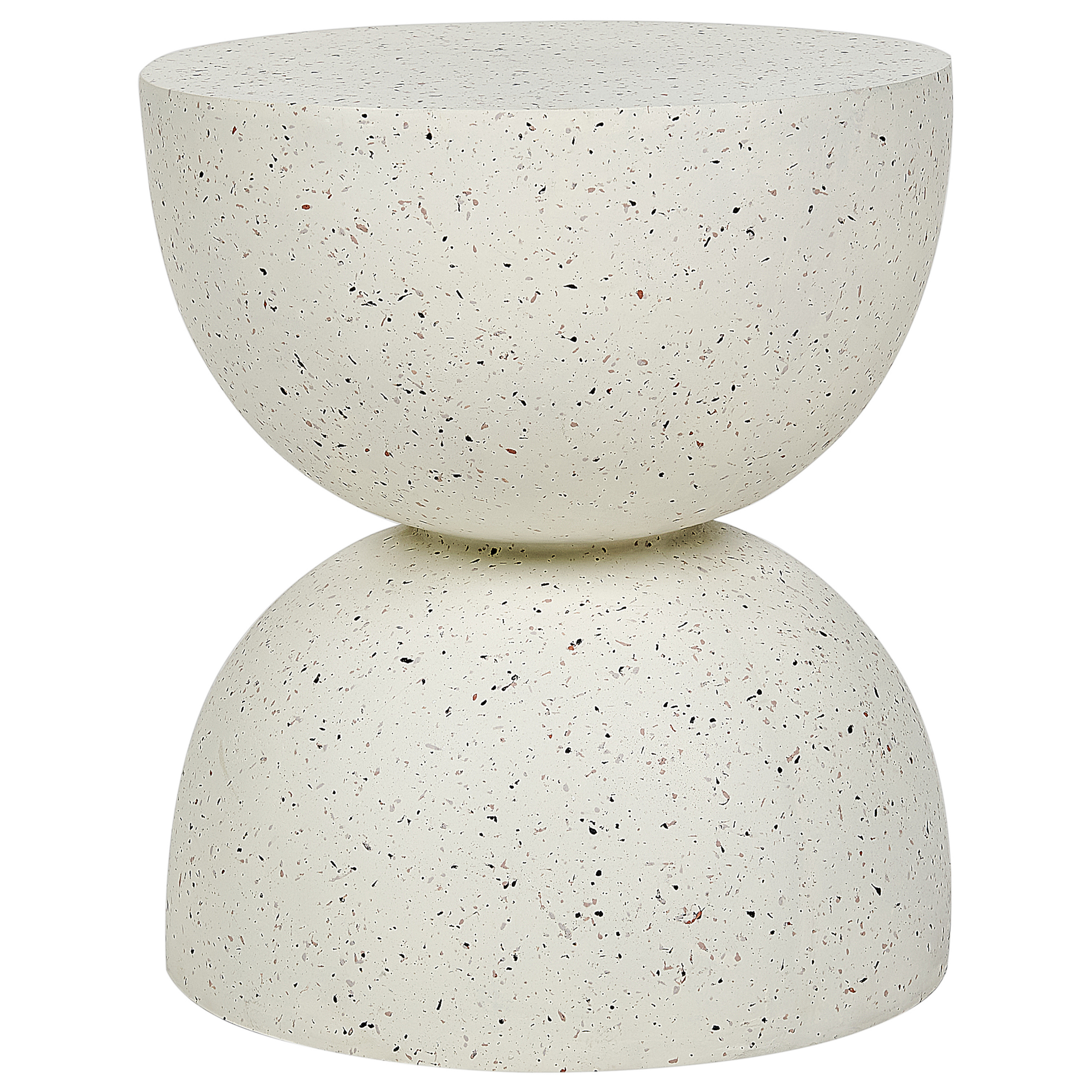 Tiimalasin muotoinen pieni pöytä. Kohota sisätilojen tai puutarhan ilmettä tällä poikkeuksellisella sivupöydällä. Se on valmistettu sääolosuhteita kestävistä materiaaleista ja sopii täydellisesti sekä sisä- että ulkokäyttöön. Sen koristeellinen terrazzo-kuviointi lisää trendikkyyttä sisustukseesi, kun taas sen yksinkertainen muoto sopii tilaan kuin tilaan.